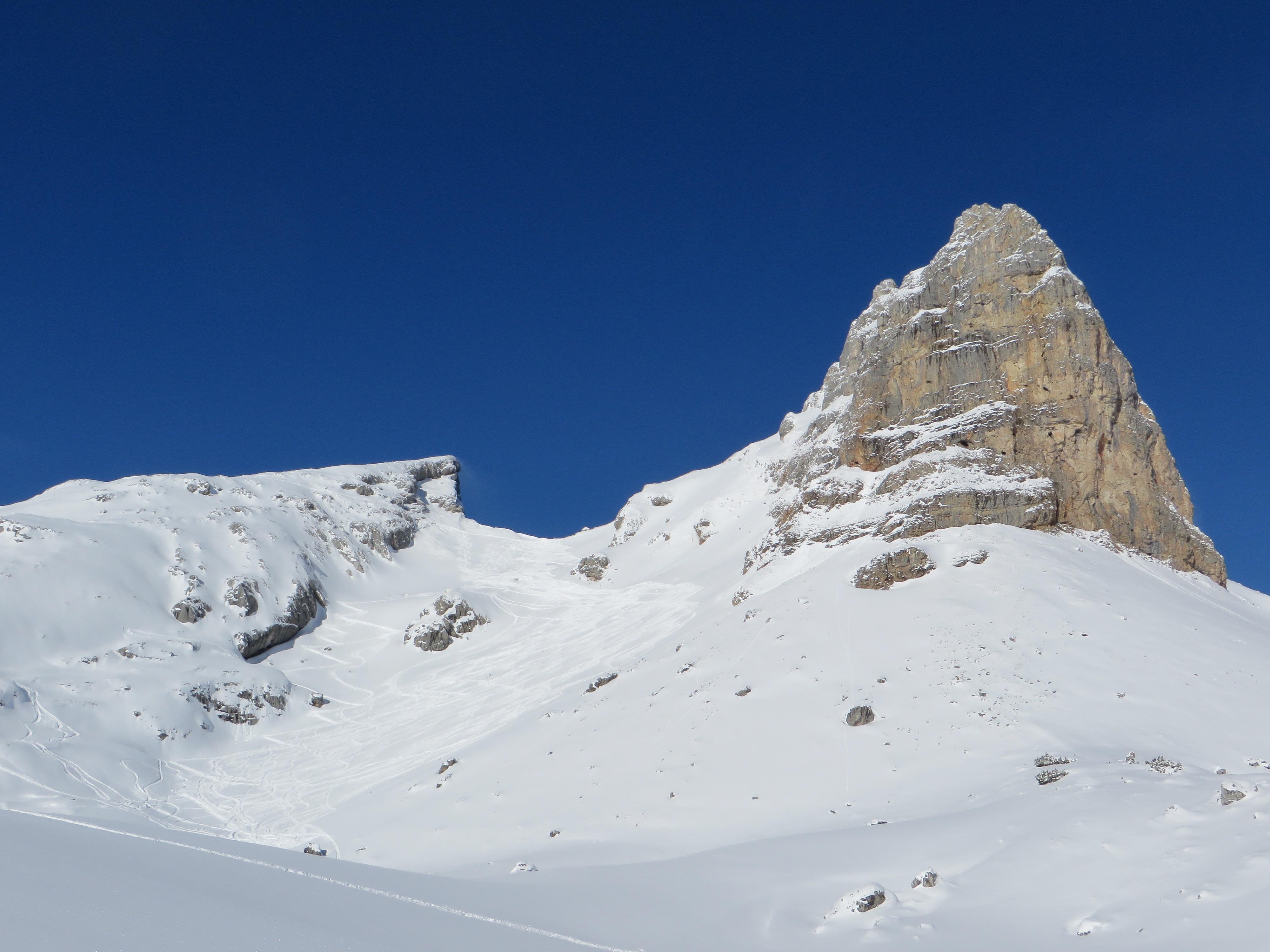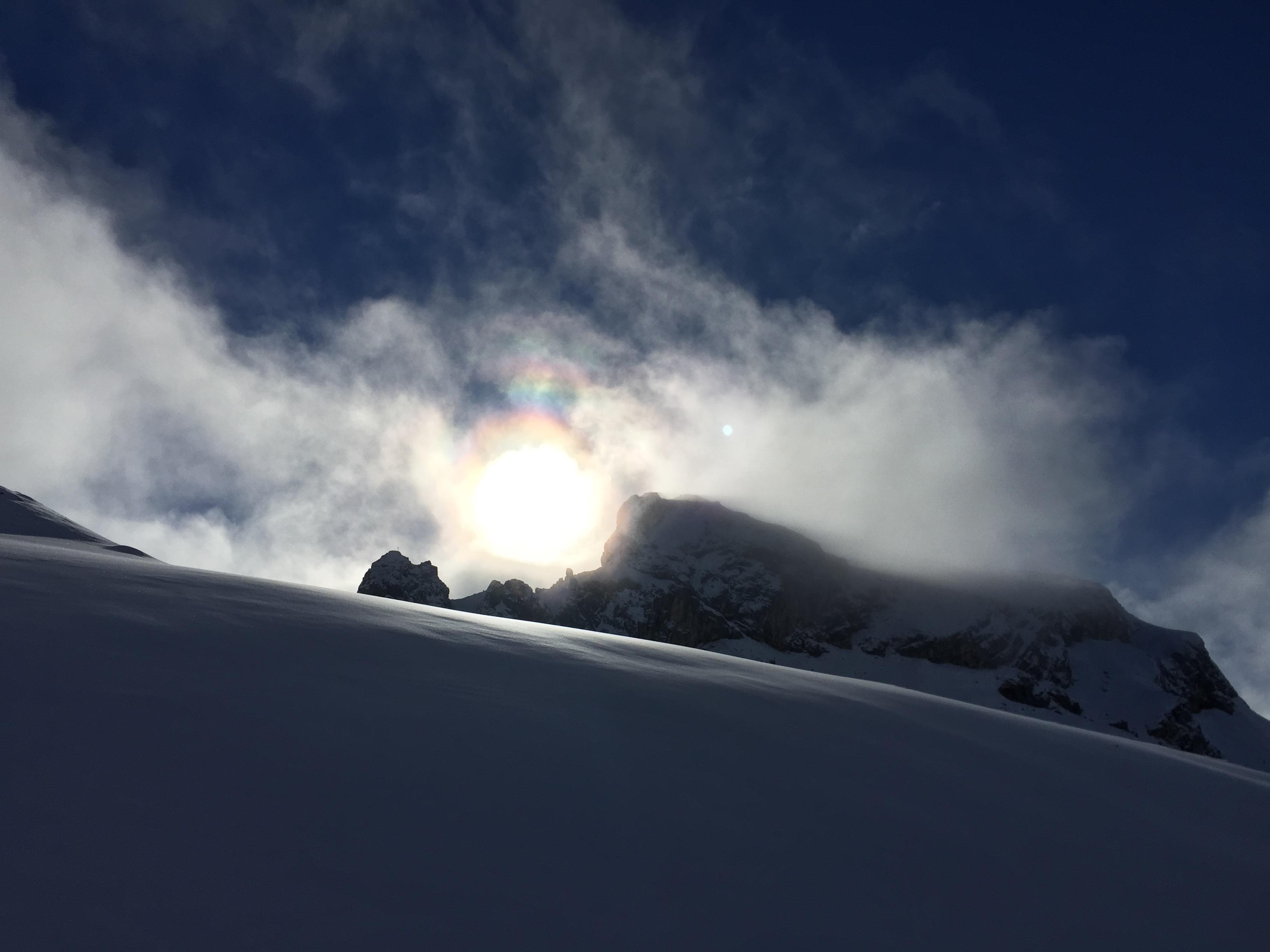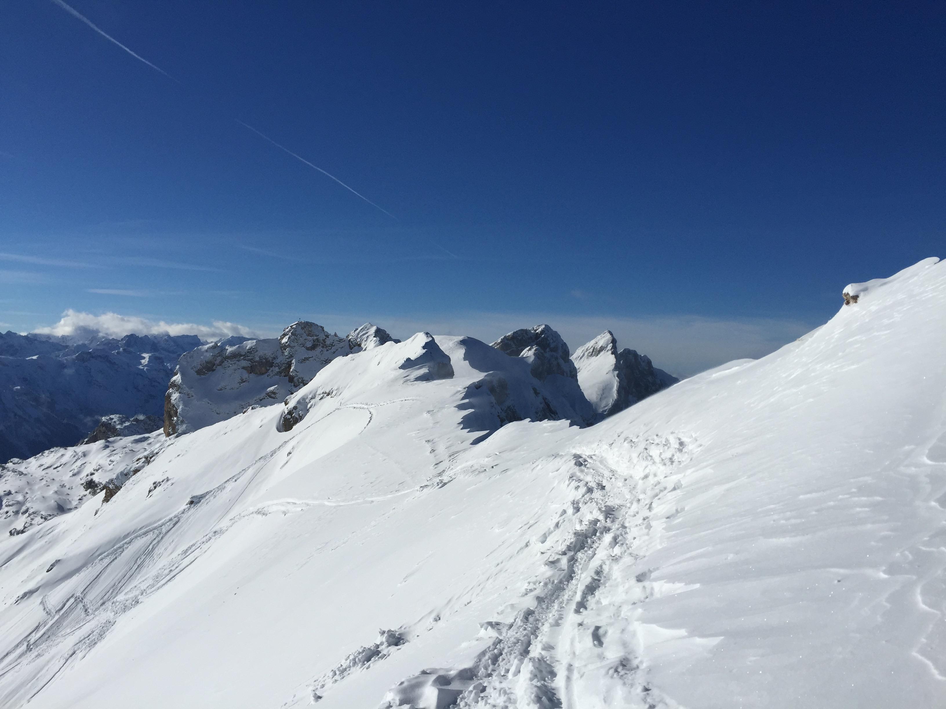 Auf etwa 15 cm frischem Pulverschnee und drunter Altschnee in variabler und insgesamt geringer Höhe im wechselnden Lichtspiel zur Rofanspitze, der Gipfelhang wegen fehlendem Schneefundament etwas unangenehm zu gehen, am Gipfel stürmisch mit deutlichen Schneefahnen und eiskalt, dafür ein phänomenales Panorama in alle Richtungen.