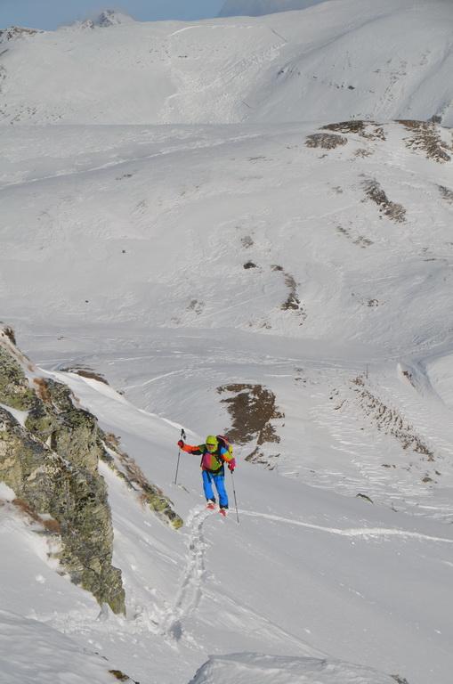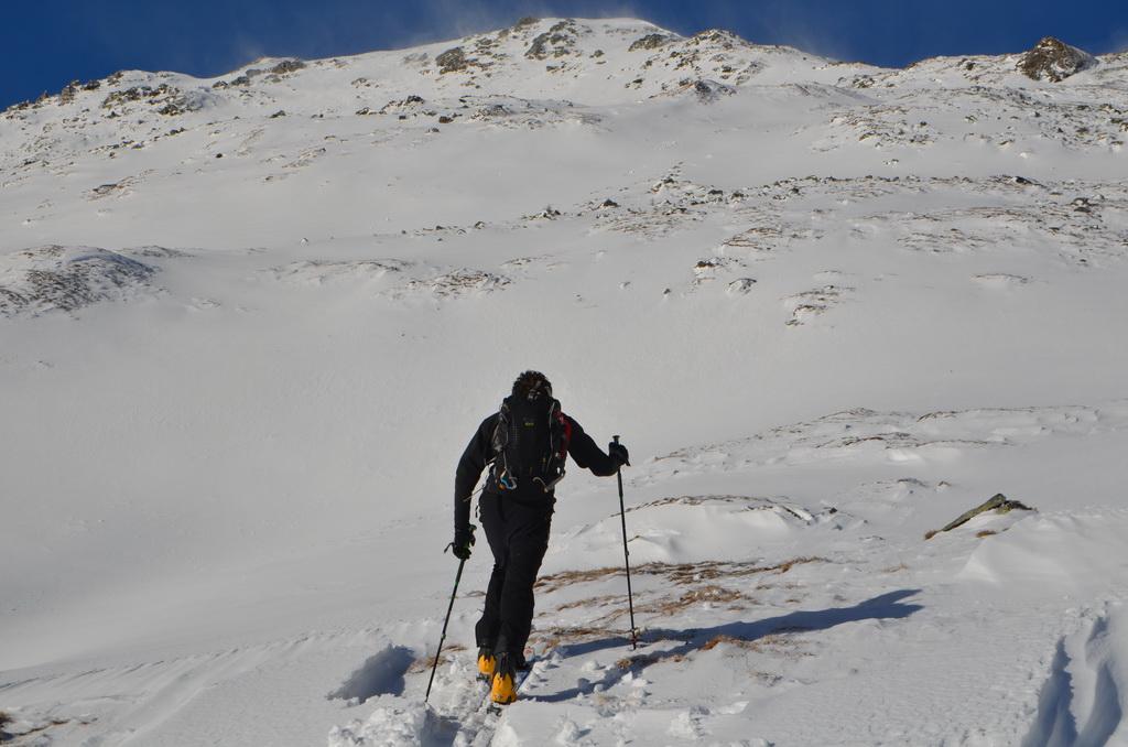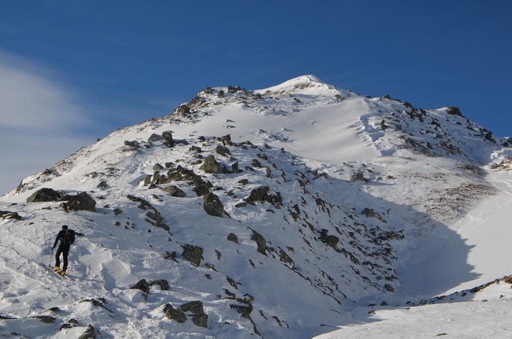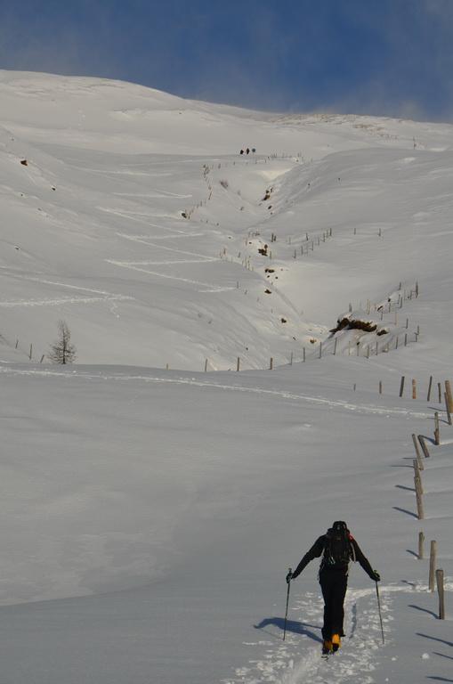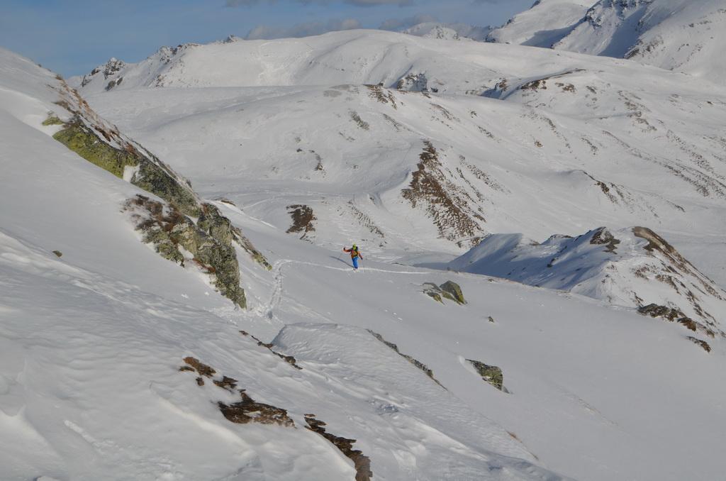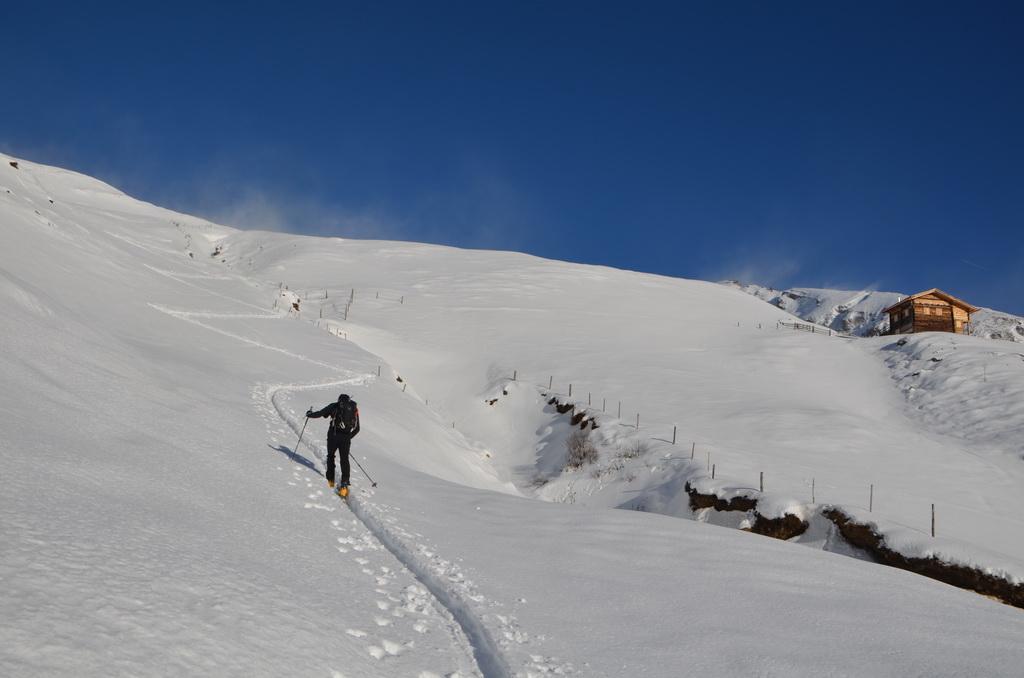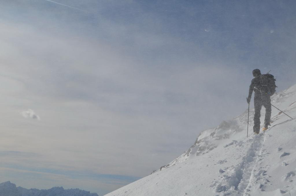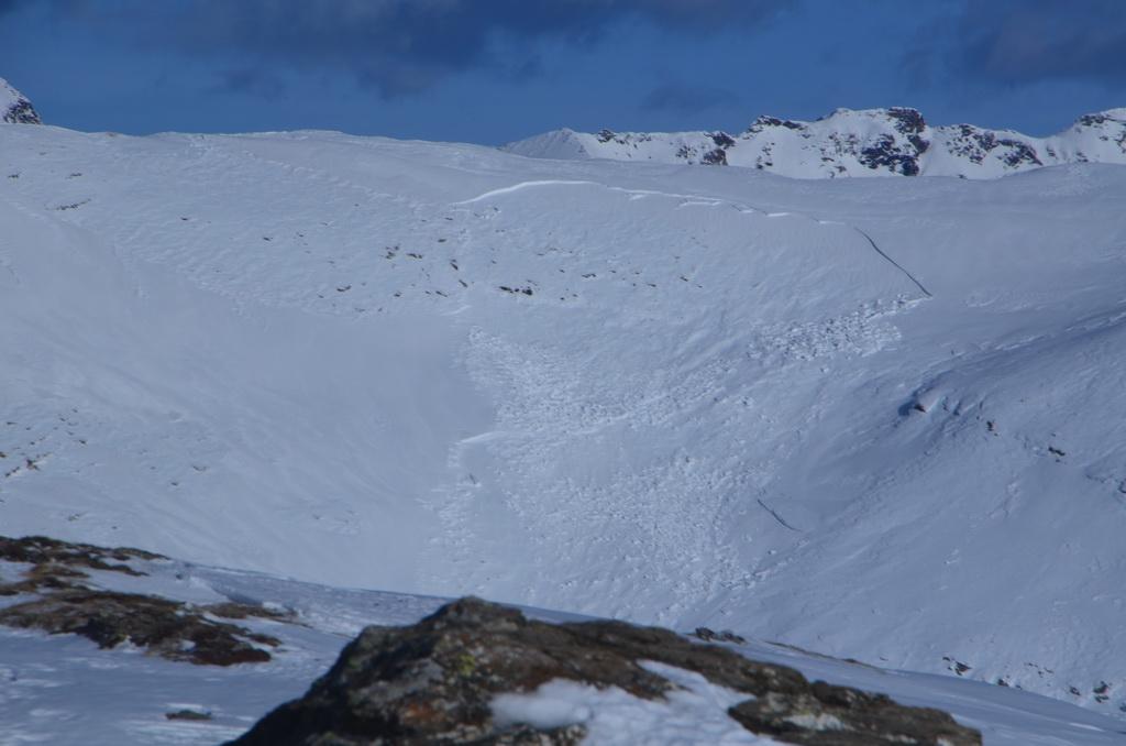 Heute waren wir bei stürmischen Verhältnissen im Tourengebiet Asten unterwegs. Von Freitag auf Samstag gab es hier etwas Neuschnee (anscheinend im Vorfeld etwas Graupel), der aufgrund der heutigen Temperaturen aber schon ziemlich nass war. Mit steigender Höhe wurde der Schnee zwar trockener, allerdings wurde er dort dafür stark verfrachtet. Zur Zeit kann man die eingewehten Stellen gut ausmachen und auch umgehen. In steilem Gelände konnten wir eine Selbstauslösungen beobachten. Im Flachen haben wir einen längeren Riss erkannt, welcher an dieser Stelle aufgrund der geringen Hangneigung allerdings nicht relevant sein dürfte.