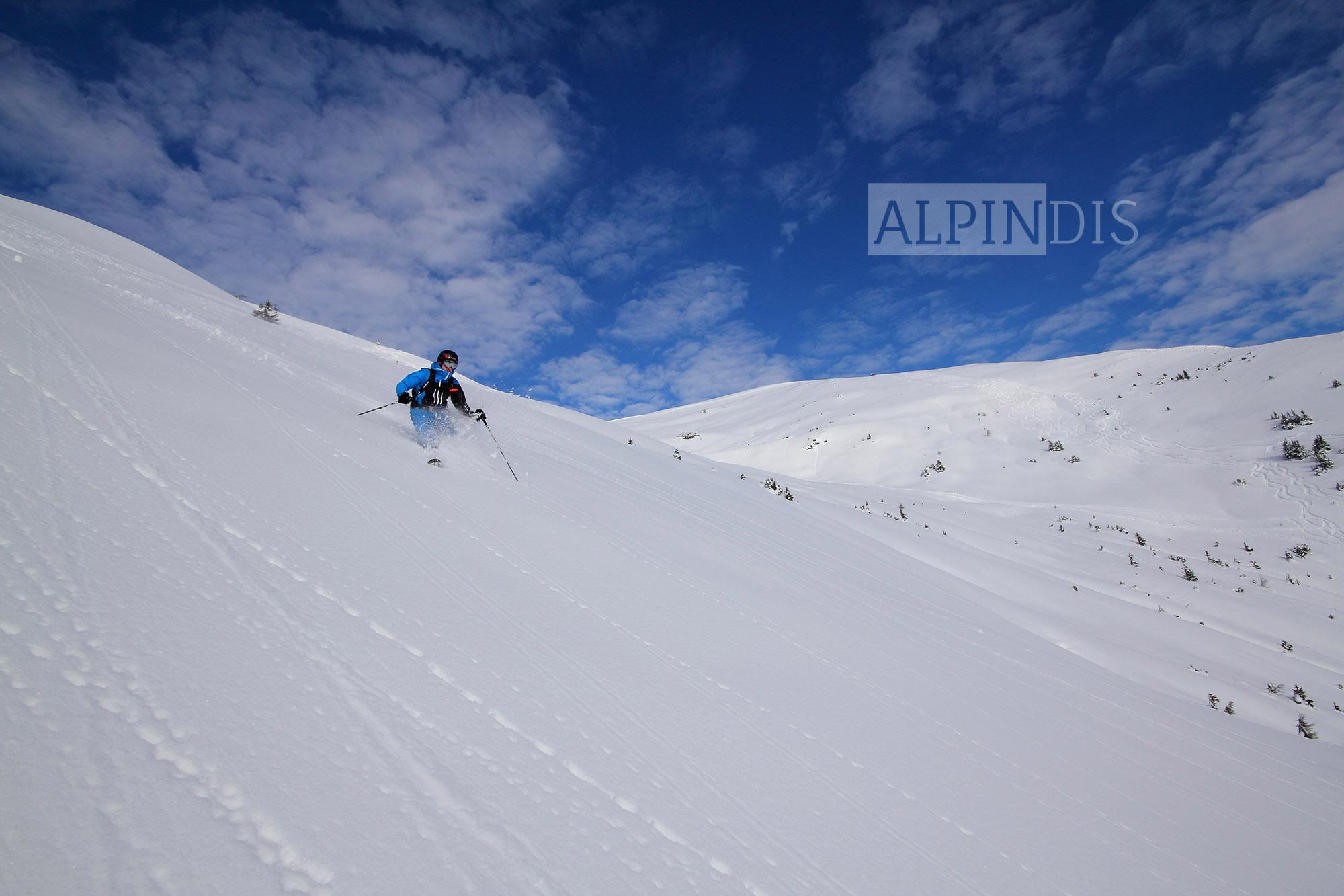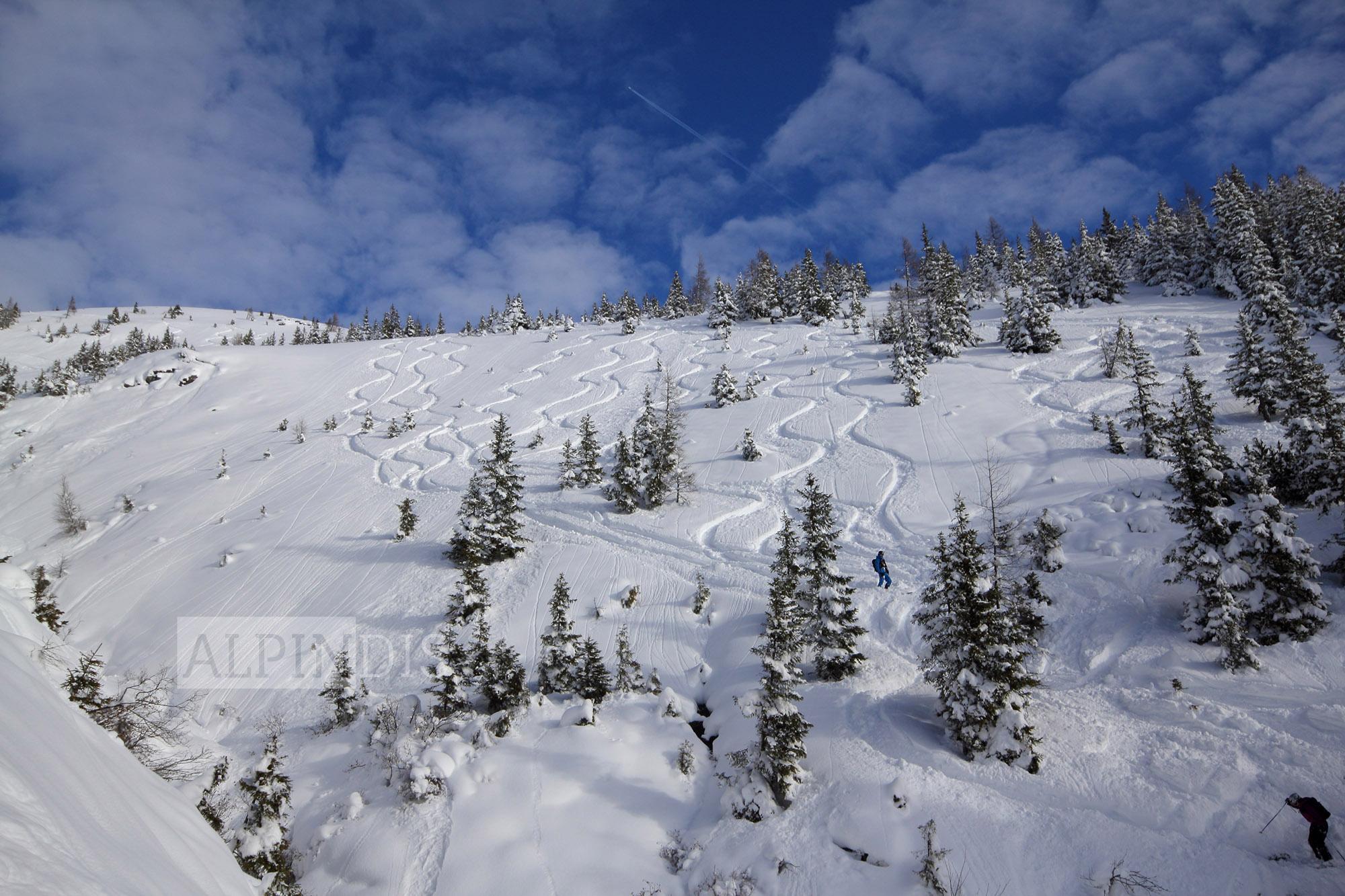 Heute war es windstill, der NW-Wind der letzten Schneefallperiode hinterließ aber kammnah deutliche Spuren: Kuppen abgeweht, Einwehungen im Süd bis Südost-Sektor. Die abgewehten Bereiche sowie die Einweihungen wurden von einer dünnen Neuschneeauflage, welche am 31.12. nahezu ohne Windeinfluss gefallen ist, überdeckt und sind somit schwer zu erkennen. (Das rascheln unter den Schiern erinnert an die ungleichmäßige Schneeverteilung).