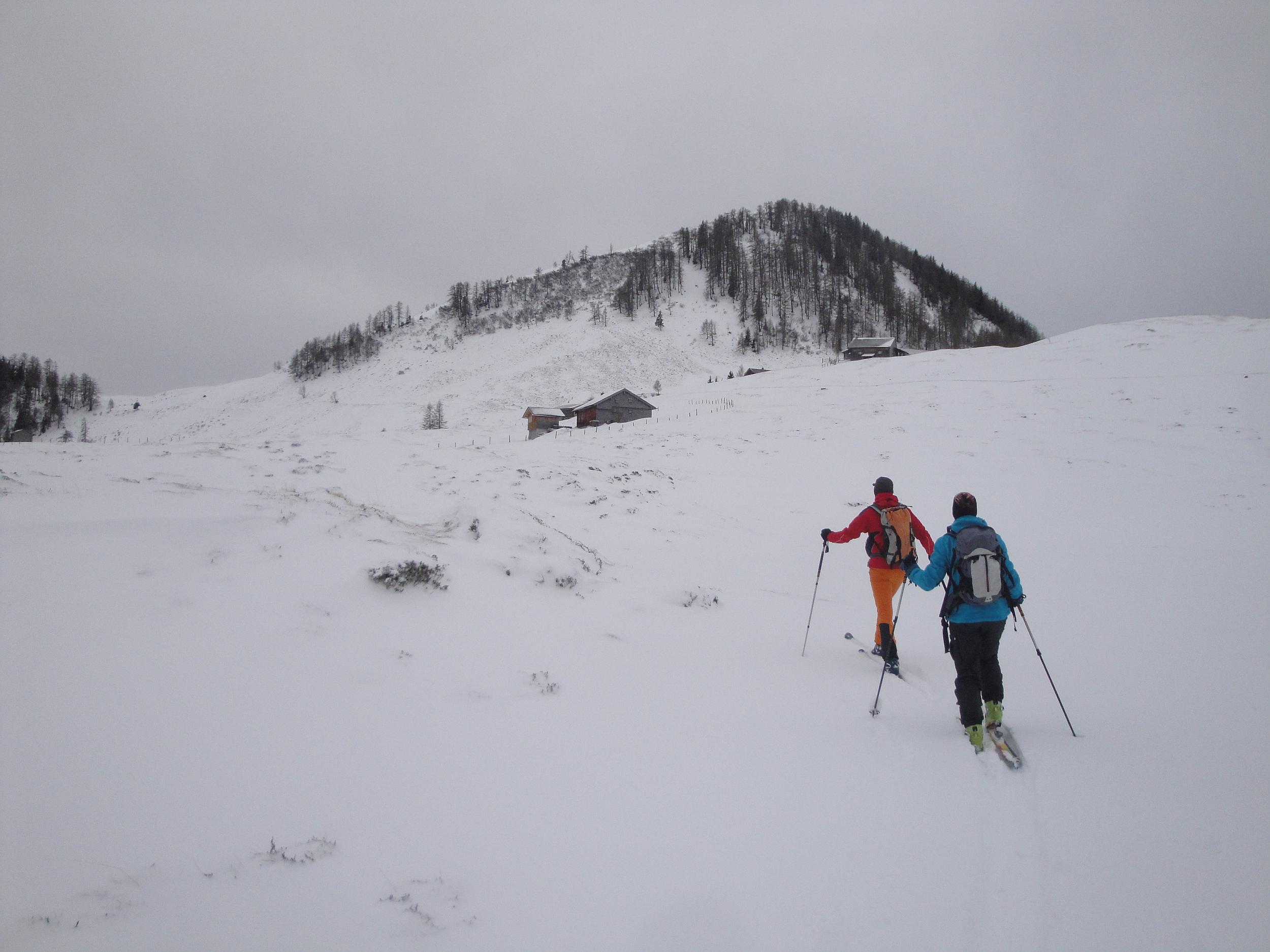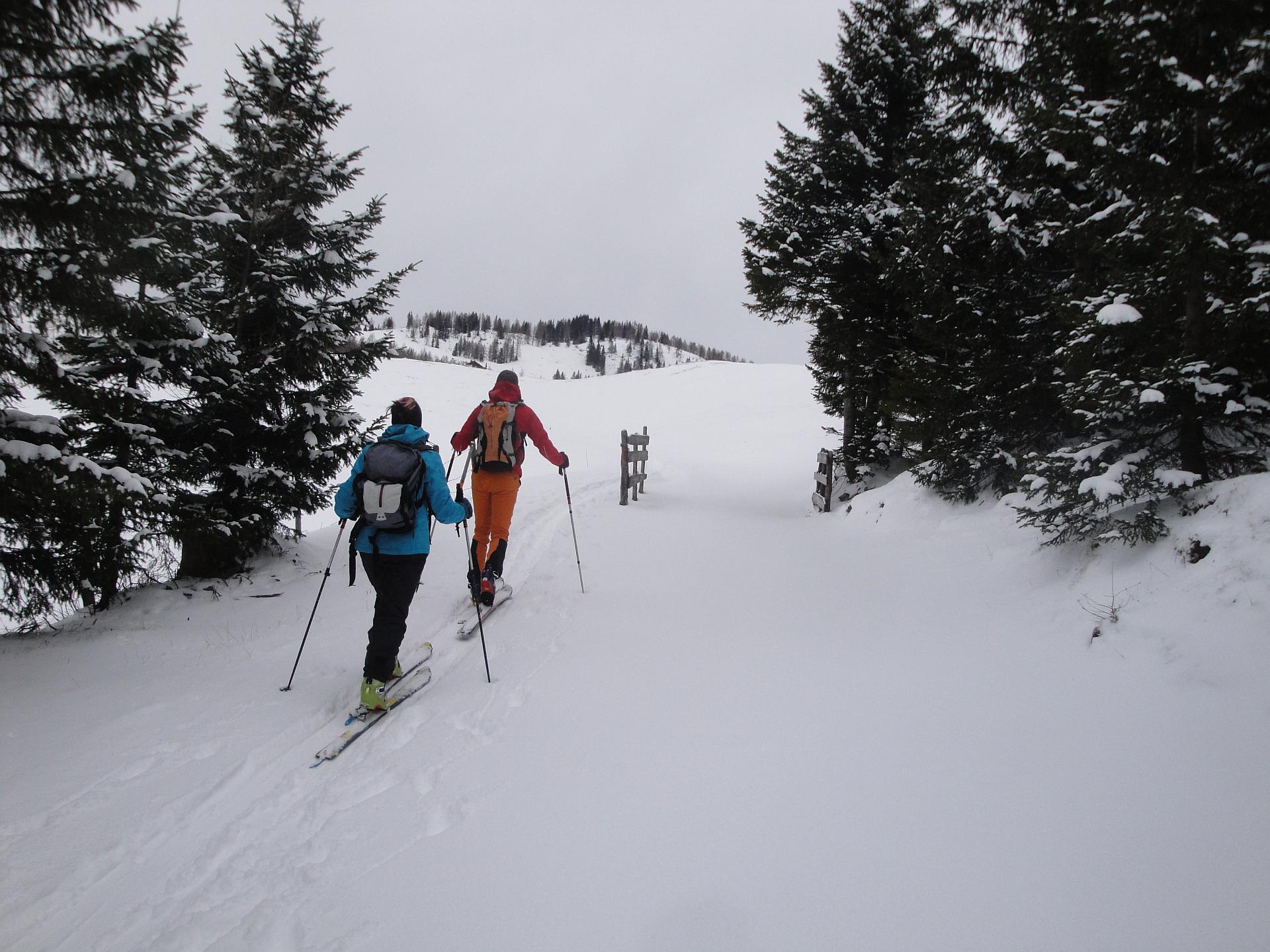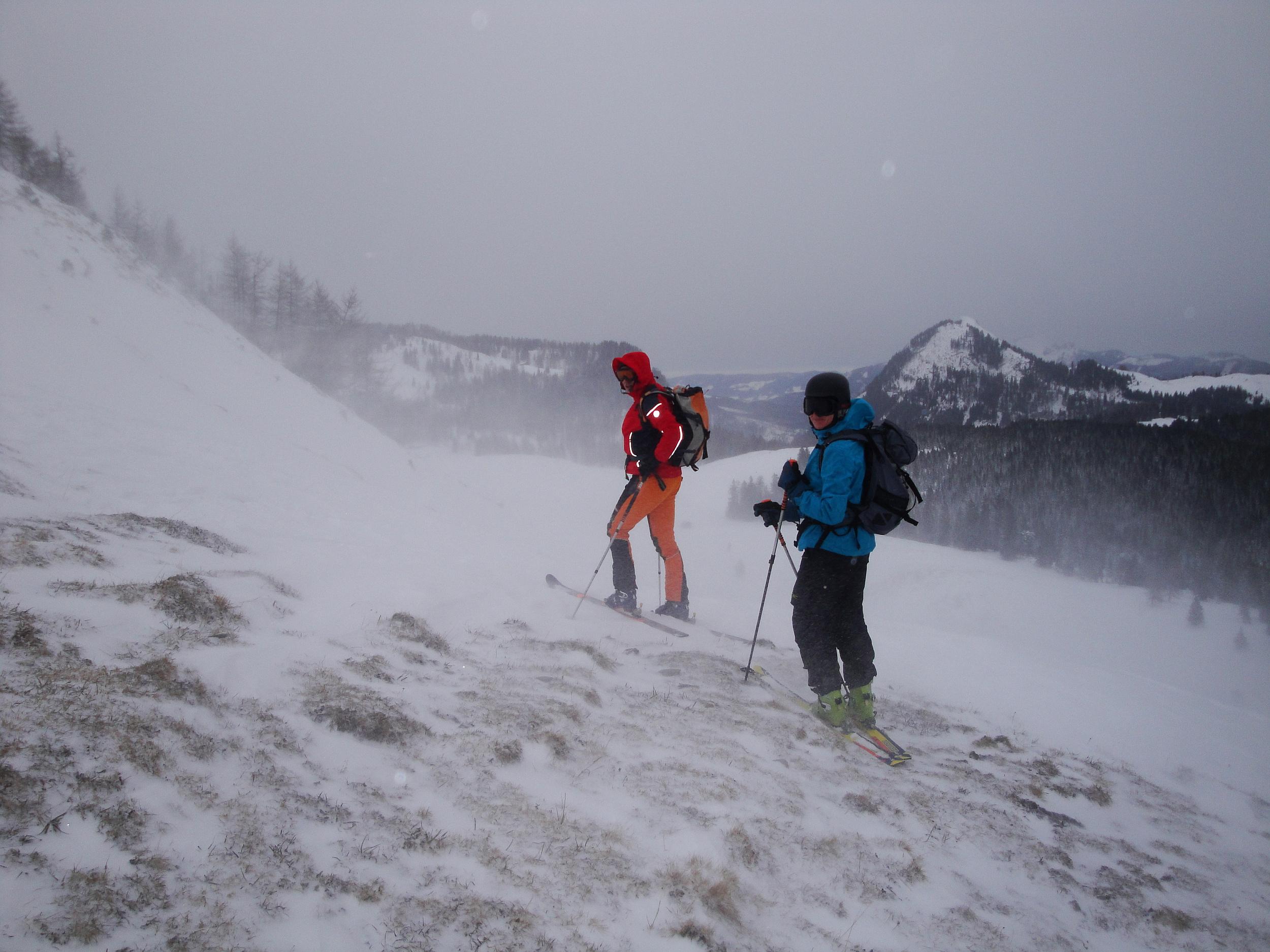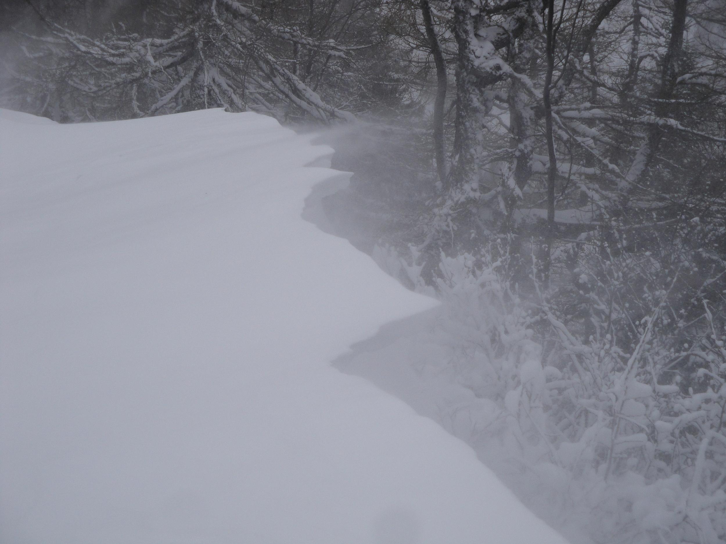 Nicht gerade besondere Verhältnisse auf der Postalm. Im Wald liegen etwa 20 bis 25 cm Schnee. In freien Lagen hat jedoch der Wind ganze Arbeit geleistet. Entweder liegt gar kein Schnee oder es gibt Triebschneepakete bis 70cm Höhe.