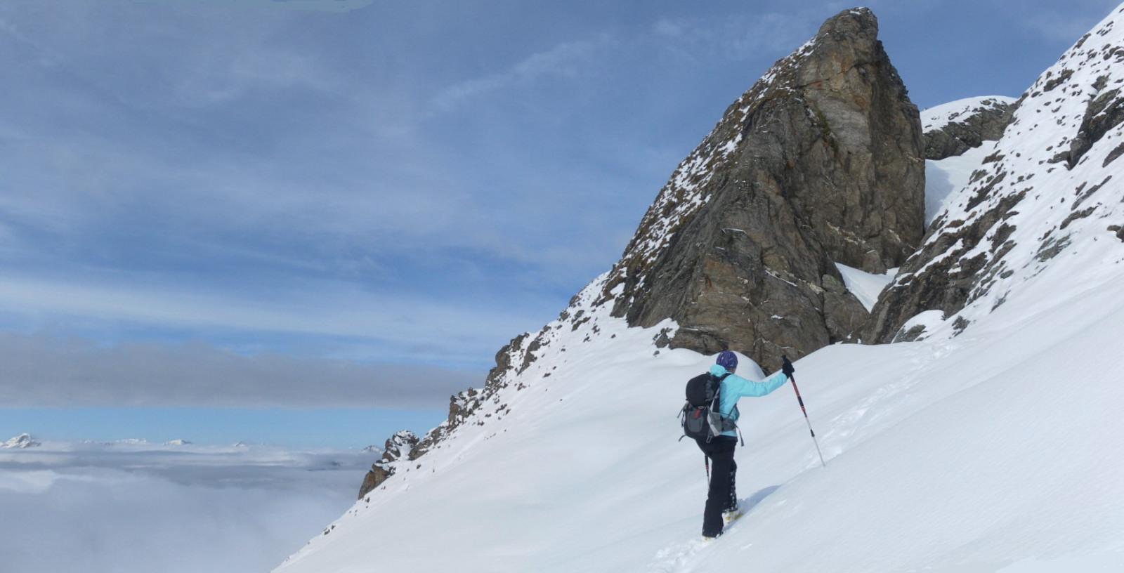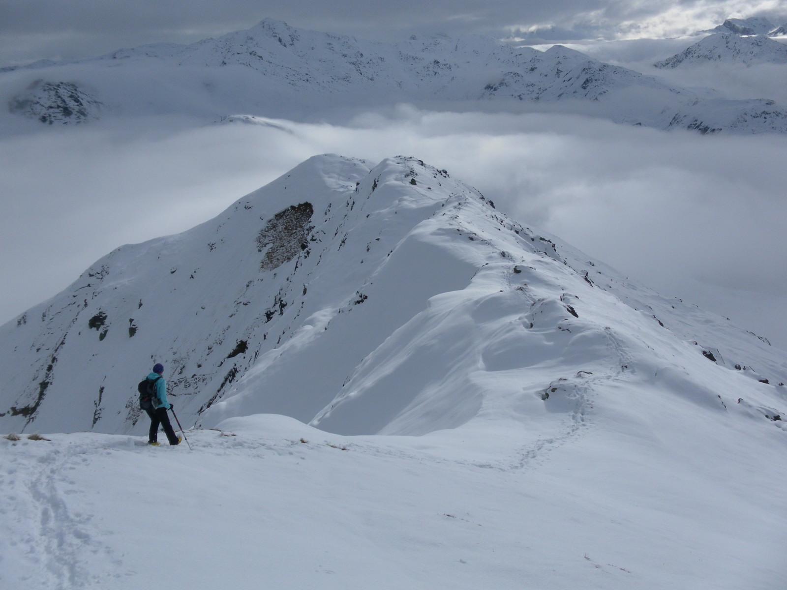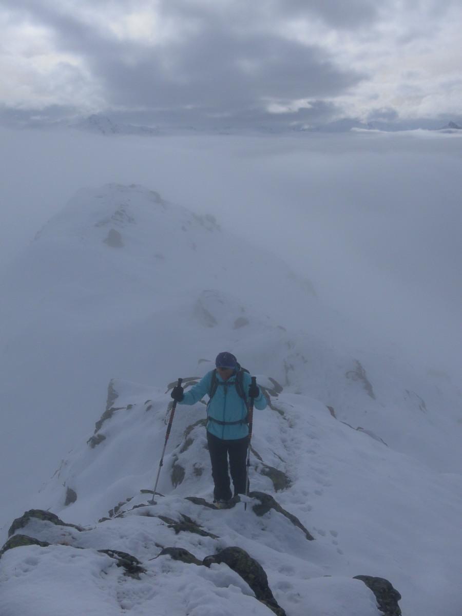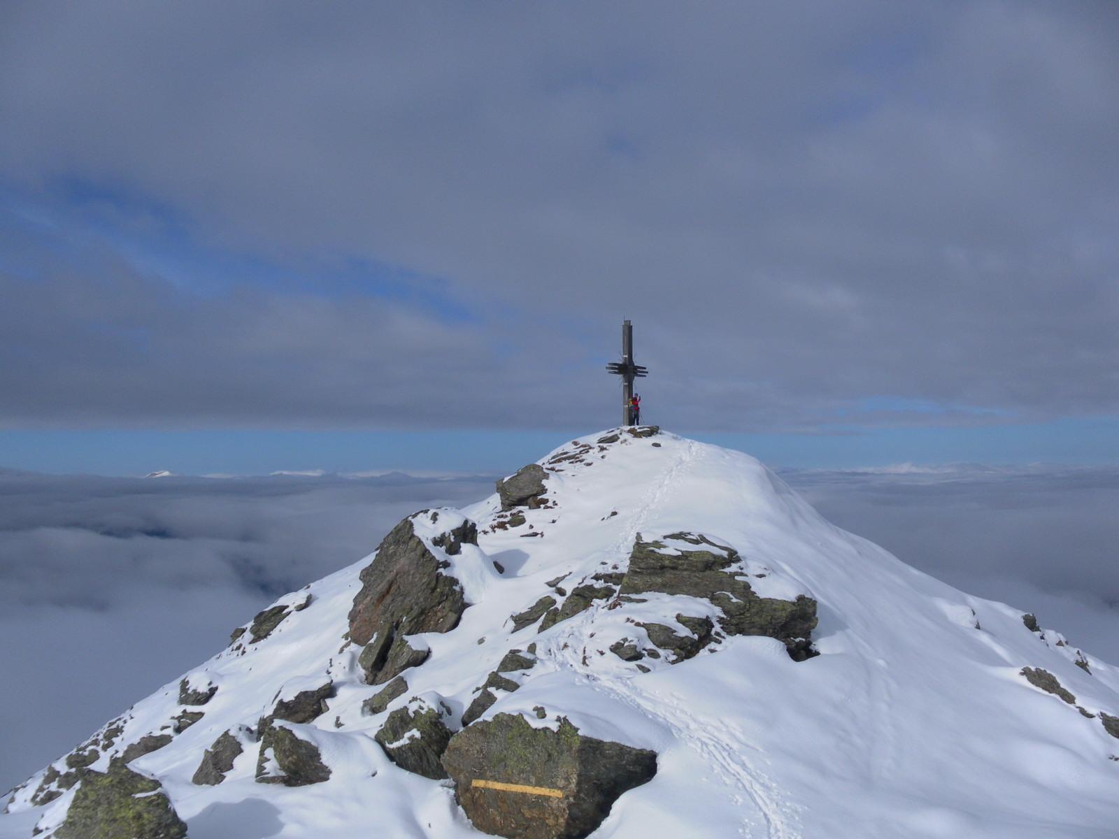 Das versprochene Schönwetter im Westen will sich erst spät zeigen. Der durchnässte Schnee im Pistenbereich schmilzt regelrecht unter den Füßen weg. Im freien Gelände erfreut uns fauliger Nassschnee bis zum Gipfel - am Kamm mit zarter Kruste.