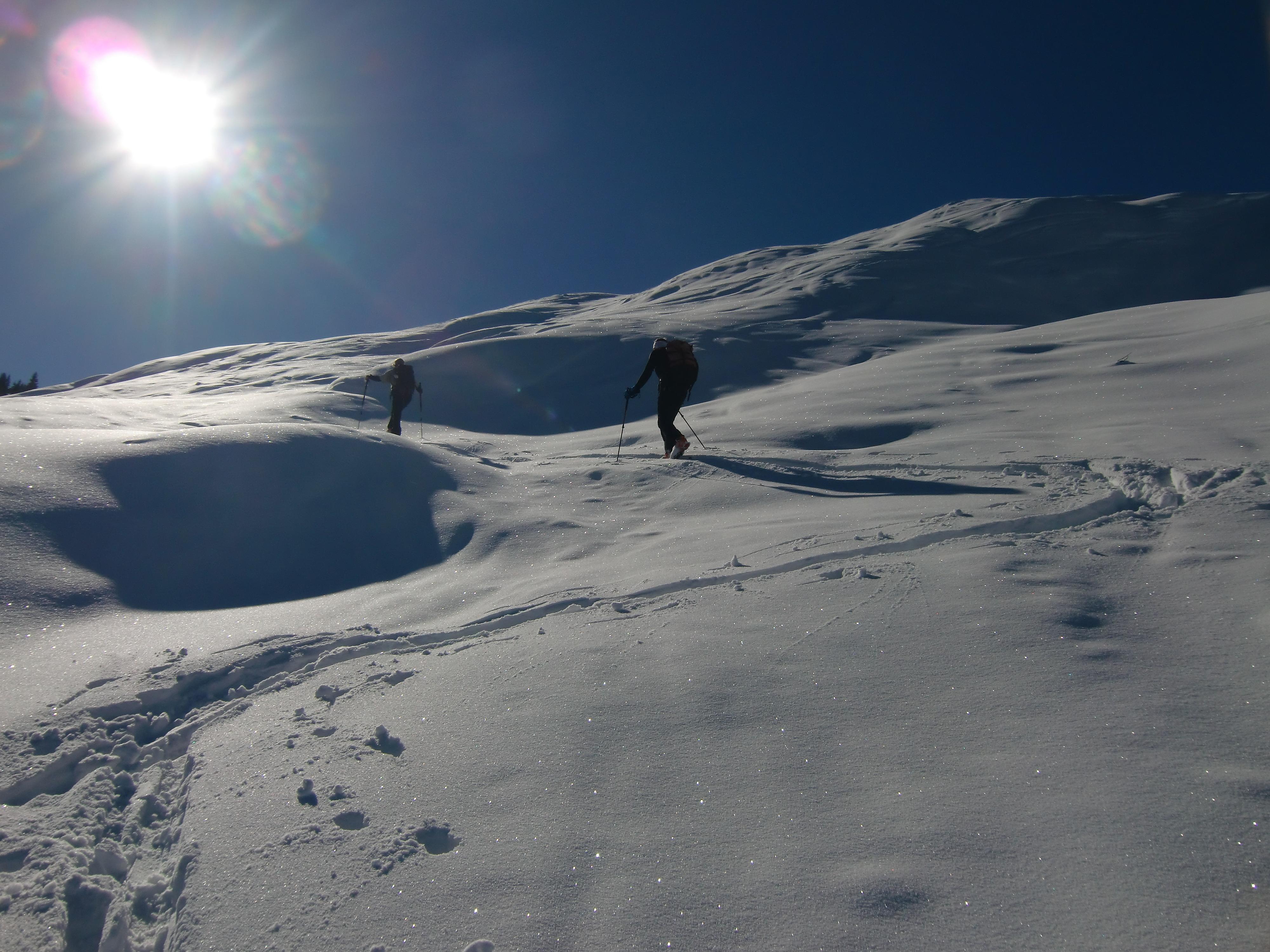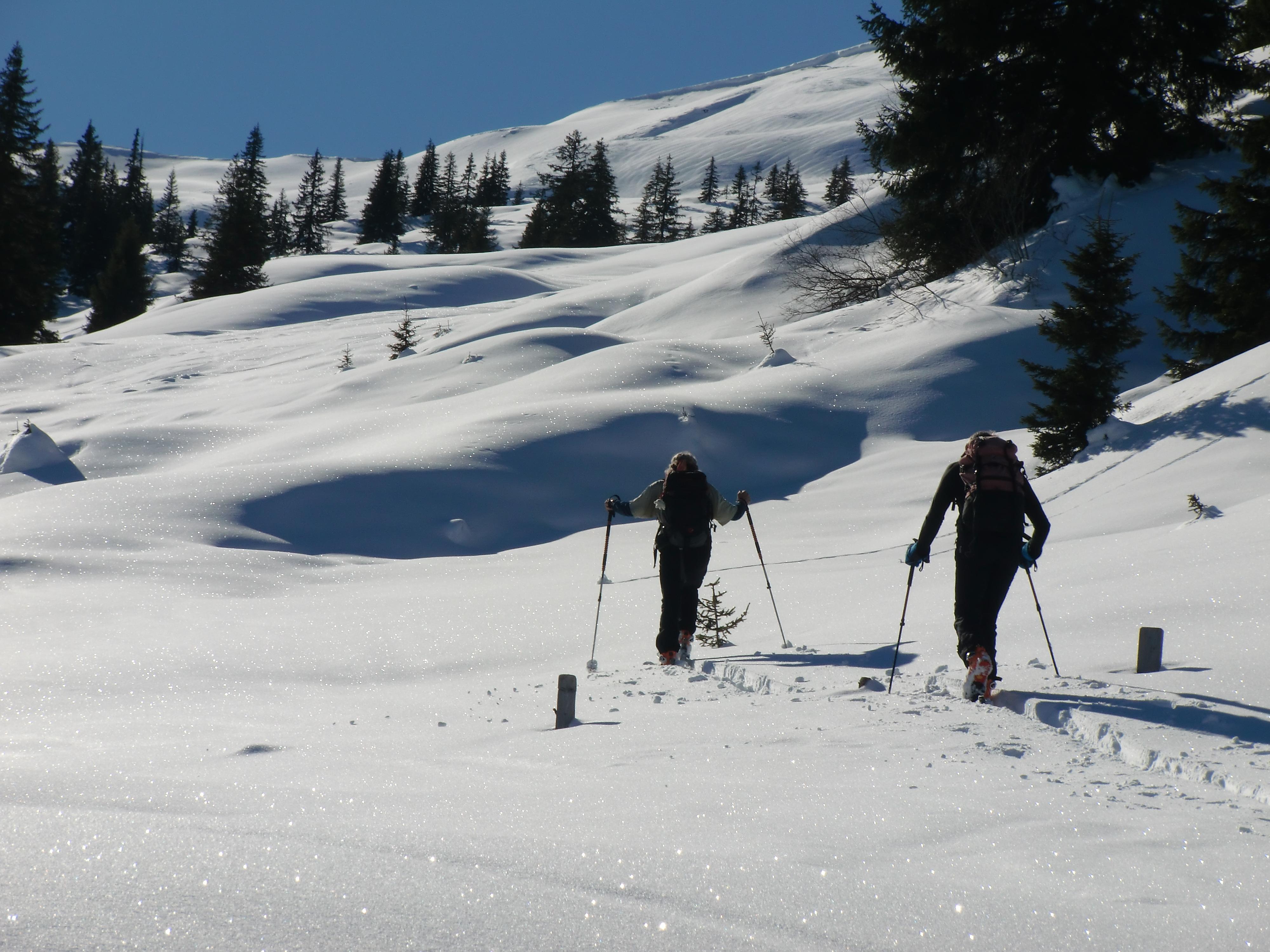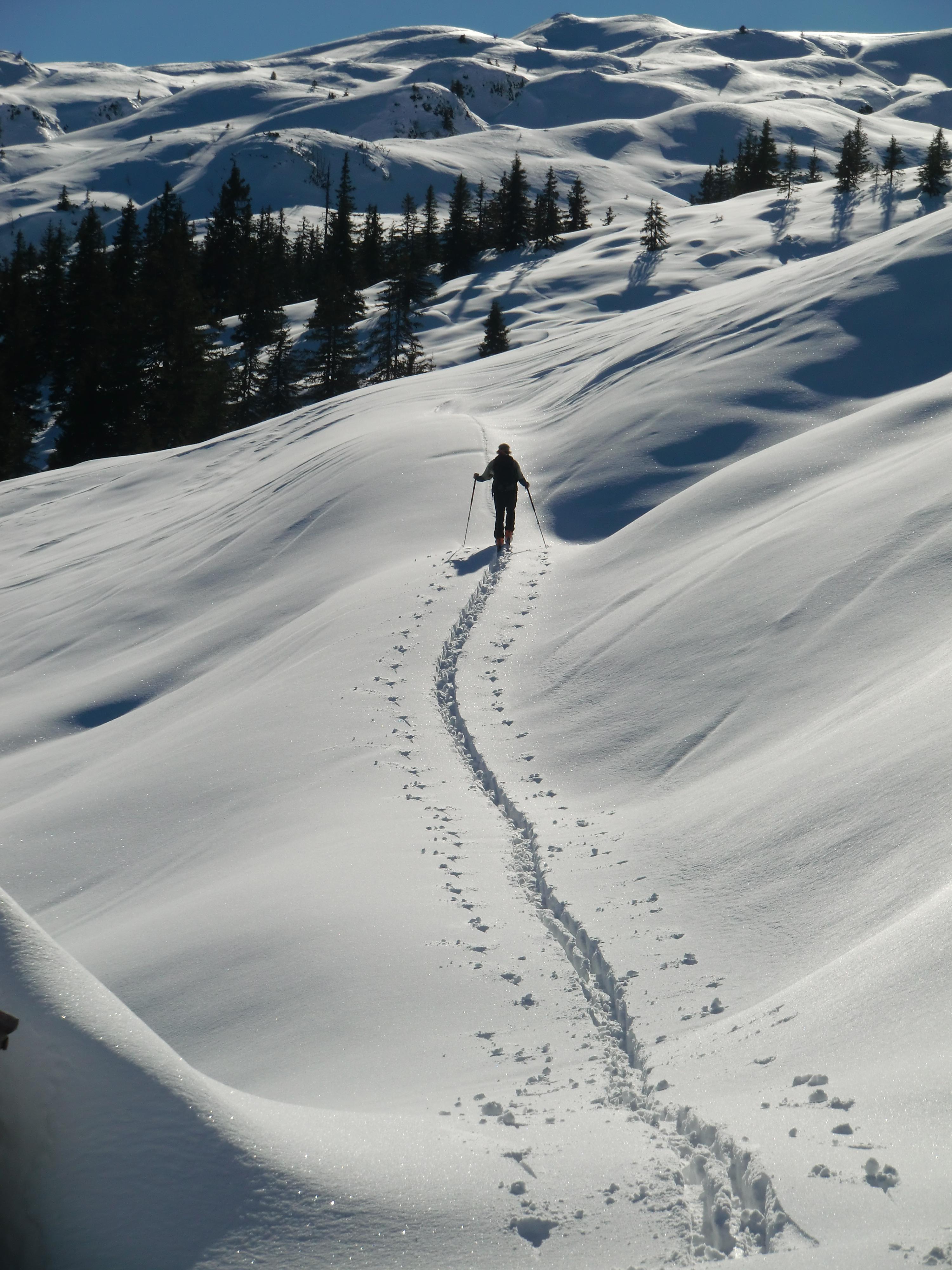 Lawinen: Auf dieser Trasse mangels Steilheit kein Thema. Im oberen Bereich (ab 1700m) aber stark windbehandelt, unter der 40cm-Neuschneeschicht ein fester Harschdeckel mit jeder Menge eingeschneitem Oberflächenreif, in steileren Bereichen durchaus noch ein Thema...