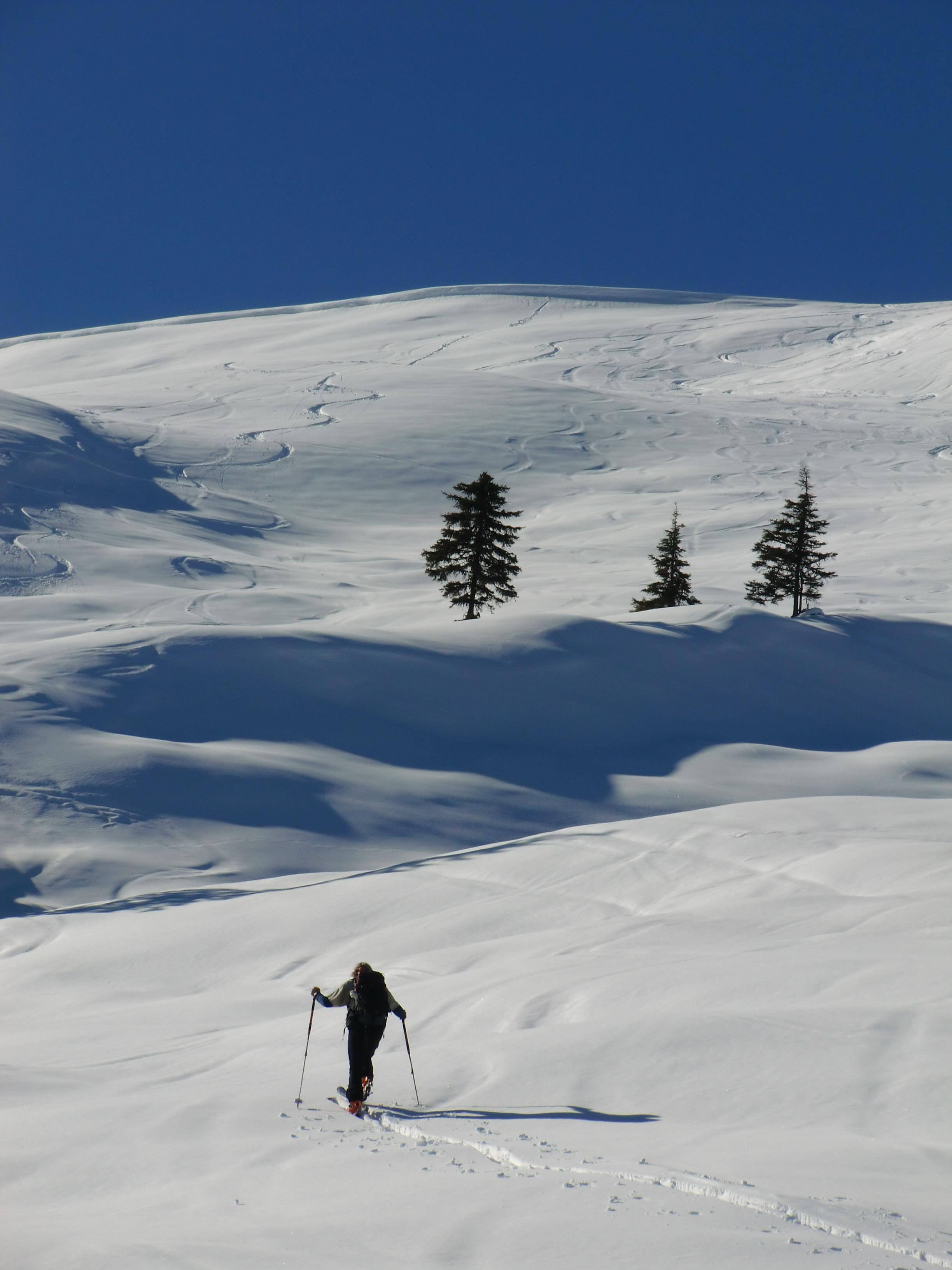 Fazit: Schnee wird in dieser Gegend rasch schlechter, wahrscheinlich nur noch in rein nordseitigen Hängen gut zu fahren. Schau ma morgen weiter...