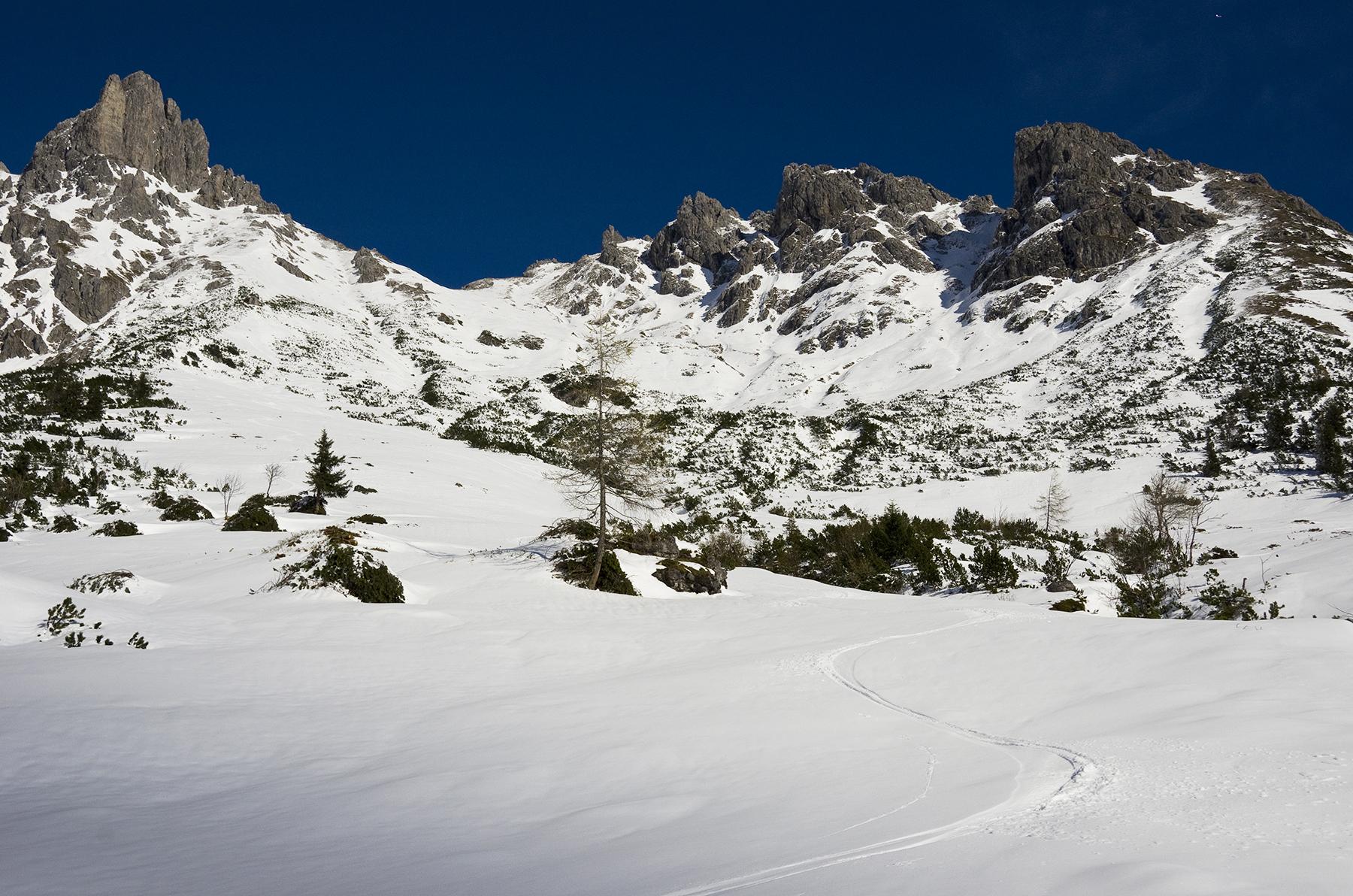 Kein Bruchharsch, sondern "Herbstfirn" in der Taghaubenscharte. Die Schneedecke ist fest! Beim Aufstieg (um die Mittagszeit) wären gar noch Harscheisen recht gewesen.