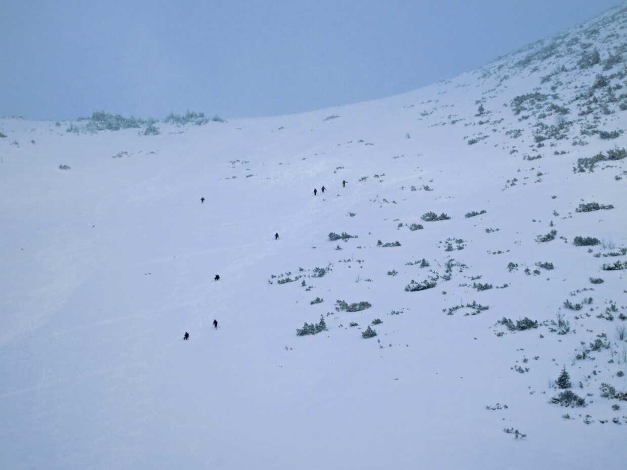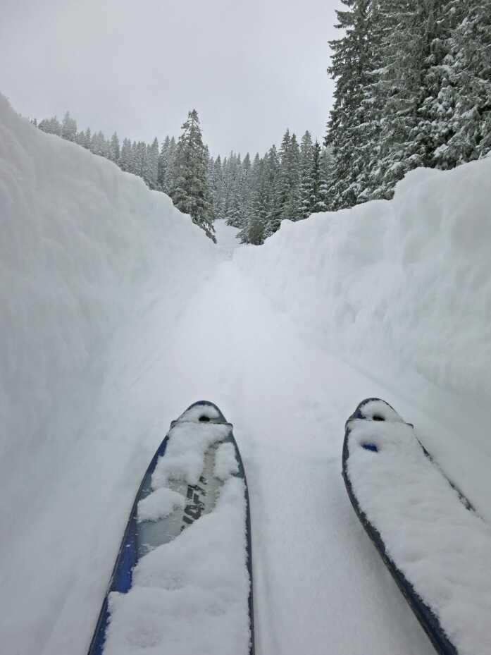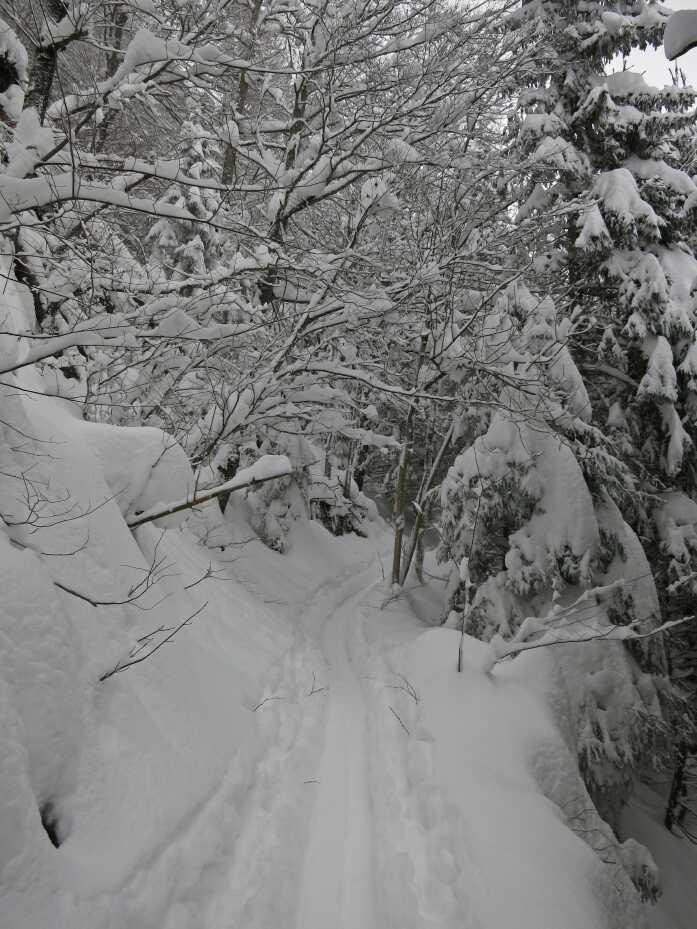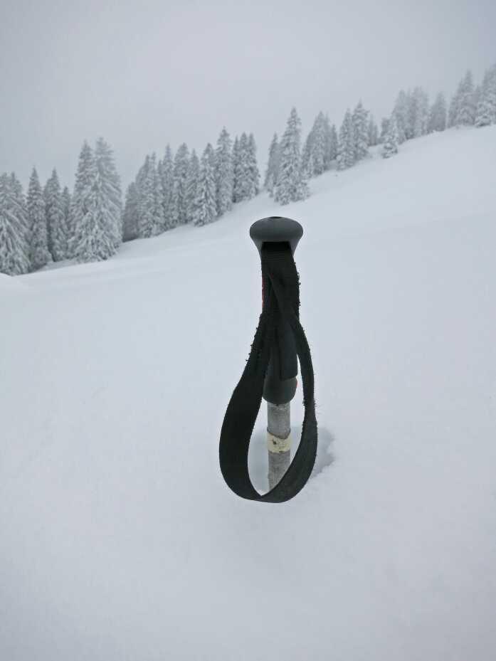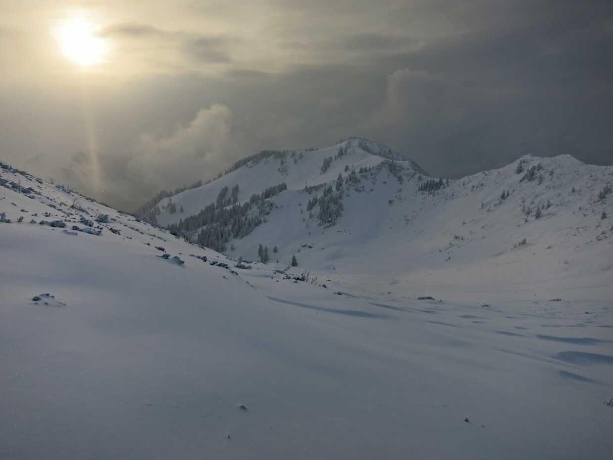 Schneelage: Nachdem Frau Holle den Winteranfang verpennt hat, scheint sie jetzt alles nachholen zu wollen. Im Tal liegen ca. 50-60cm Pulverschnee, oben unterschiedliche Schneehöhen, in windgeschützten Lagen bis über 1m, sonst ca.60-80cm. Leider alles ziemlich grundloser Pulverschnee mit sehr hohen Einsinktiefen und manchmal kaum mehr zu spuren. Die Abfahrten erfolgten mit normalen Tourenski meist in Schussfahrt und da musste oft noch geschoben werden, also nicht gerade berauschende Verhältnisse.