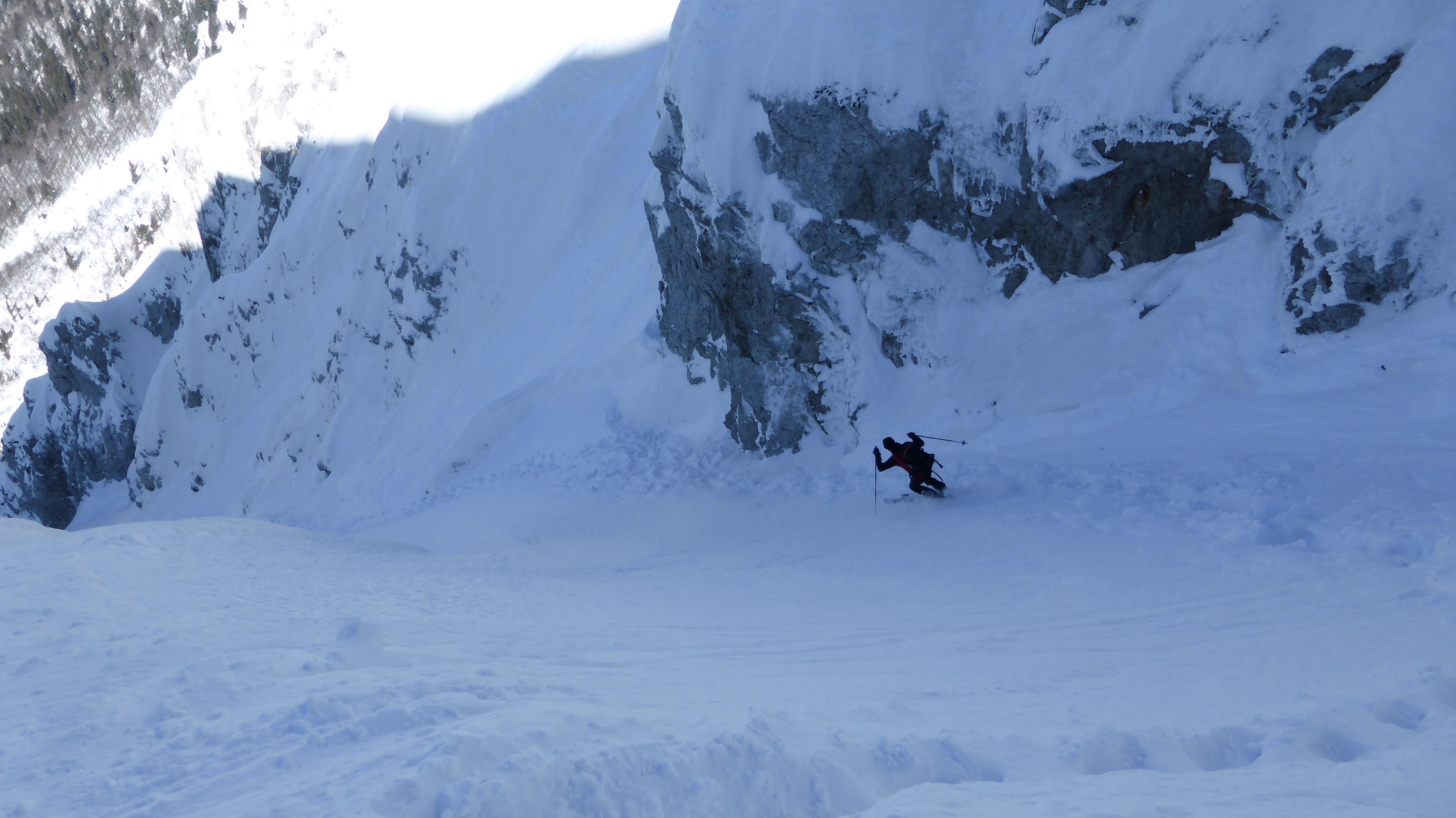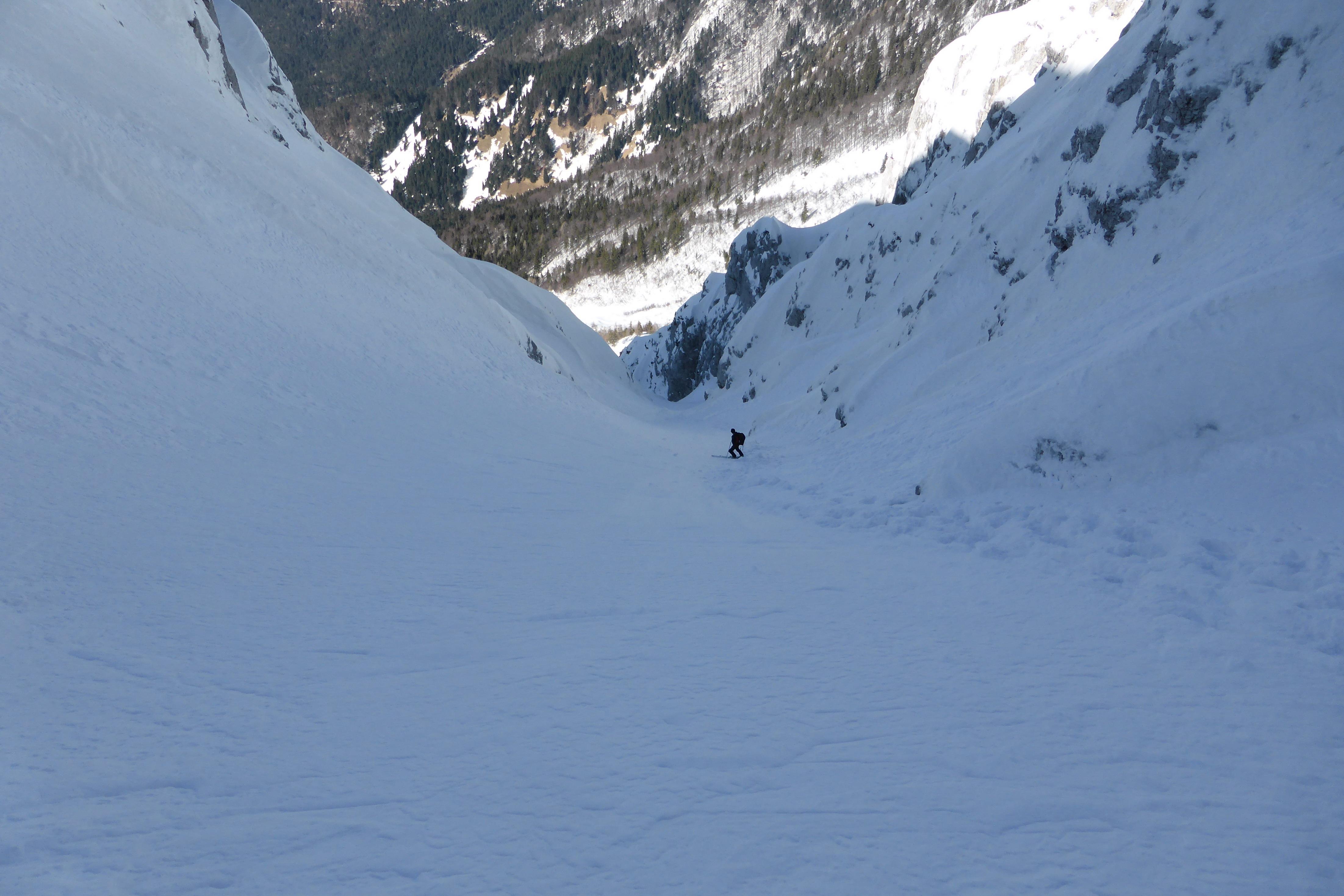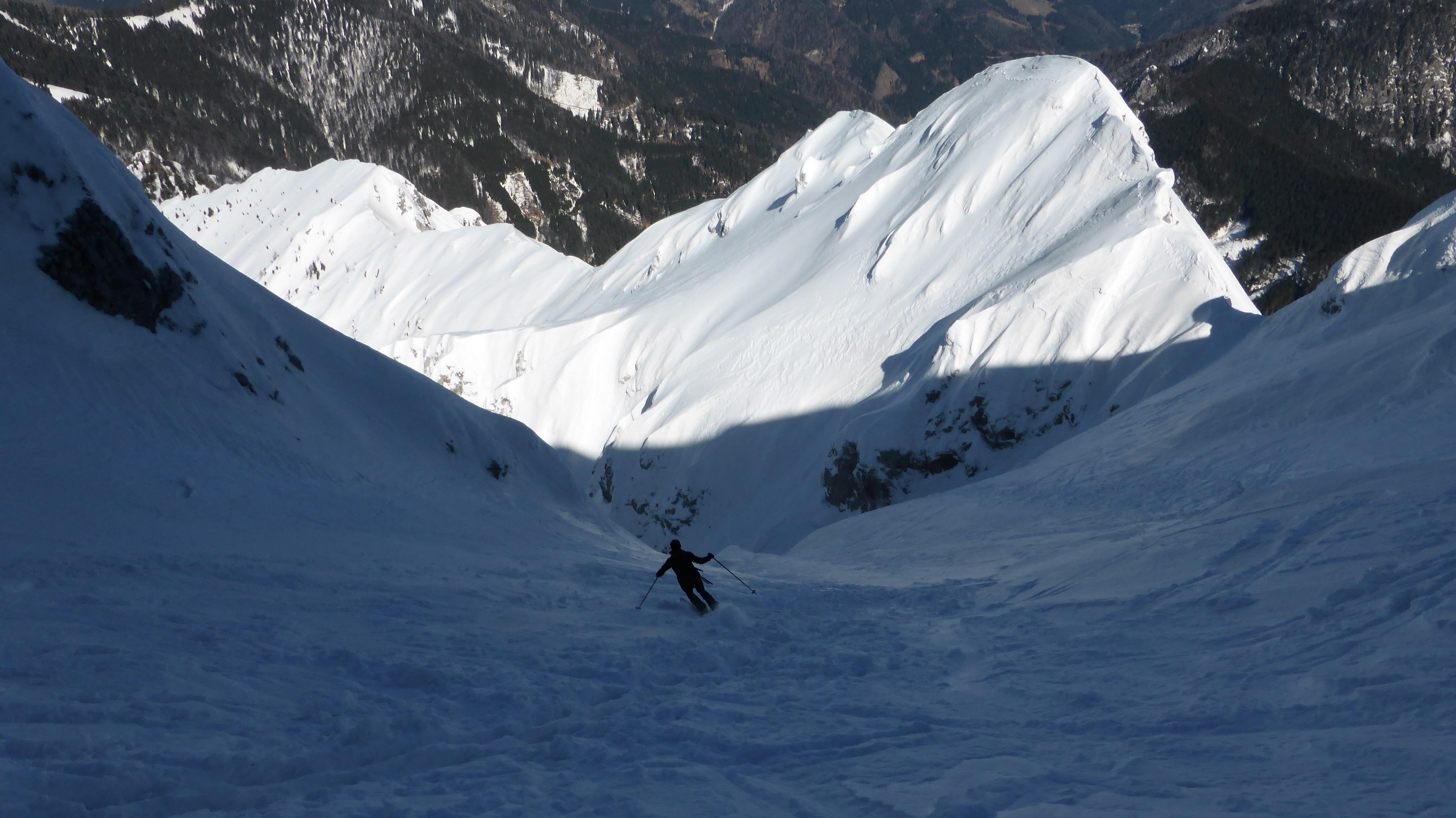 gepresster Triebschnee in der nordwestorientierten Rinne, nur ganz oben hart, aber griffig - also summa summarum beste Bedingungen!