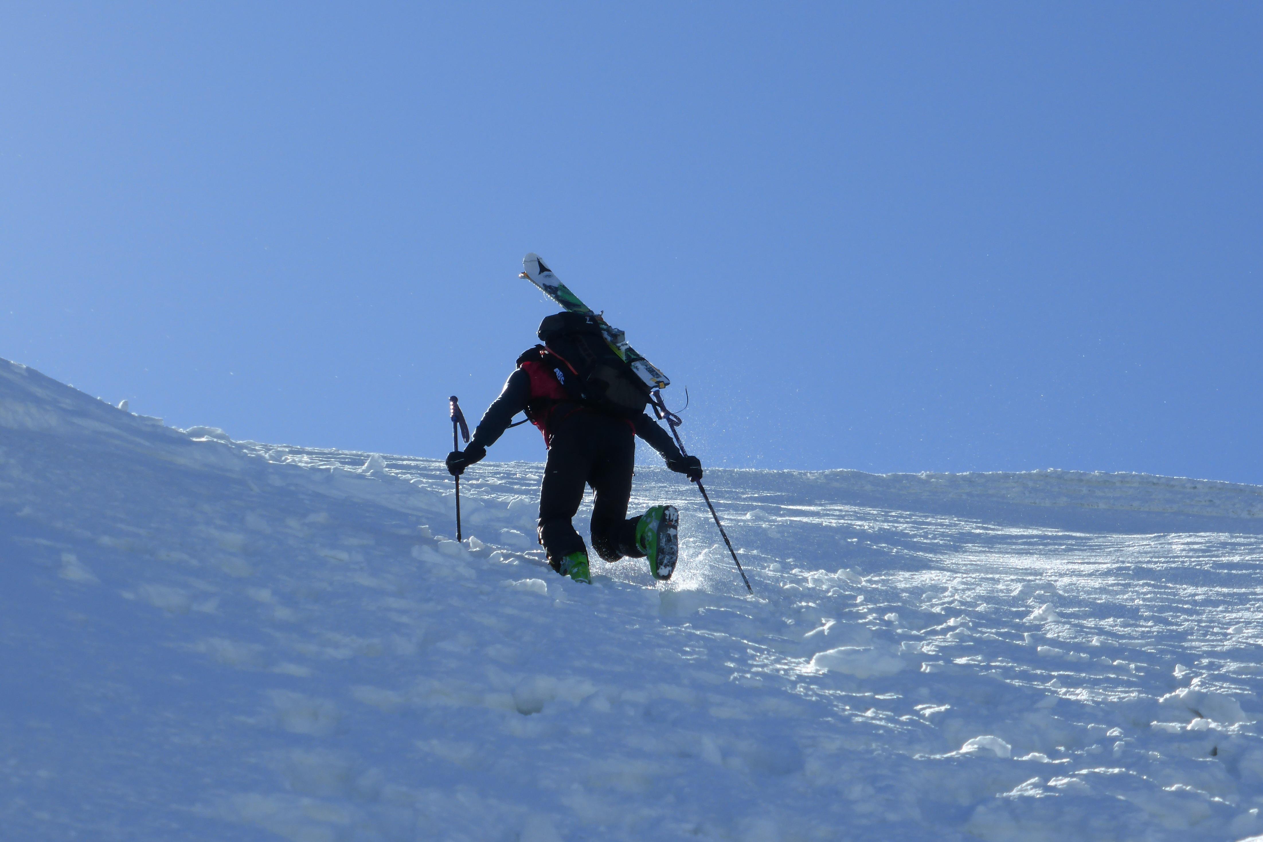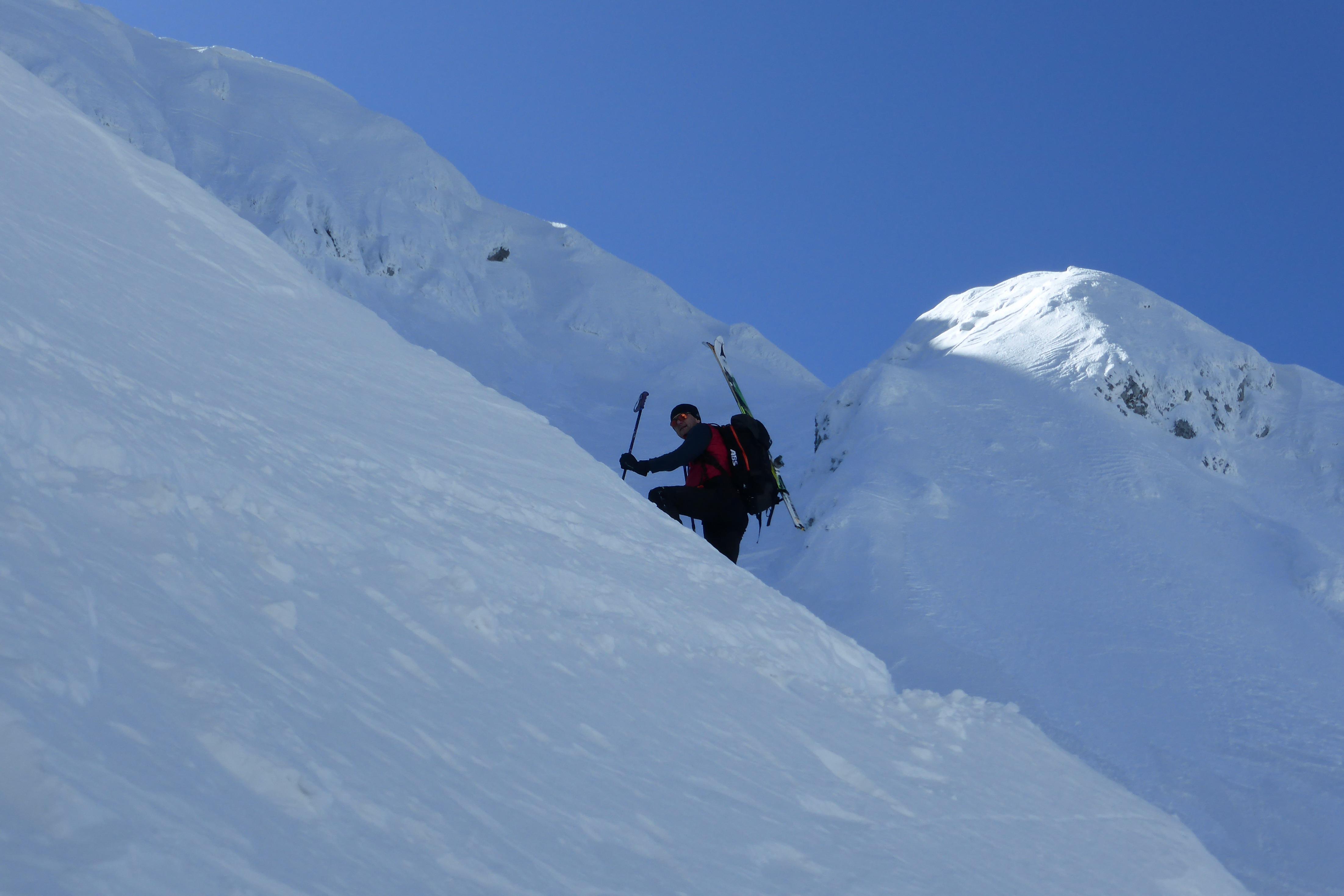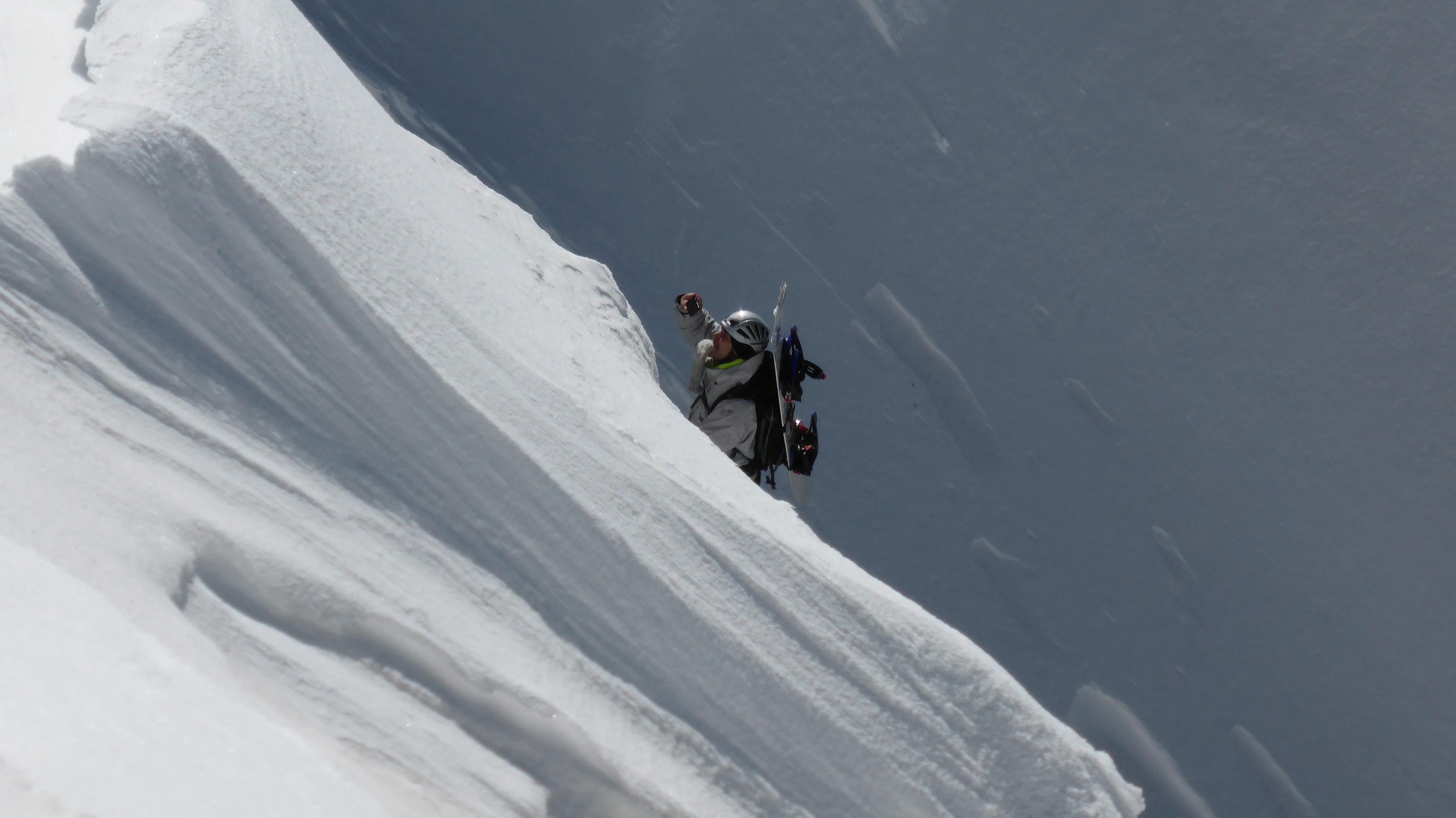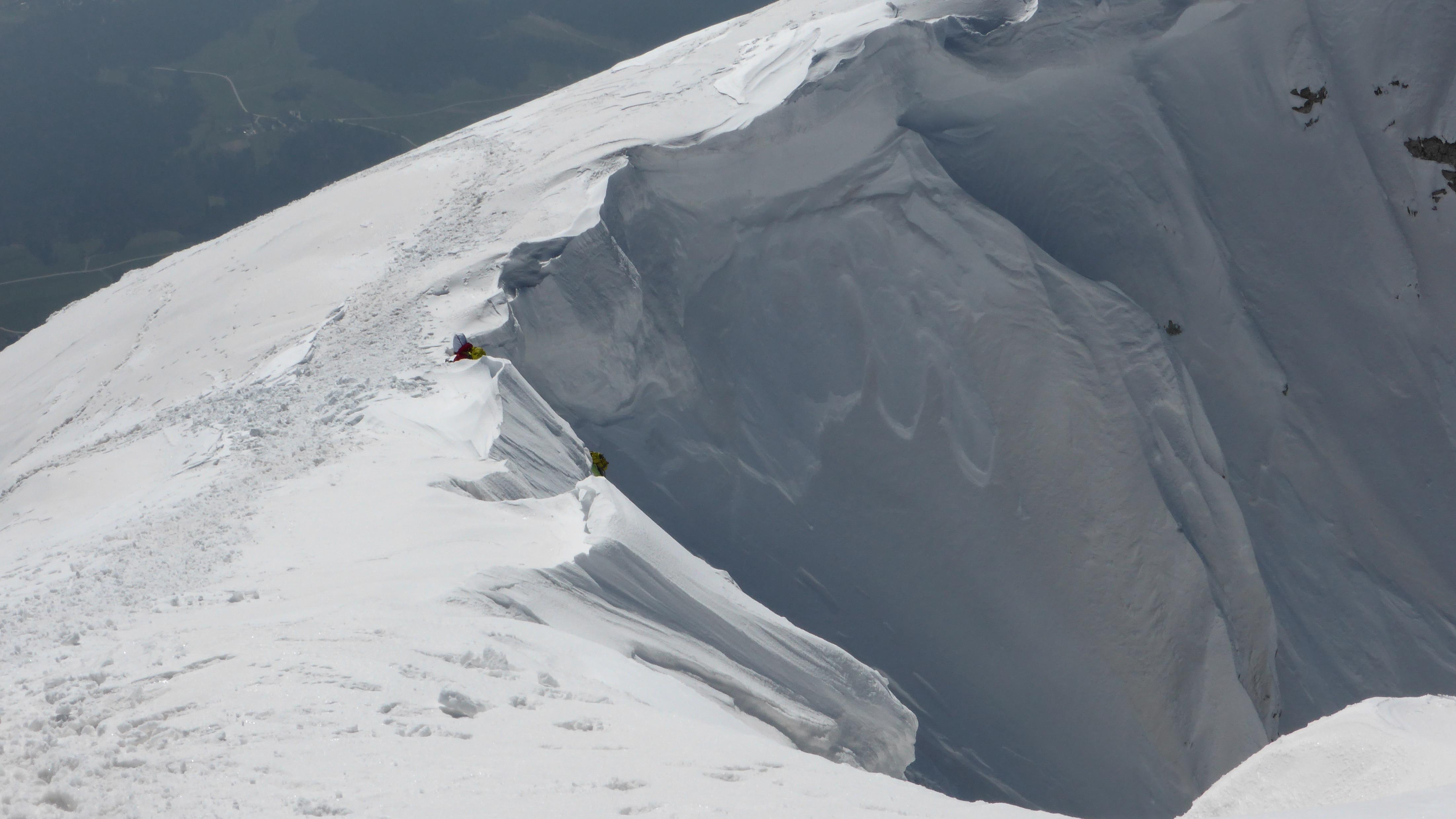 gepresster Triebschnee in der nordwestorientierten Rinne, nur ganz oben hart, aber griffig - also summa summarum beste Bedingungen!