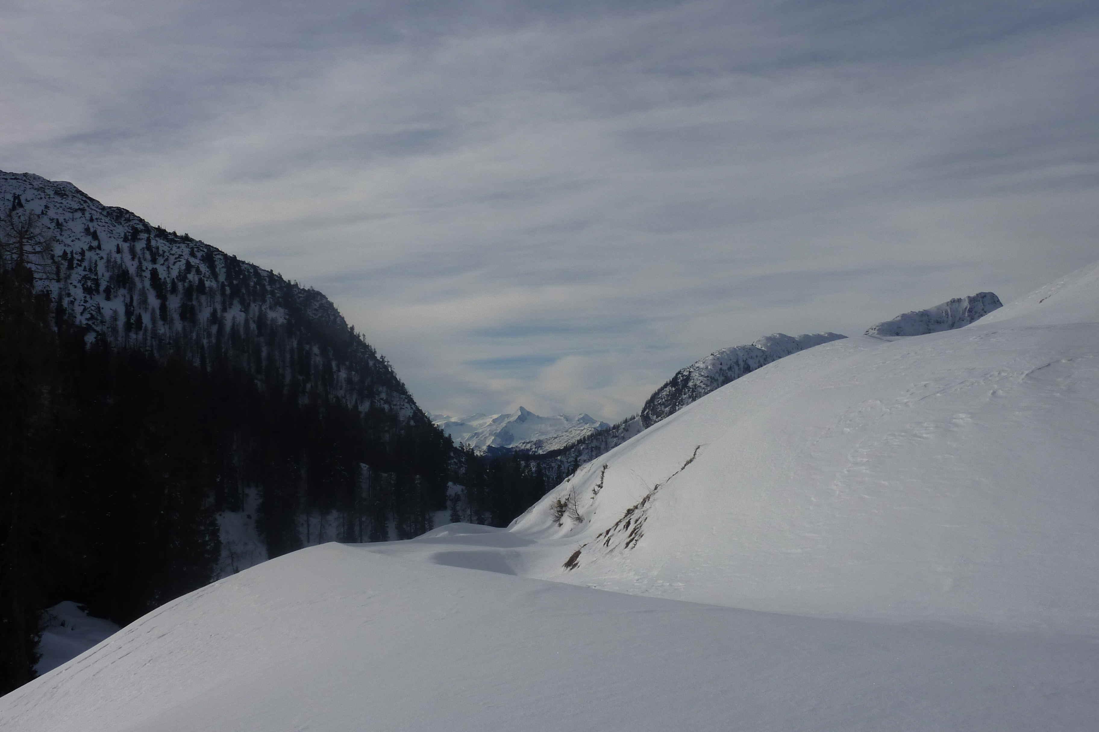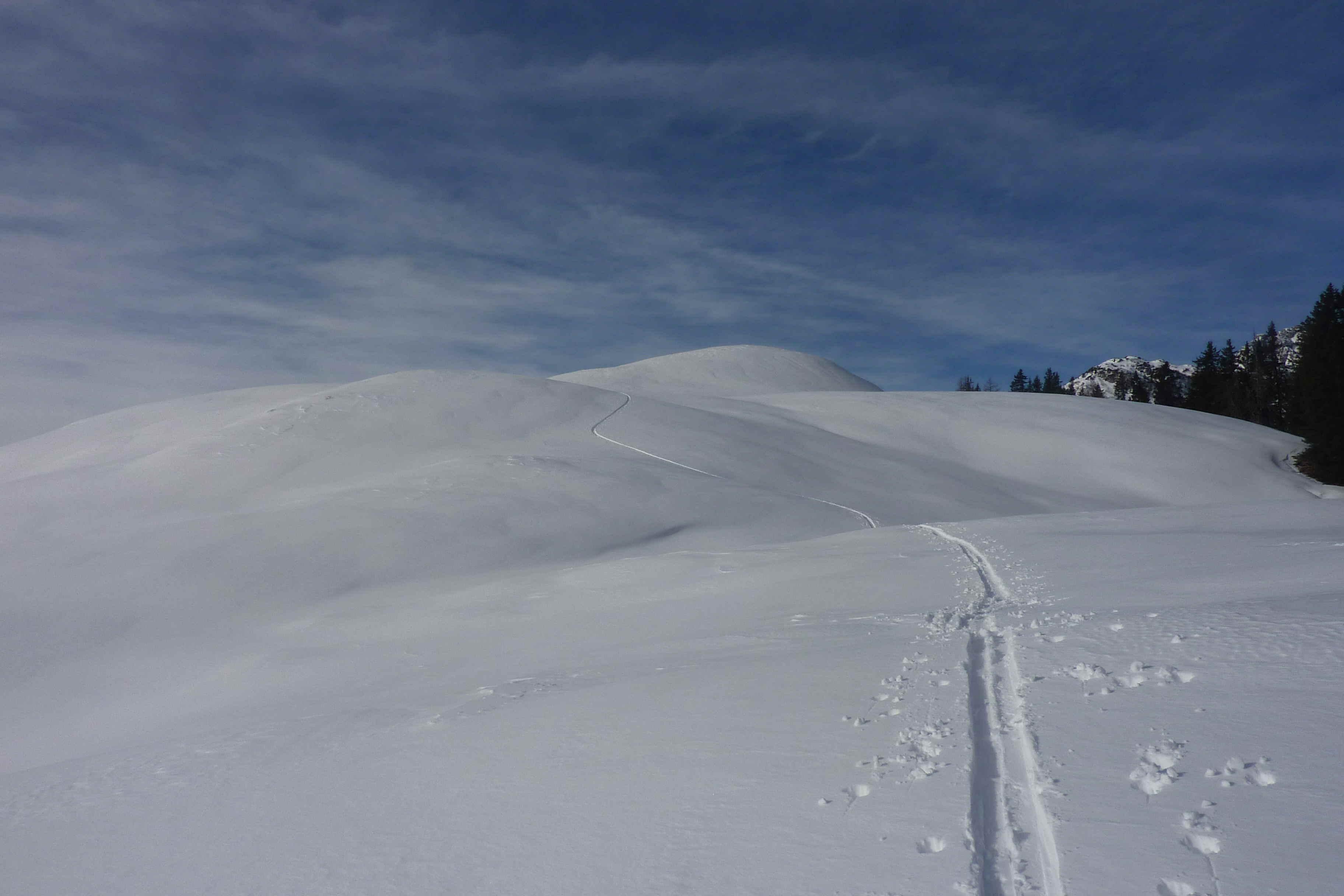 Bei der Abfahrt bis zur Staße waren dann die Schneeverhältnisse ziemlich abwechslungsreich: Firn, Sulz, feuchter Pulver, kurze Stücke mit tragendem Windharsch.
