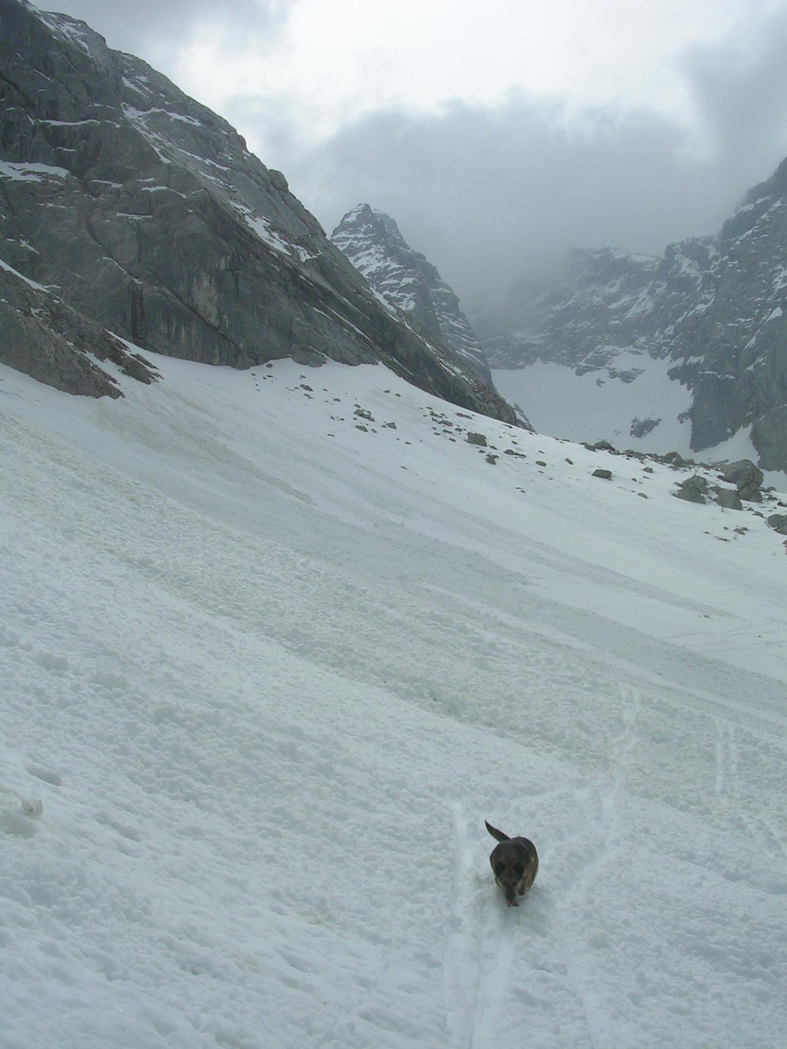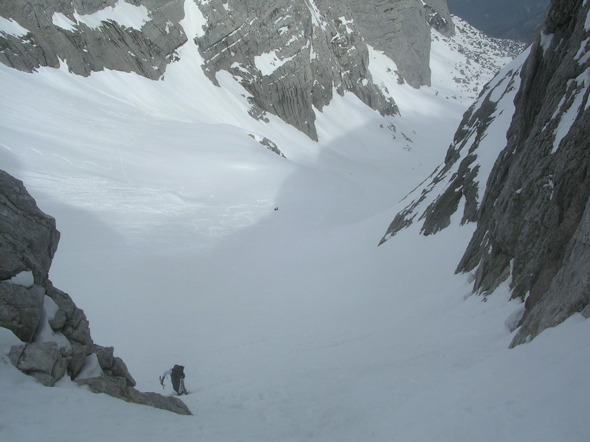 Insgesamt waren acht Leute und ein Hund unterwegs und von 700 Hm Pulver konnten wir im ersten Teil des Anstiegs noch träumen. Harscheisen oder Steigeisen brauchte man nach wie vor keine.