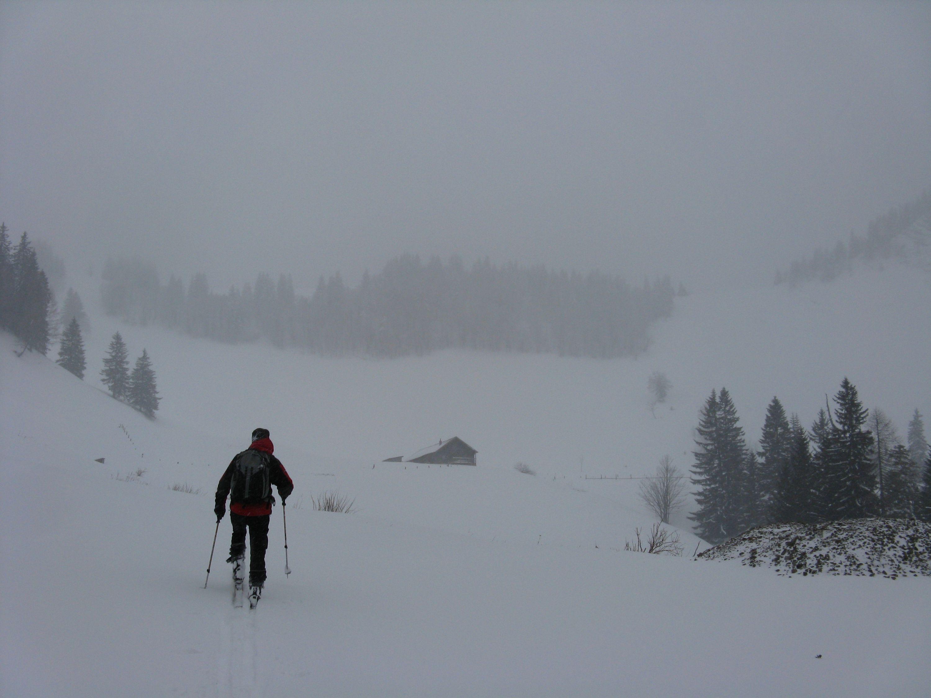 Osterhorngruppe Parkplatz am Ausgangspunkt gut belegt,kein großer Neuschneezuwachs von gestern auf heute.Wetter:zeitweise sehr stürmisch,leichter Schneefall,eingeschränkte Sicht.