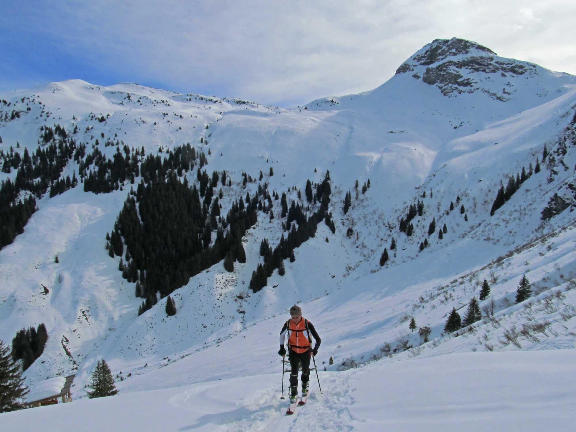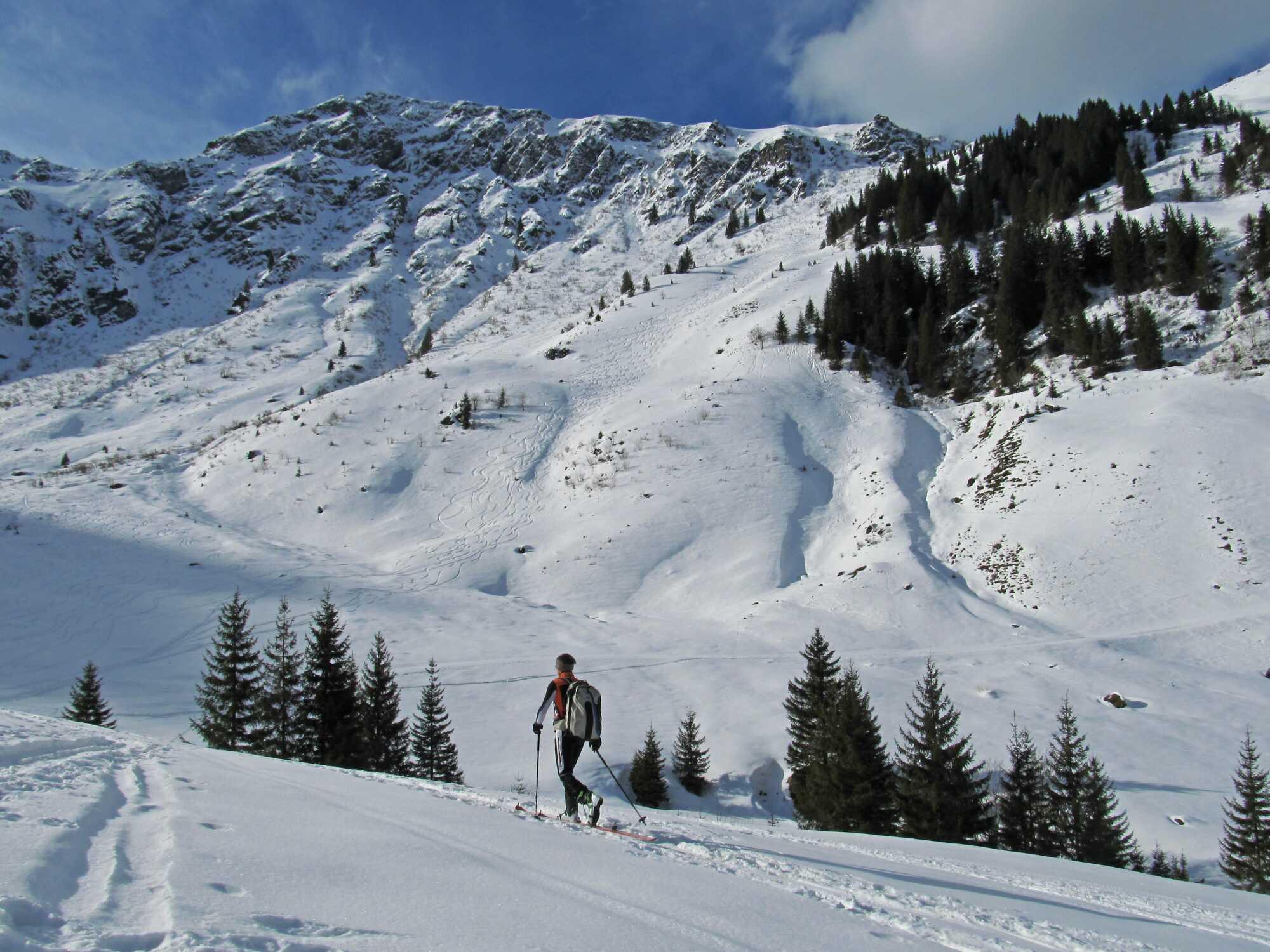 Von Grüntal (ca.900) über die Kelchalm-Rodelbahn durch den Wiesenegggraben zum Schützkogel (2067). Abfahrt über den steilen O-Hang bis unterhalb Oberkaseralm und Wiederaufstieg über Saaljoch (1875) zum Skidepot vom Tristkogel (ca. 2015). Abfahrt über die N-Hänge unterm Tristkogel direkt in den Graben zurück.