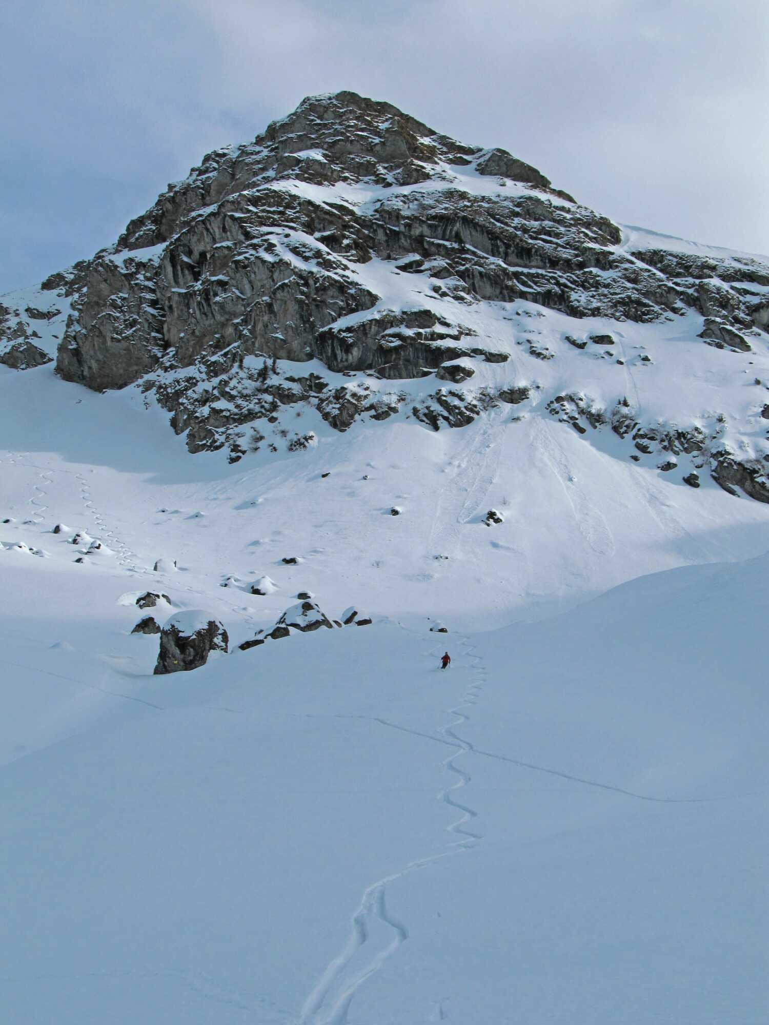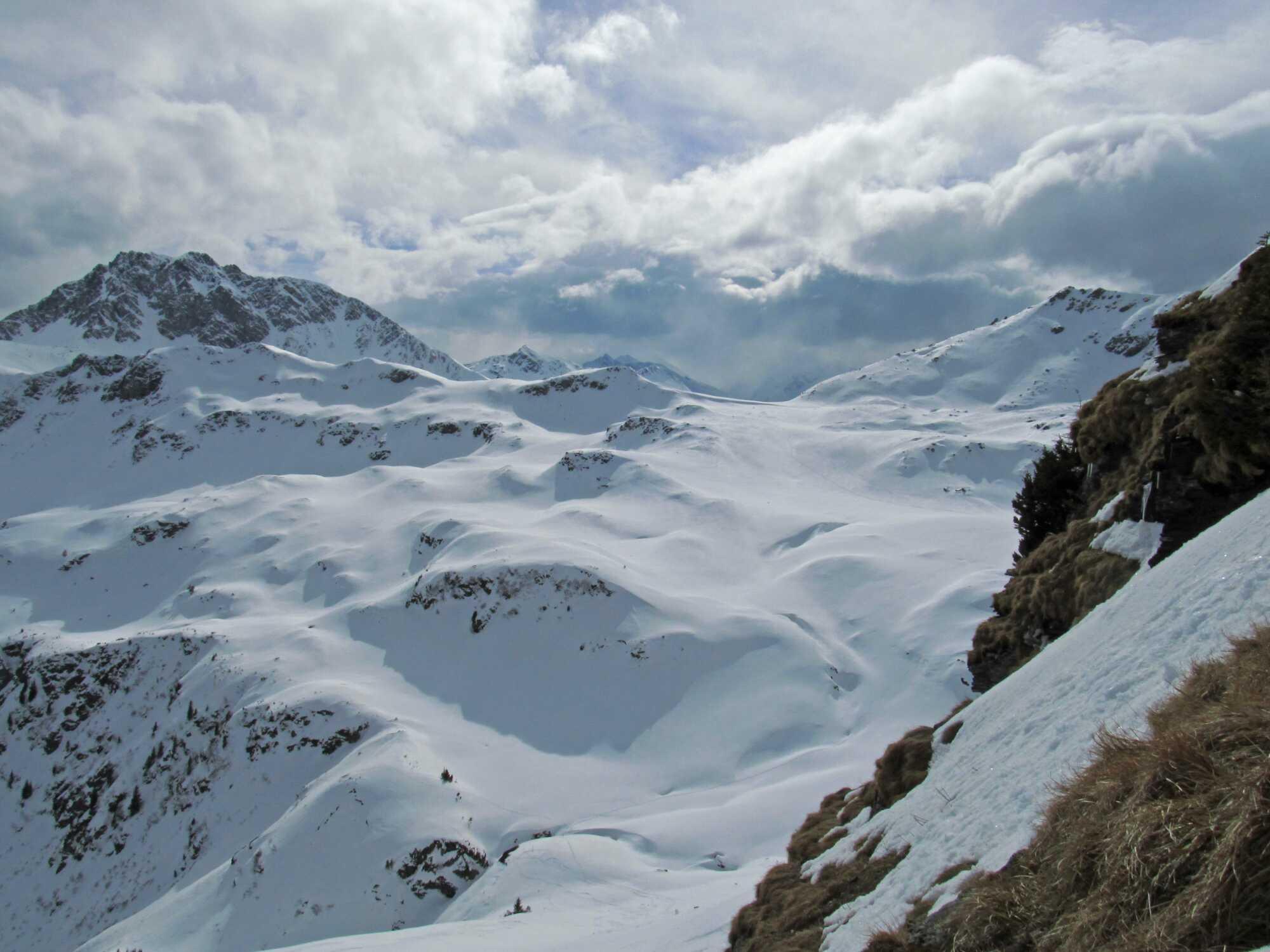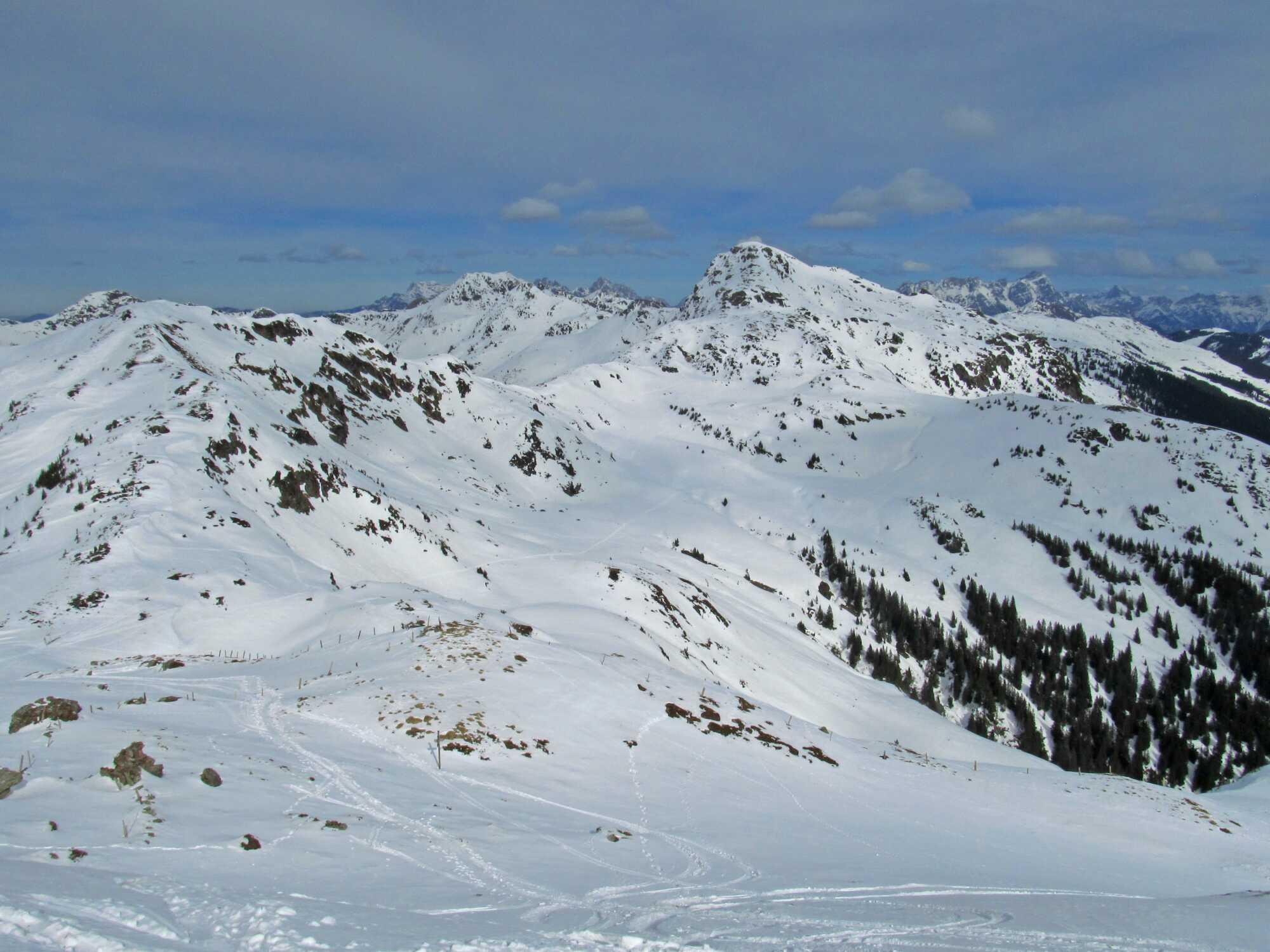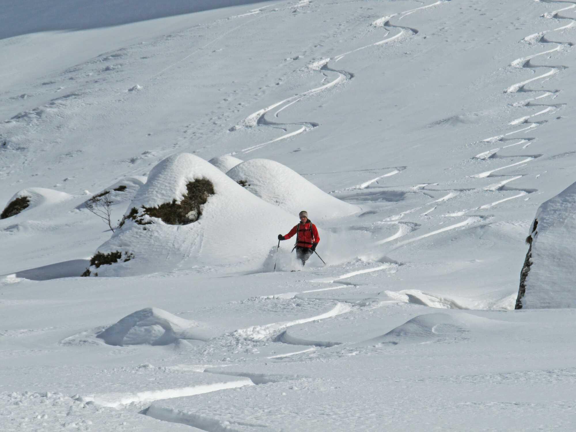Schneelage: Die ersten 5 Minuten müssen die Ski getragen werden, dann gehts noch durchgehend auf der Rodelbahn mit Ski. Der größte Teil der meist N-seitig ausgerichteten Hänge hatte noch guten Pulver, im oberen Teil stellenweise etwas vom Wind behandelt. An steileren sonnenausgerichteten Hangbereichen Harsch. Der O-Hang vom Schützkogel war im Mittelteil etwas verharscht, ansonsten noch pulvrig. Die Abfahrt unterm Tristkogel hatte noch durchgehend schönen Pulver.
