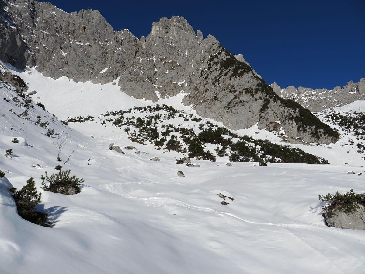 Was tut sich im Nachbarland Tirol? Von den Kitzbühelern gesehen schaut die Kaiser-Südseite recht mager aus. Heute wollte ich es wissen und startete an der verwaisten aber trotzdem offenen Wochenbrunner Alm. Grobe Richtung Ellmauer Halt. Mehr wieder >>hier<<