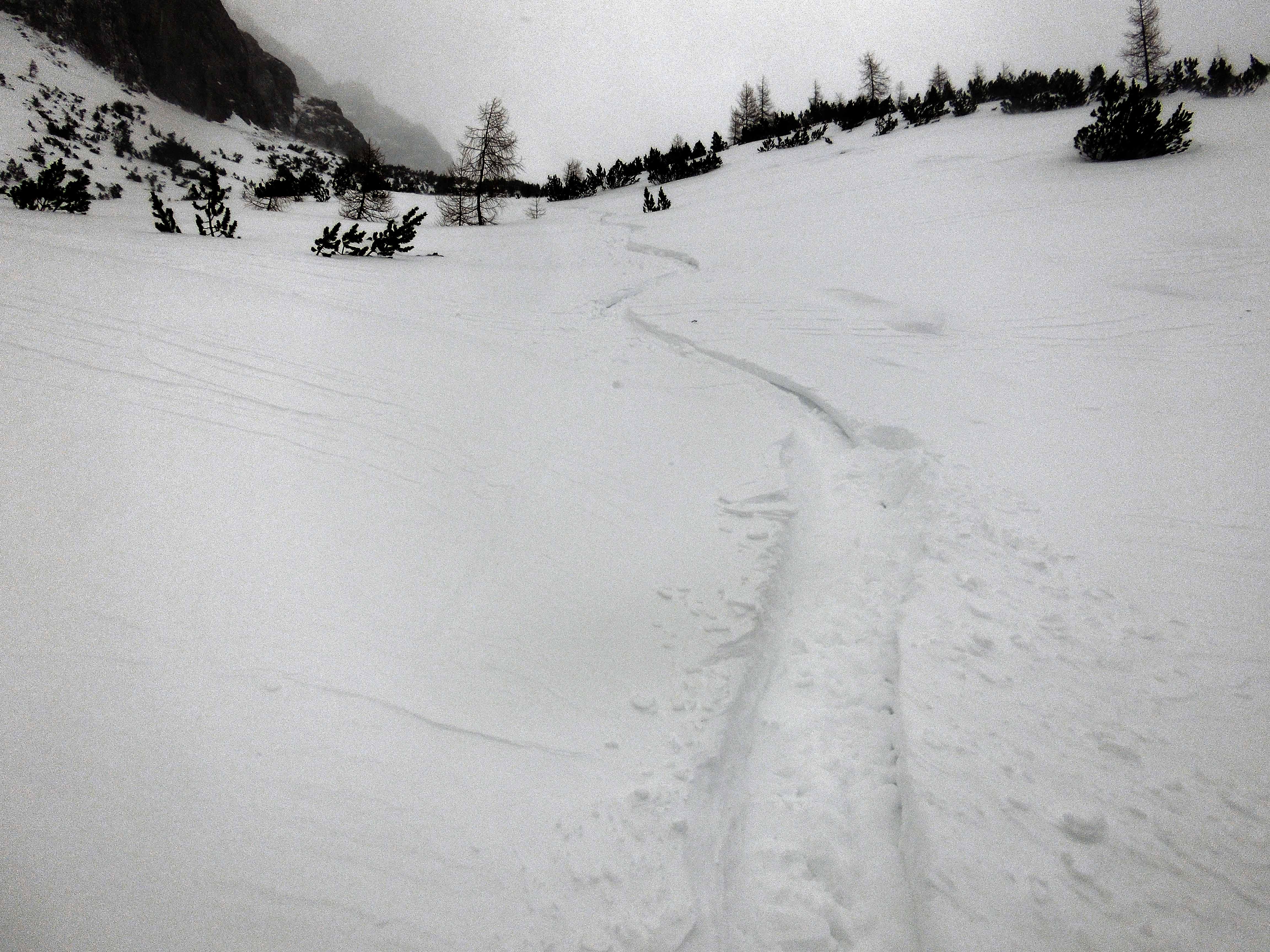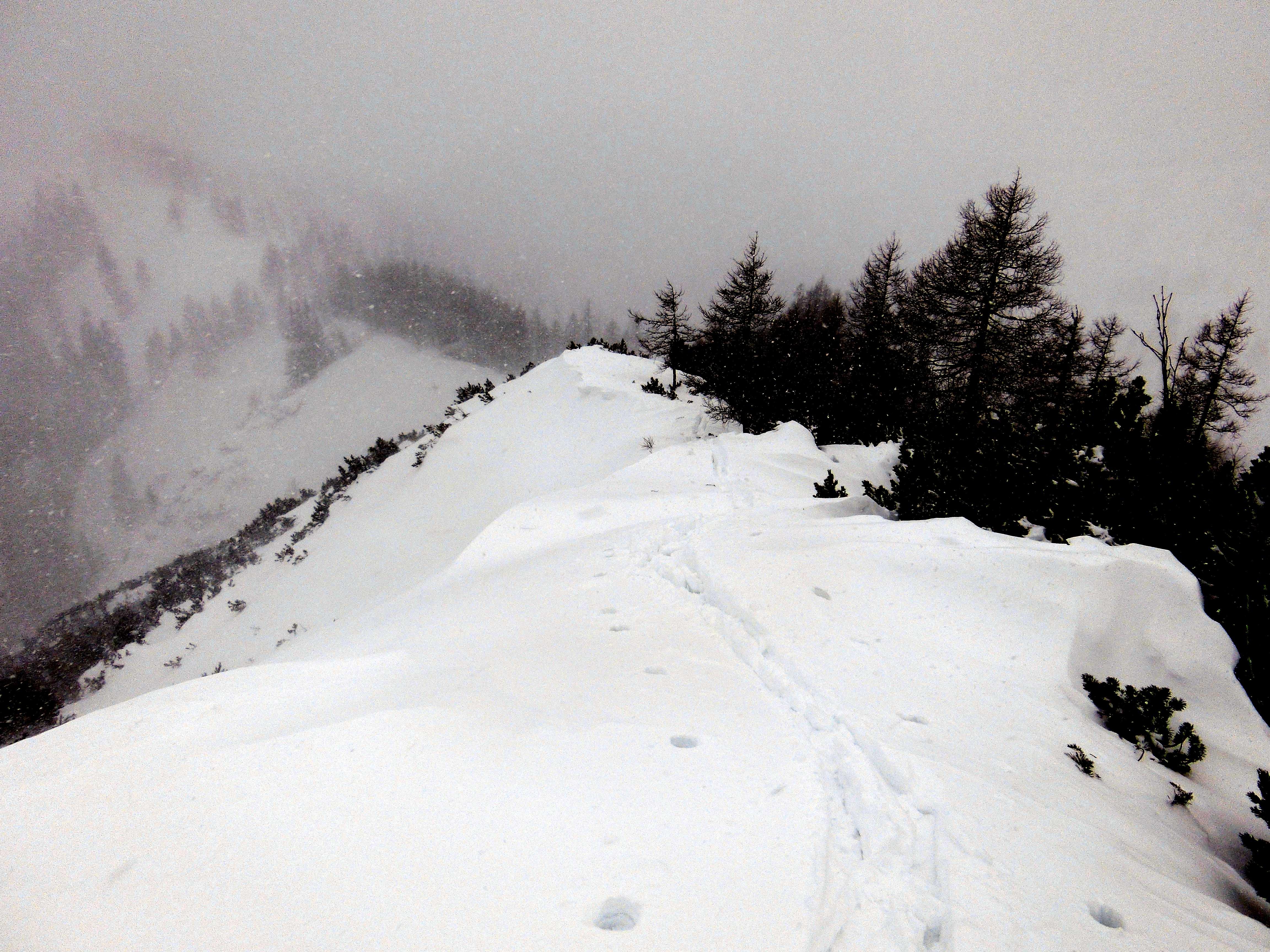 Heute wollte ich es zum Ausklang des Wochenendes noch mal wissen und bin wieder einmal Richtung Gamsfeldgasserl aufgebrochen. Im Wald noch halbwegs lockerer Pulver, spätestens ab der Baumgrenze zunehmend fest gebunden. Streckenweise knapp 1m, teilweise, insbesondere an Rücken auch komplett abgeweht. Am Normalweg hab ich die Tour kurz nach der Austriahütte abgebrochen. Die Schi blieben einfach im Beton stecken und ich musste wie eine Ente meine Schi von hinten heraus aus dem Schnee befreien, außen herum führen, vorne wieder aufsetzen, nur um dann wieder bis zu 75cm weit im festen Triebpulver einzusinken. So wählte ich den Weg über den stürmischen Kamm (Sunniwender) hinauf aufs Gamsfeldgasserl. Die Abfahrt war dementsprechend nur im steileren Bereich lohnend, reduzierte sich aber auf eine Schussfahrt in Rücklage mit wenigen Kurven. Ansonst war Doppelstockeinsatz und bei Steckenbleiben auch bergab die "Ententechnik" einzusetzen ;-)