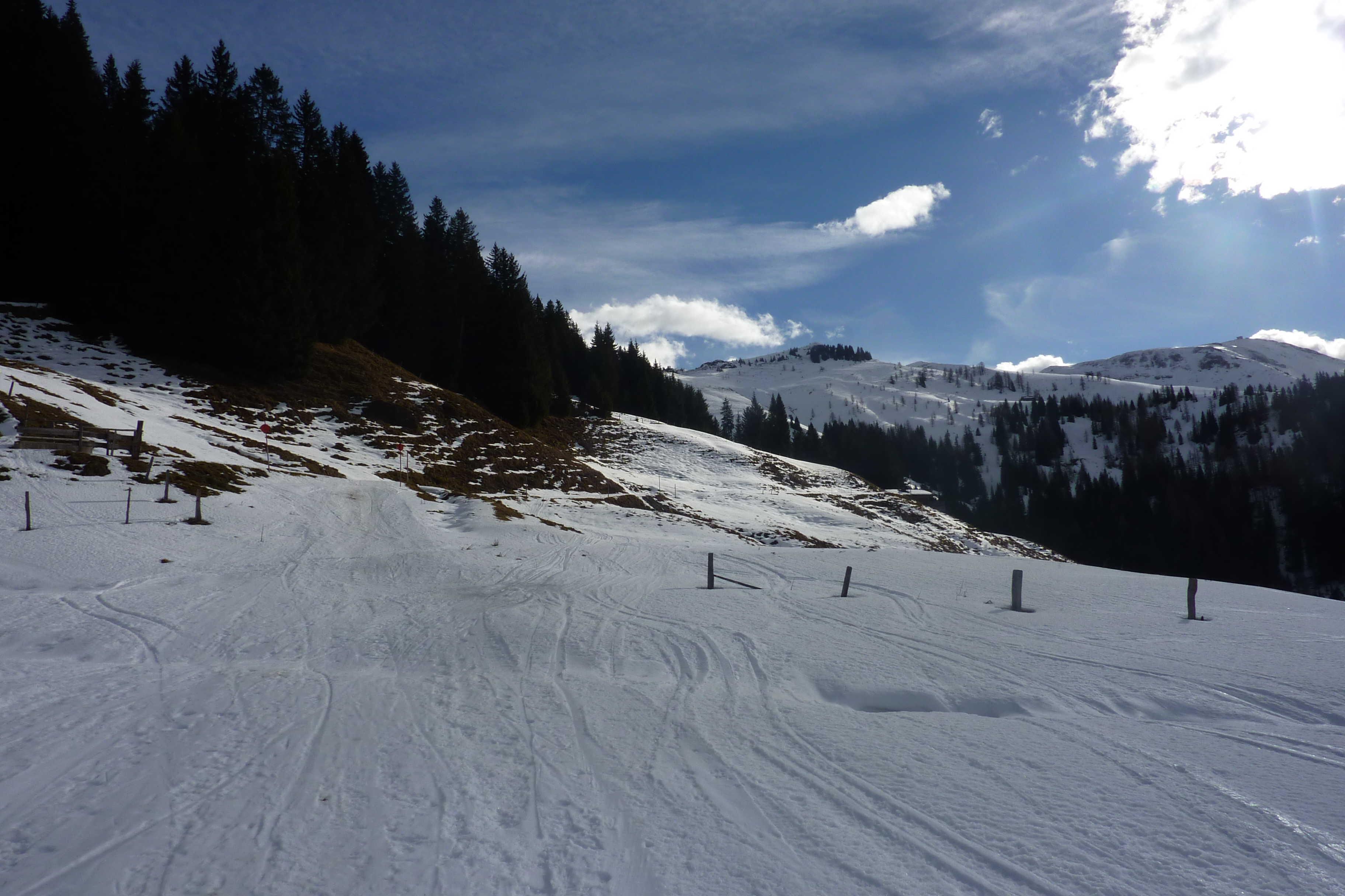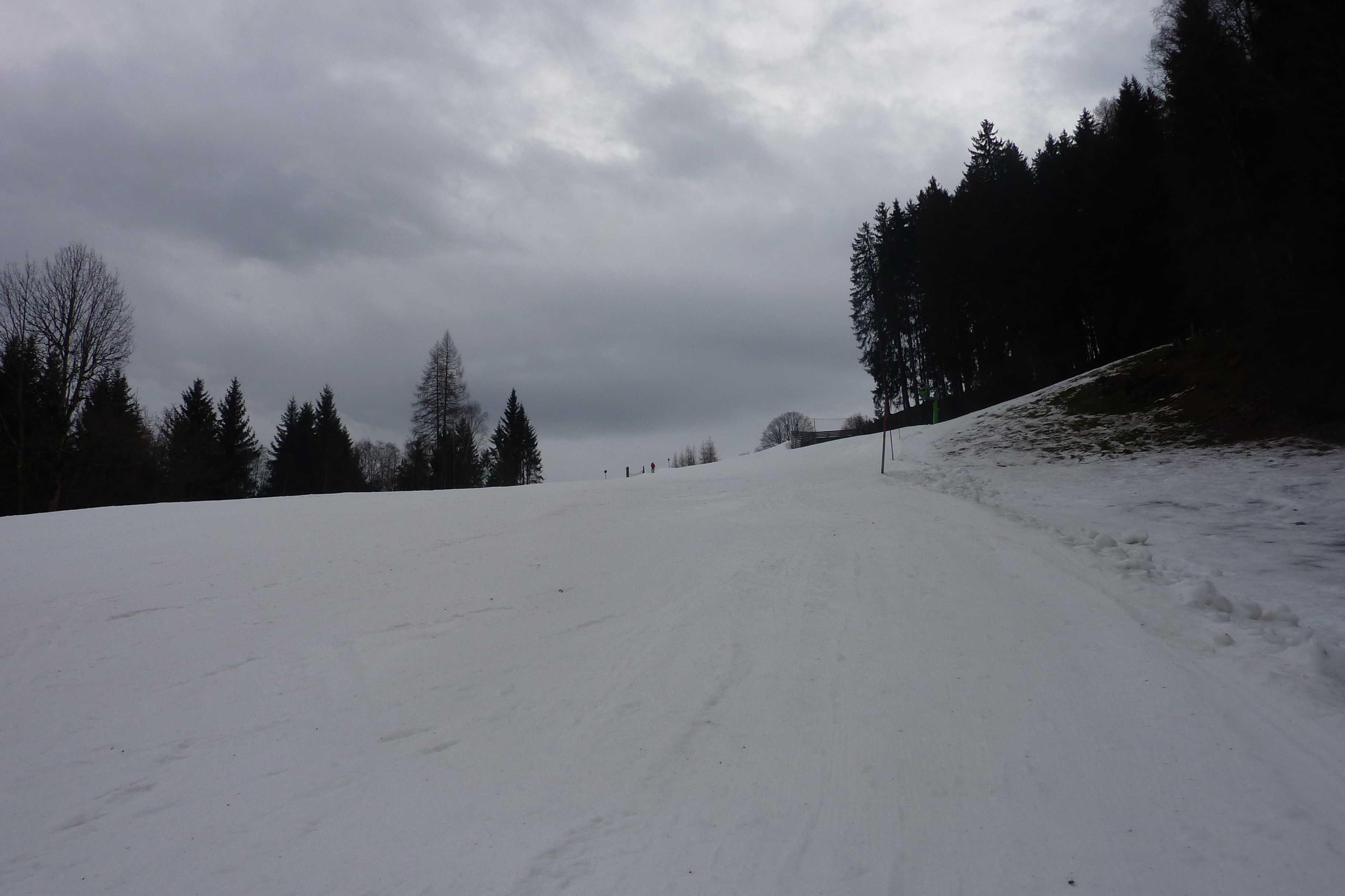 Abfahrt auf der Piste im Frühjahrspapp. Aber da geht es wenigstens noch bis ins Tal und wenigstens die schwarze Piste zur Abergalm hat so richtig Spaß gemacht.