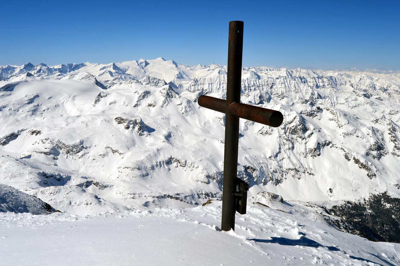 Die Gipfelschneide war natürlich abgeblasen (Mit Schi bis zum Gipfelkreuz).