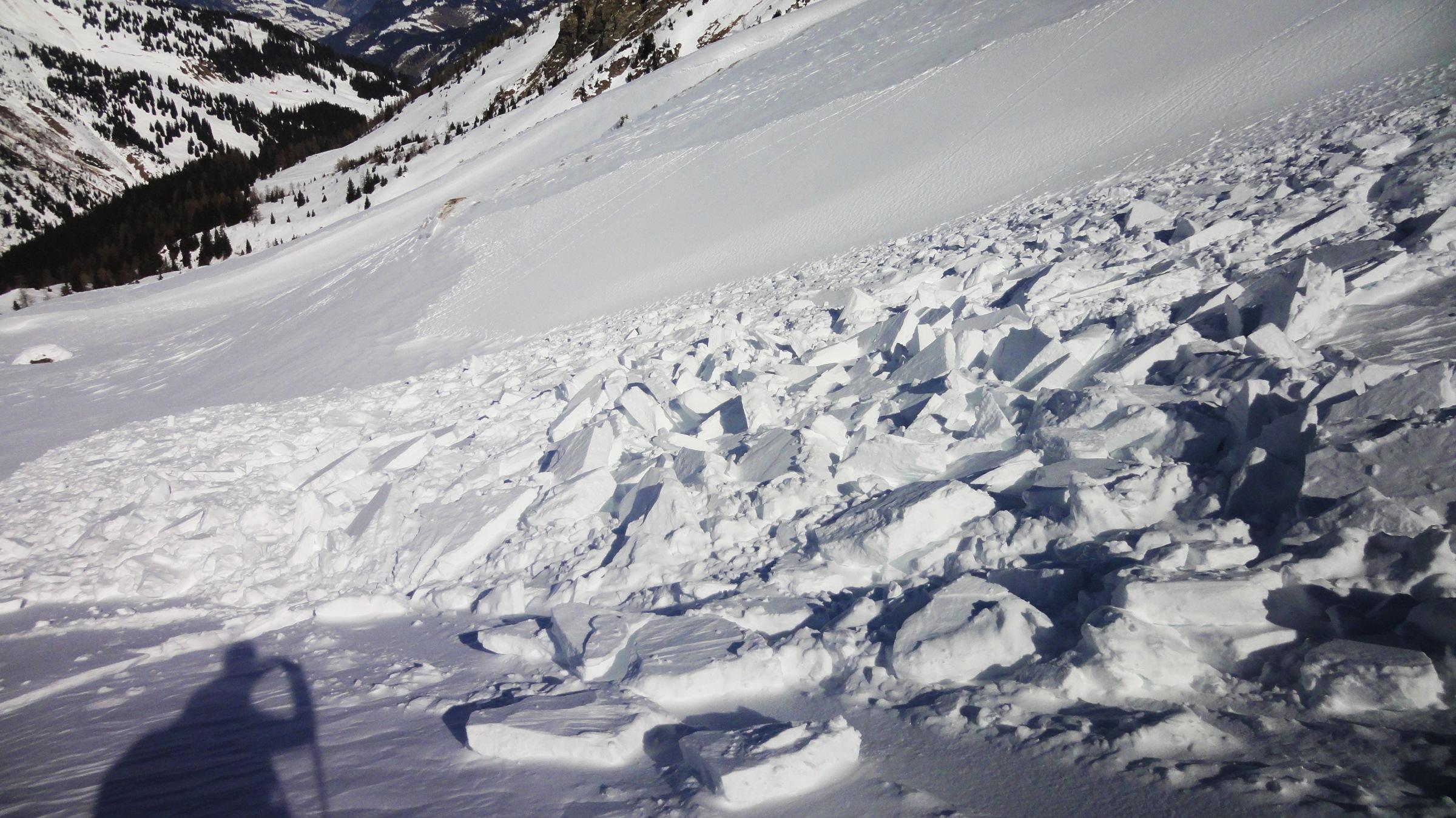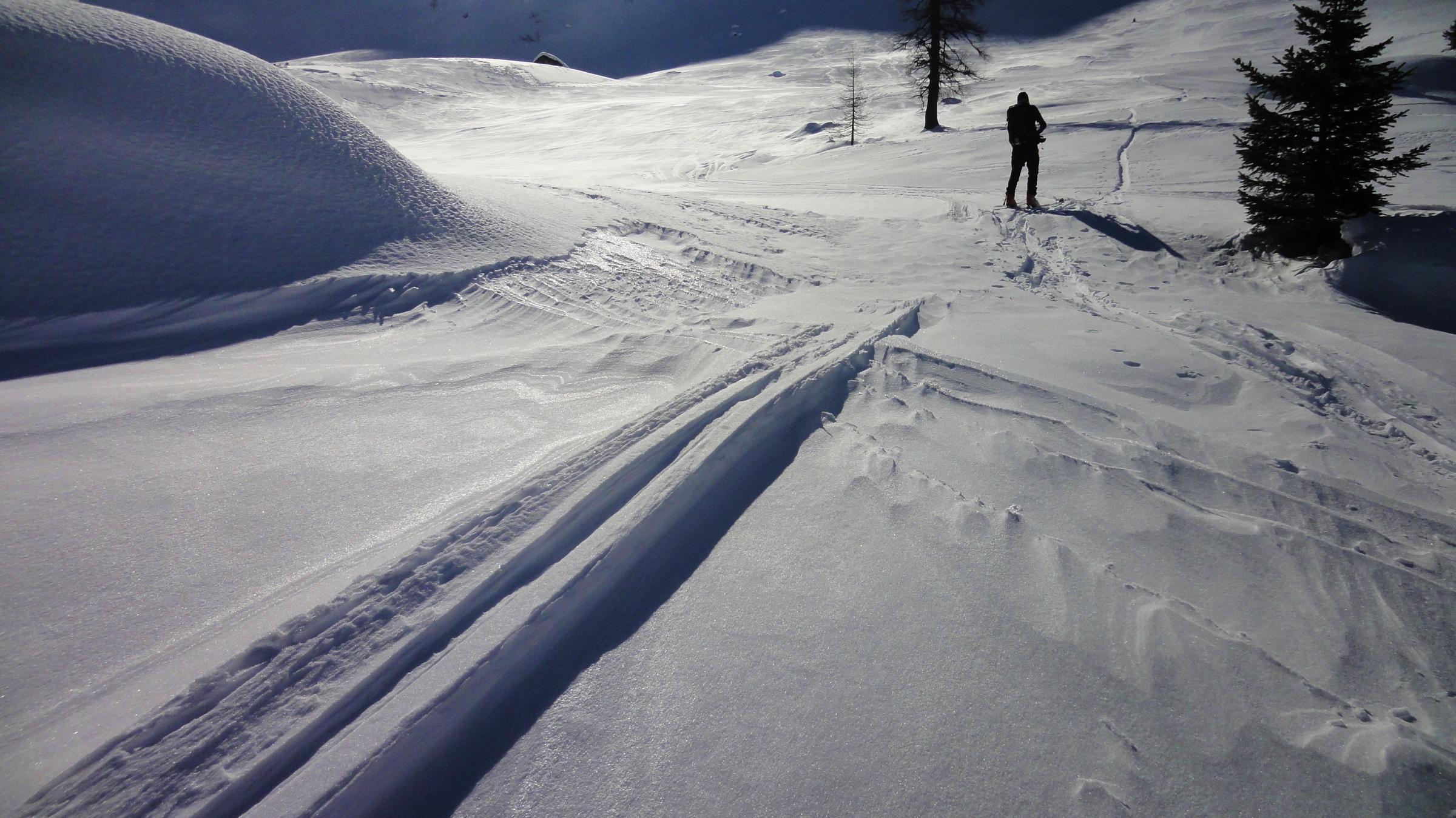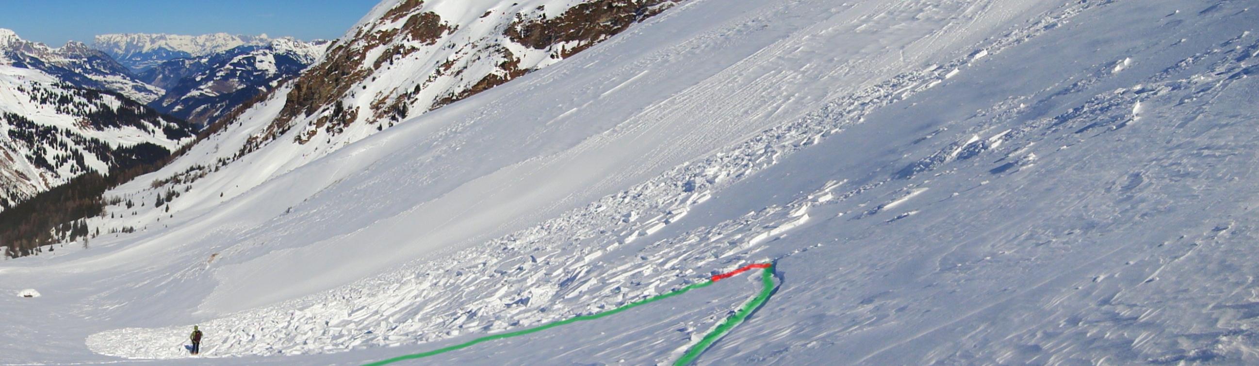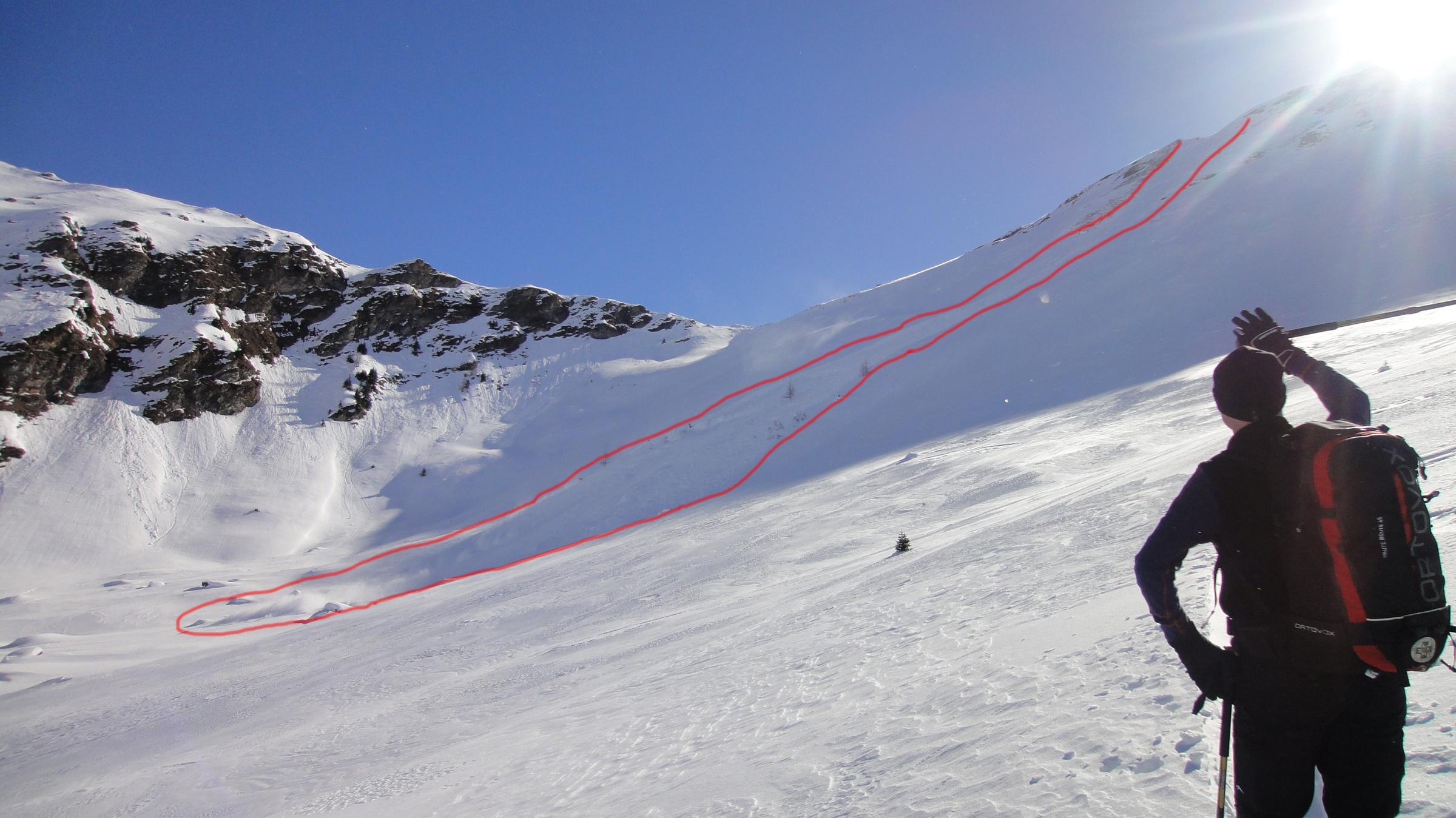 - Südföhn mit Schneeverfrachtung: Der frische, vorerst dünne Triebschnee ist teilweise schon bei geringer Zusatzbelastung als Schneebrett auslösbar… und genau so ein Schneebrett haben wir dann ausgelöst…