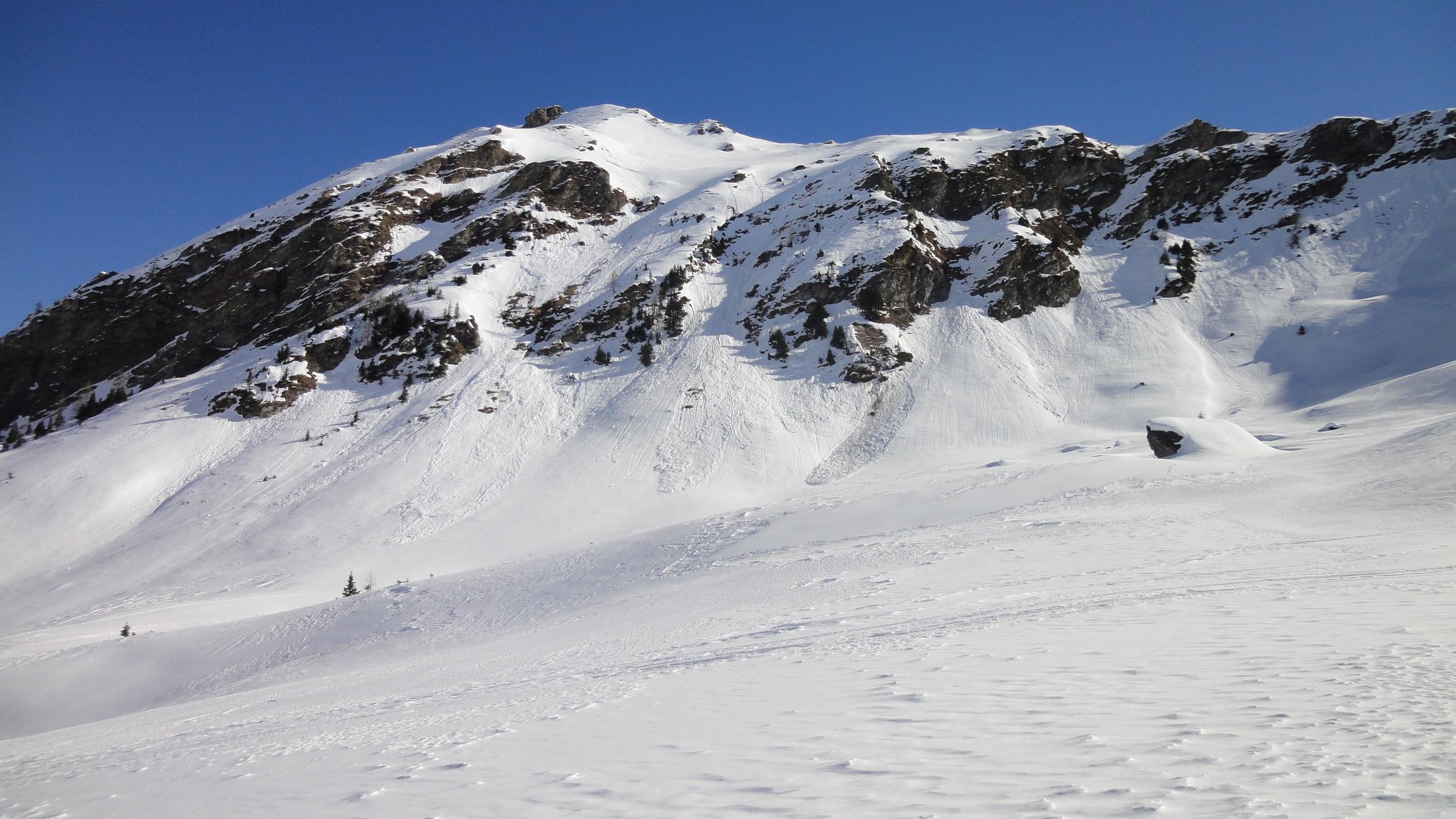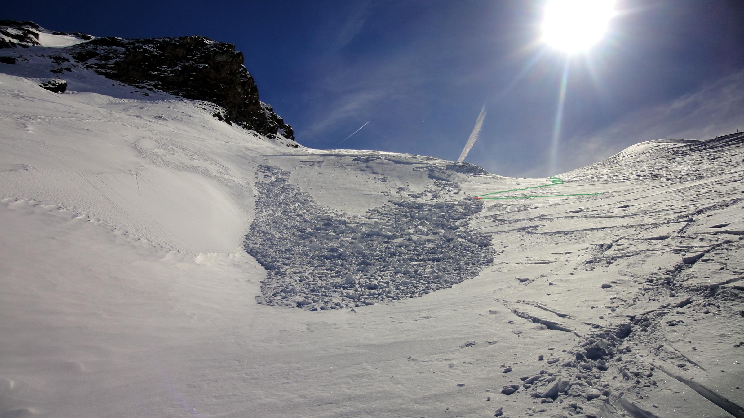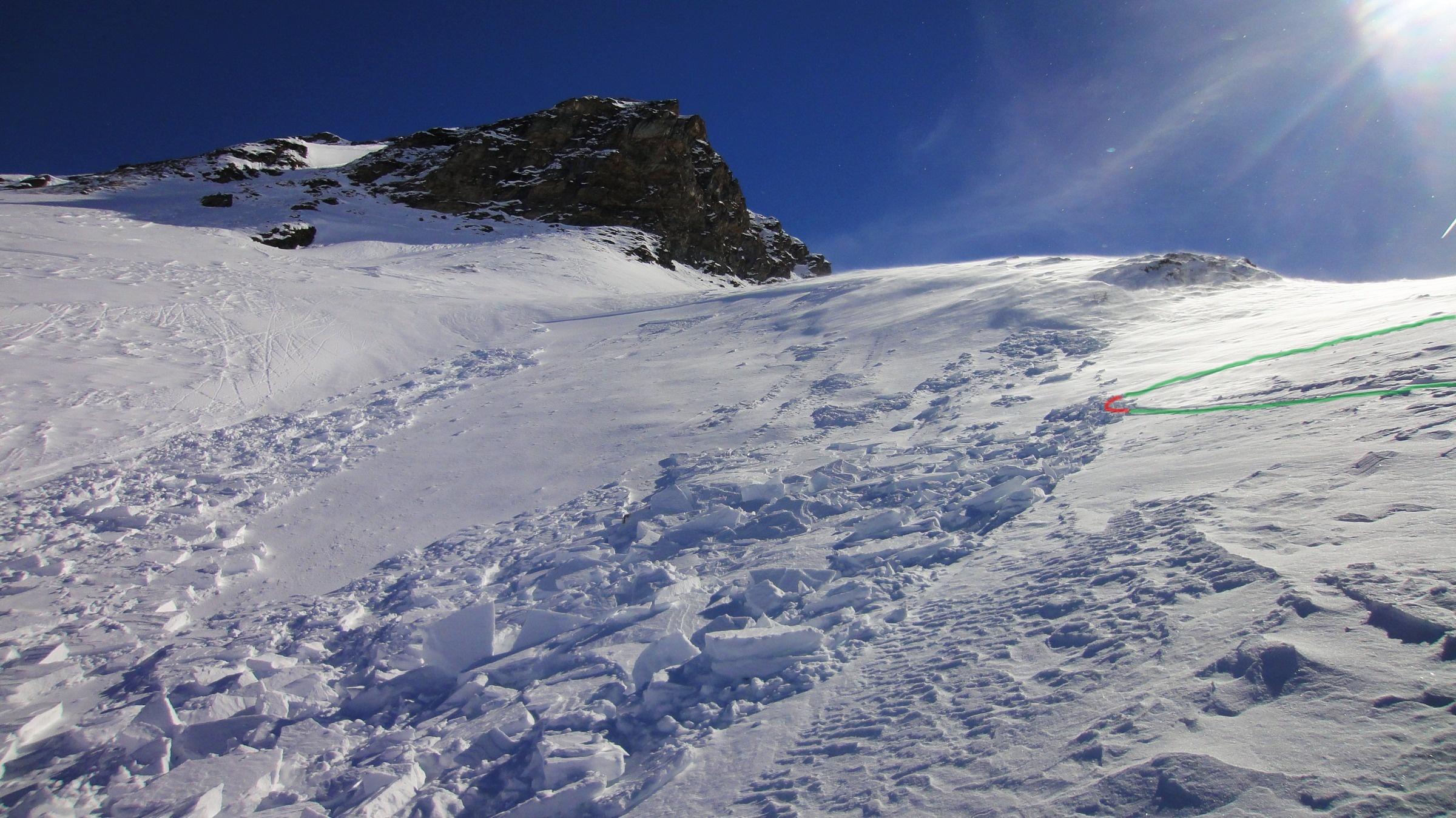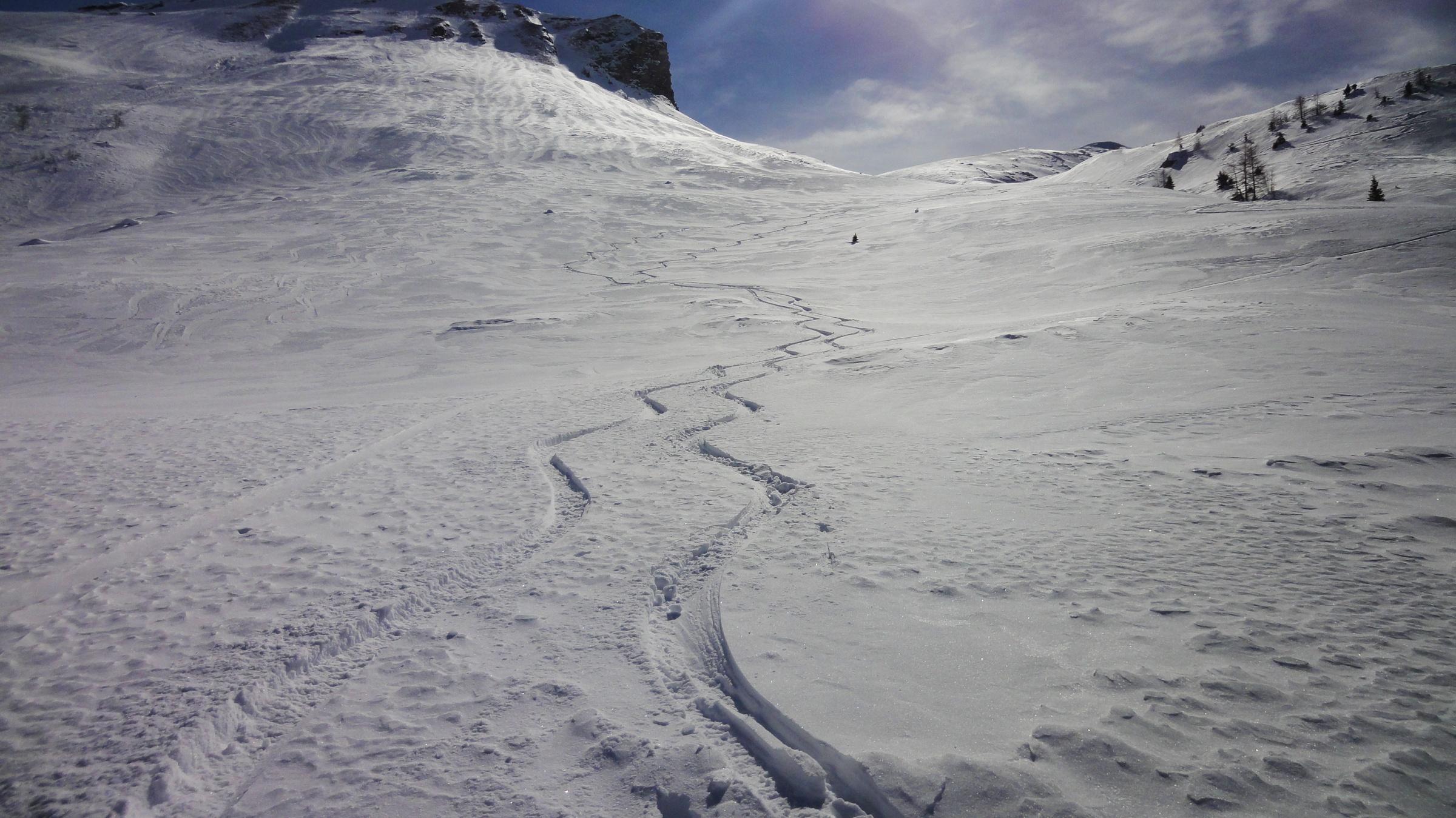 - Südföhn mit Schneeverfrachtung: Der frische, vorerst dünne Triebschnee ist teilweise schon bei geringer Zusatzbelastung als Schneebrett auslösbar… und genau so ein Schneebrett haben wir dann ausgelöst…