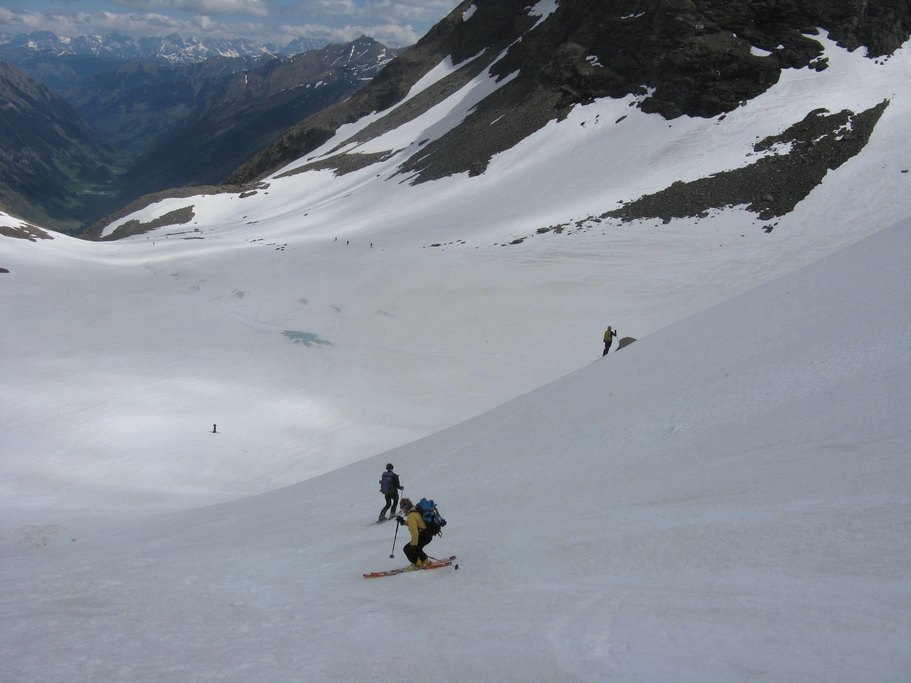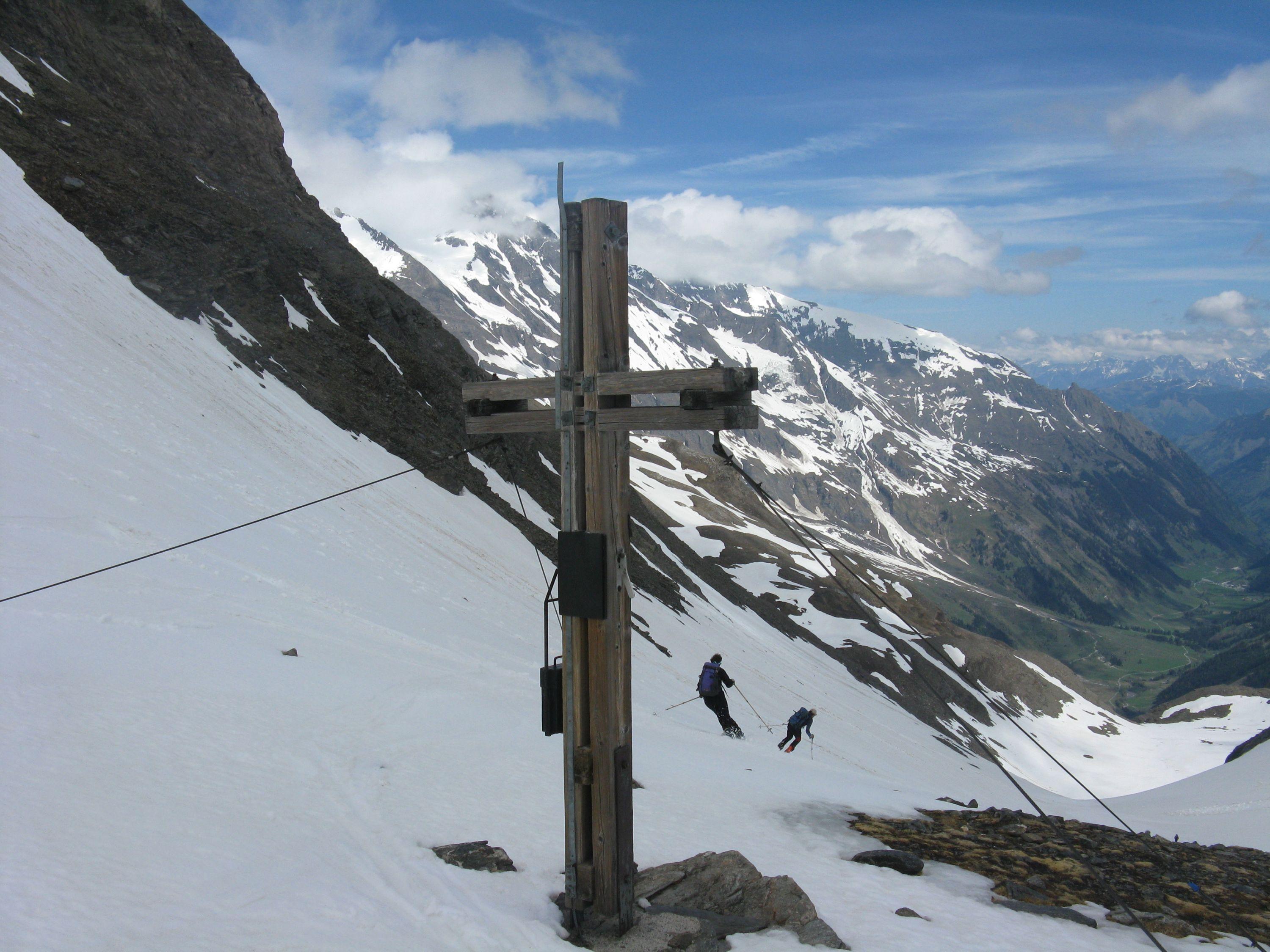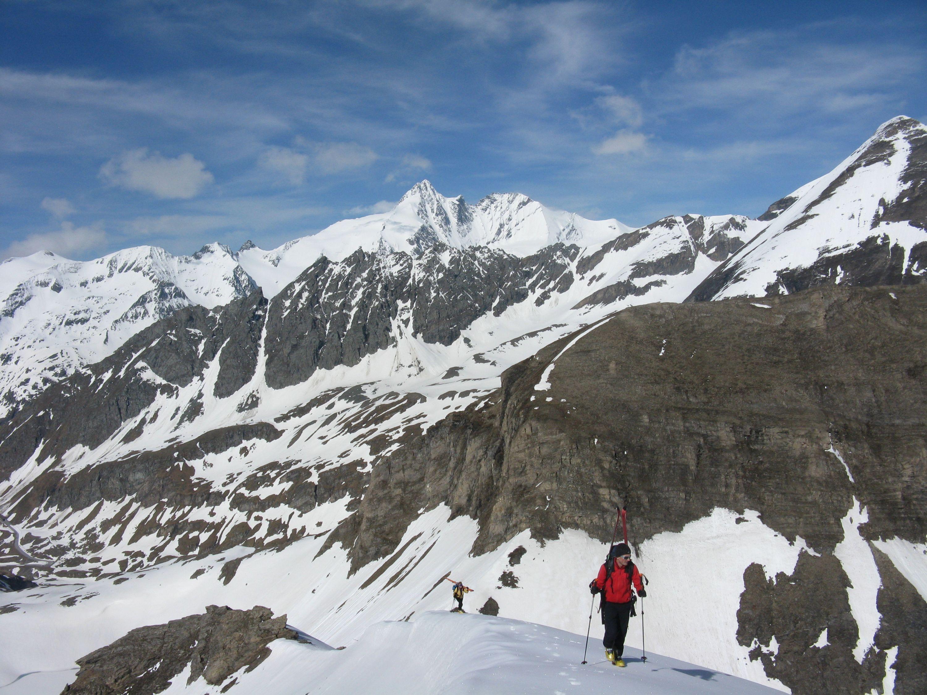Glocknergruppe.Ausgangspunkt war heute der Parkplatz beim Glocknerhaus.Aufstieg zum Gipfel über untere Pfandlscharte und W-Grat,im Gegensatz zum Kloben und Brennkogel einsam.Abfahrt über einen Steilhang zum See,Wiederaufstieg zur unteren Pfandlscharte,Abfahrt ins nördl.Pfandlschartenkees bis zum Zusammmentreffen mit der Klobenabfahrt, Aufstieg zur unteren Pfandlscharte,Abfahrt zum Naßfeldspeicher.Schneedecke morgens gefroren,bei Abfahrt beste Firnverhältnisse.