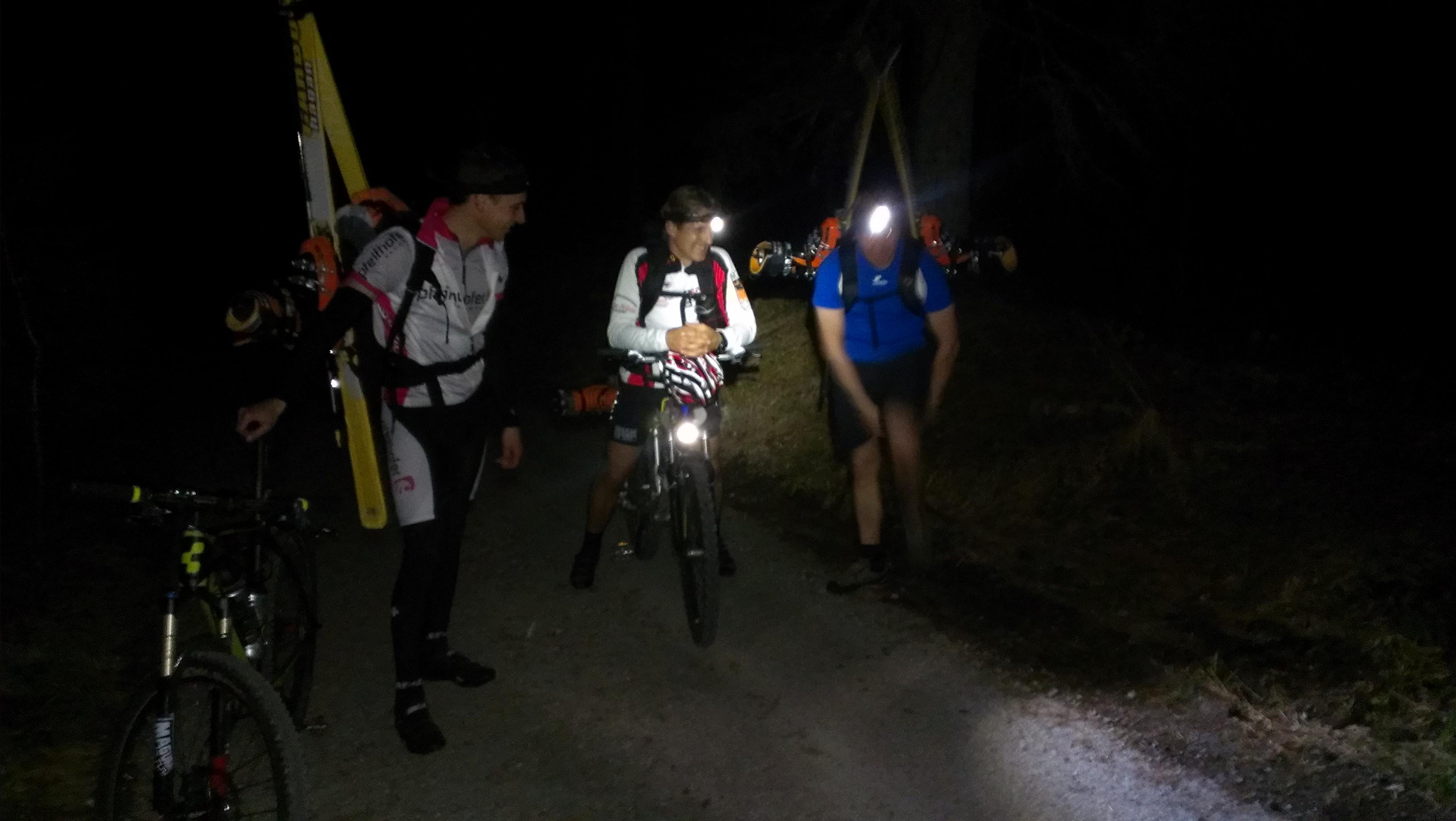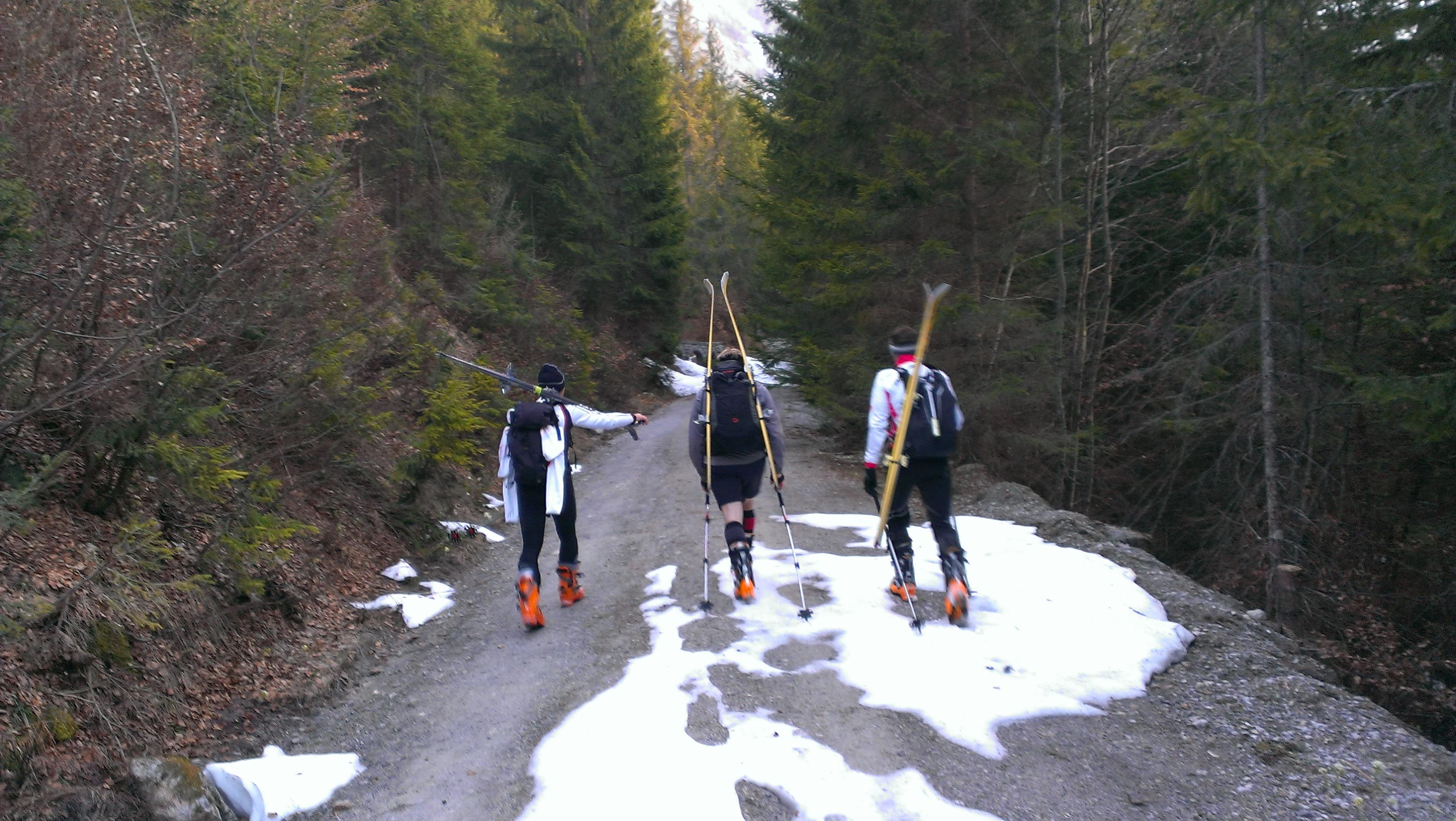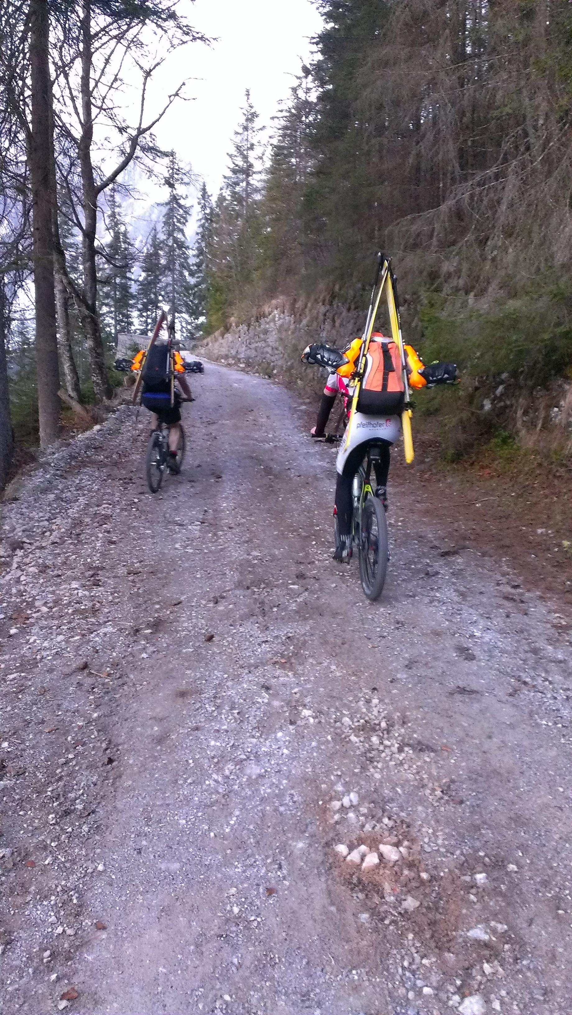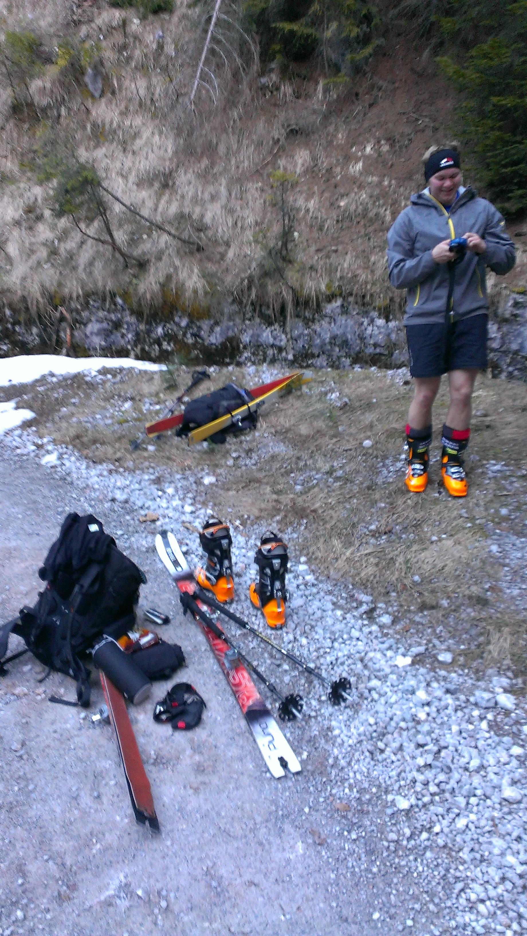 Um 4 Uhr in der Früh war bei einer Außentemperatur von 16°C (!!) Abfahrt mit dem Mountain Bike in Werfen. Die Schi am Rucksack, ging es ca. 17,5 Kilometer zurück ins Blühnbachtal. Nach dem Wechsel auf die geliebten Tourenschi, mussten diese nach nicht einmal 150 Metern (einmal um die Kurve) wieder auf den Rucksack.