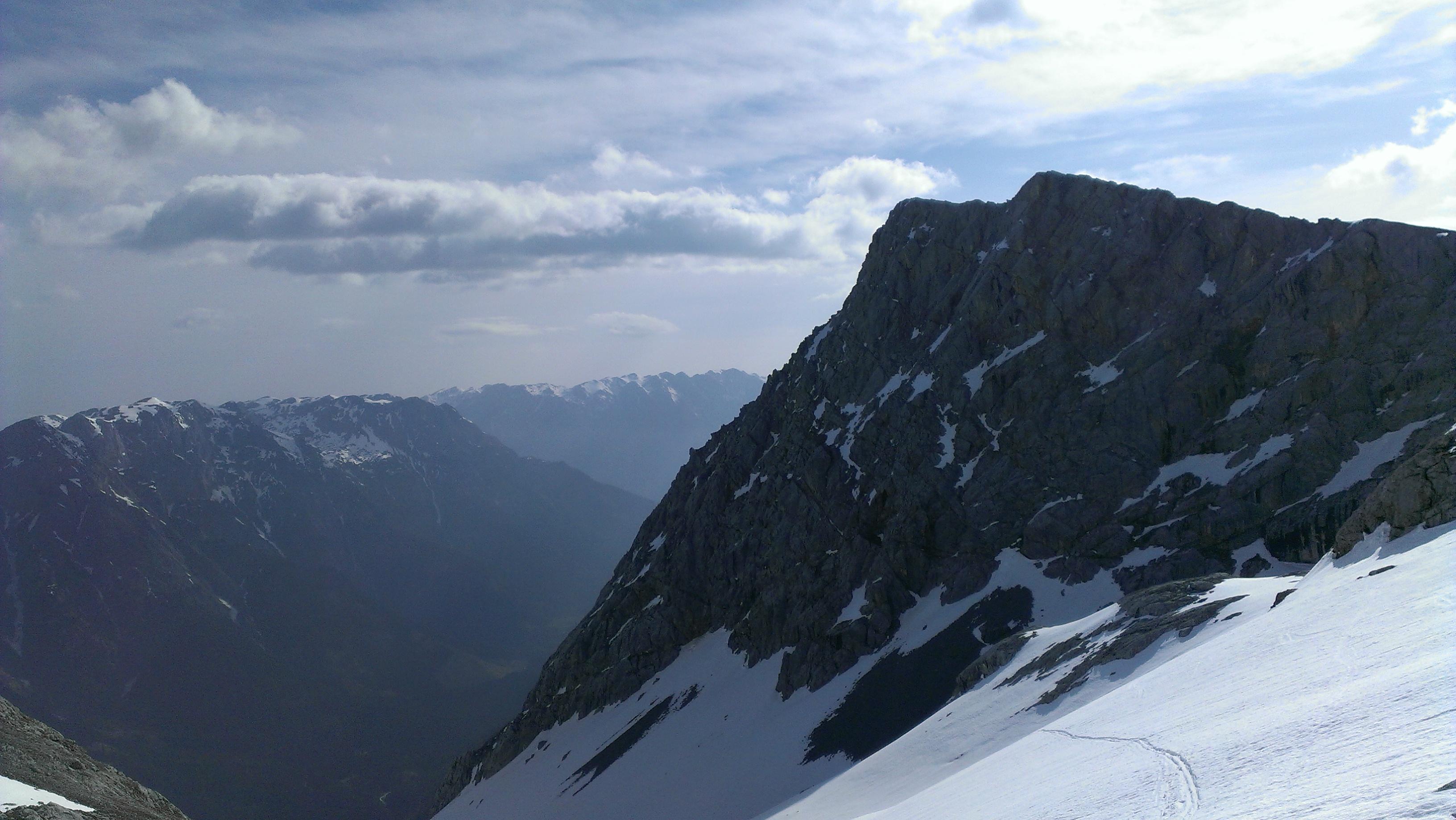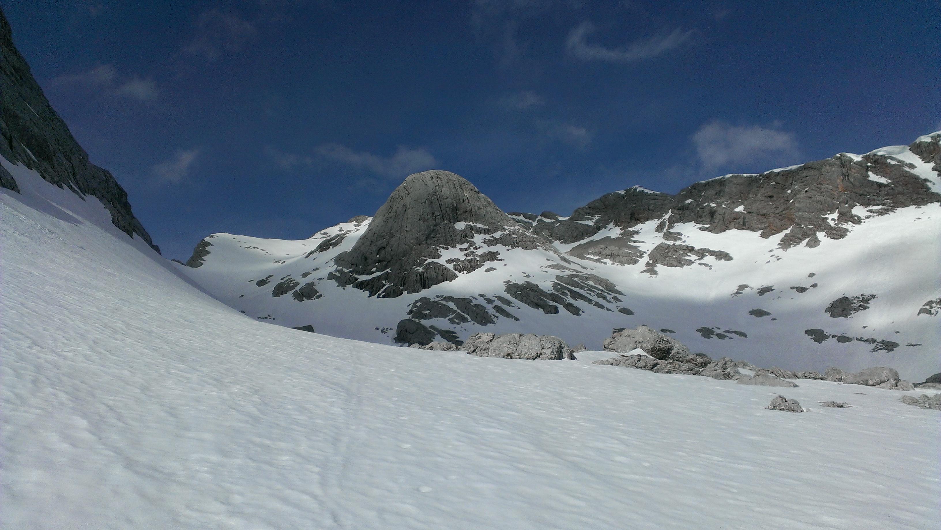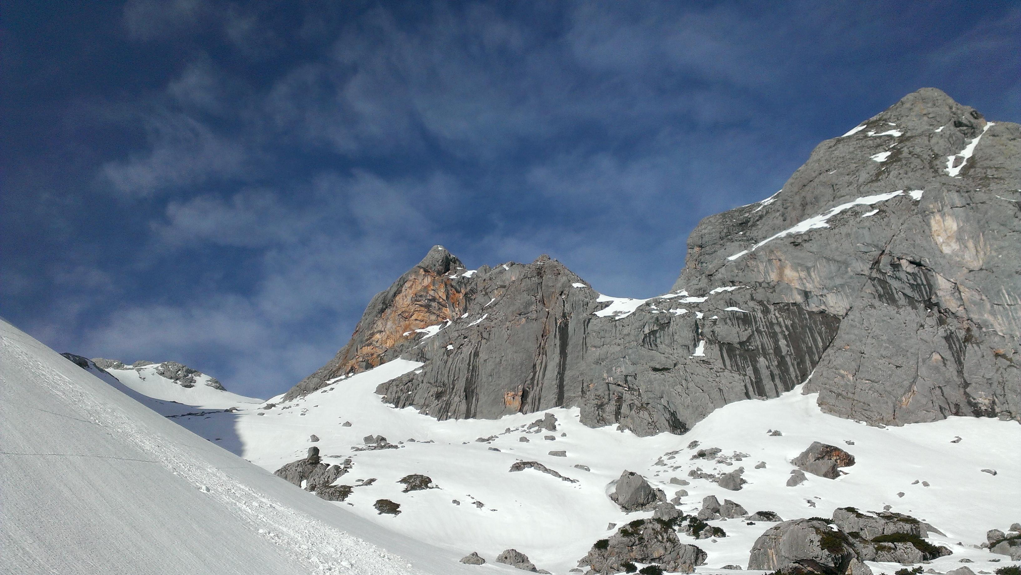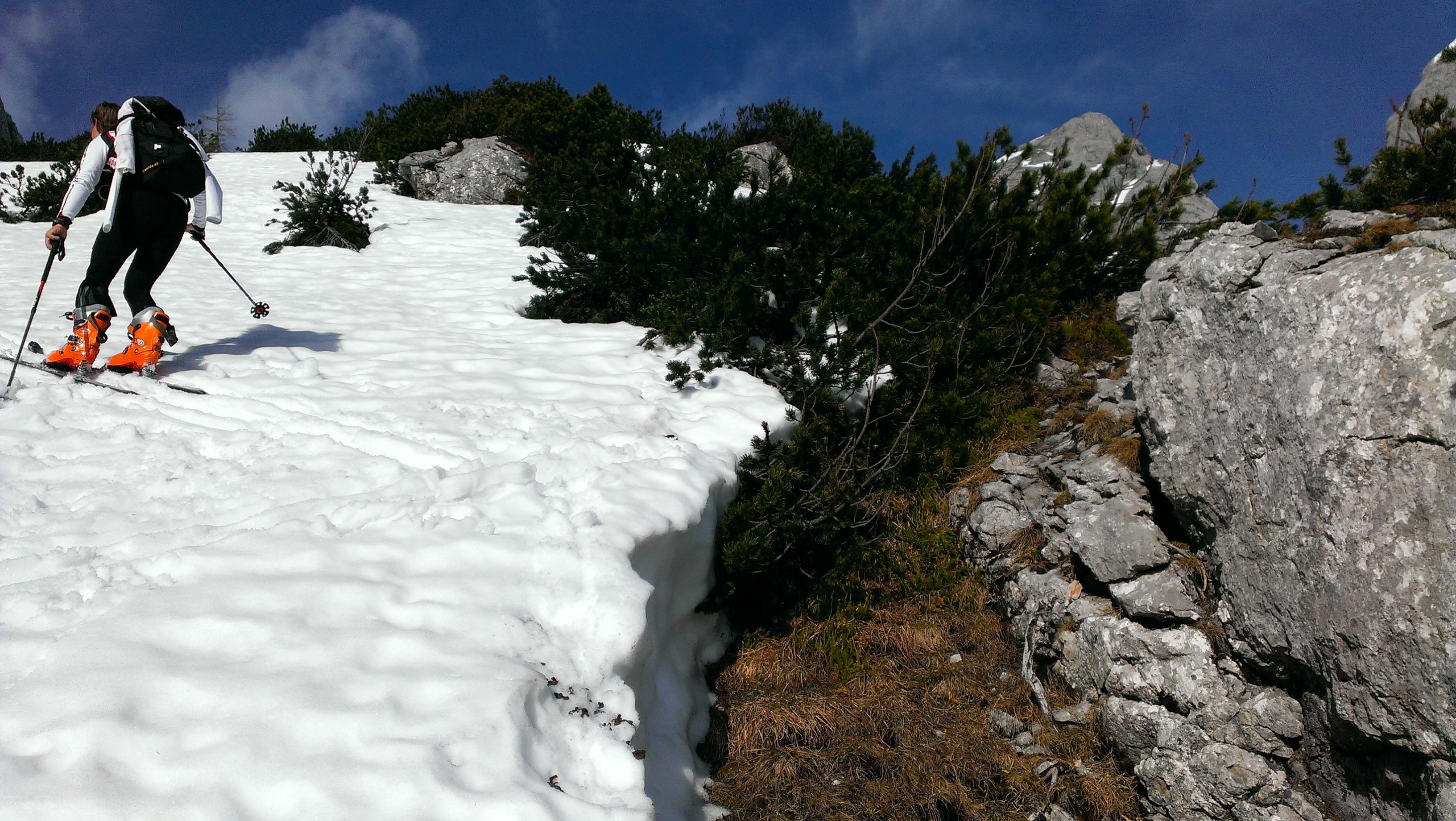 Durch die sehr warmen letzten Tage hat sich die Schneedecke bereits ziemlich weit zurückgezogen. Die Oberfläche ist, bis auf die hart gefrorenen Schattenhänge, sehr weich – immer wieder bricht man bei darunter liegenden Latschen oder Steinen ein. Je nach Linienwahl ist die Abfahrt trotzdem ein Genuss – zumindest großteils…