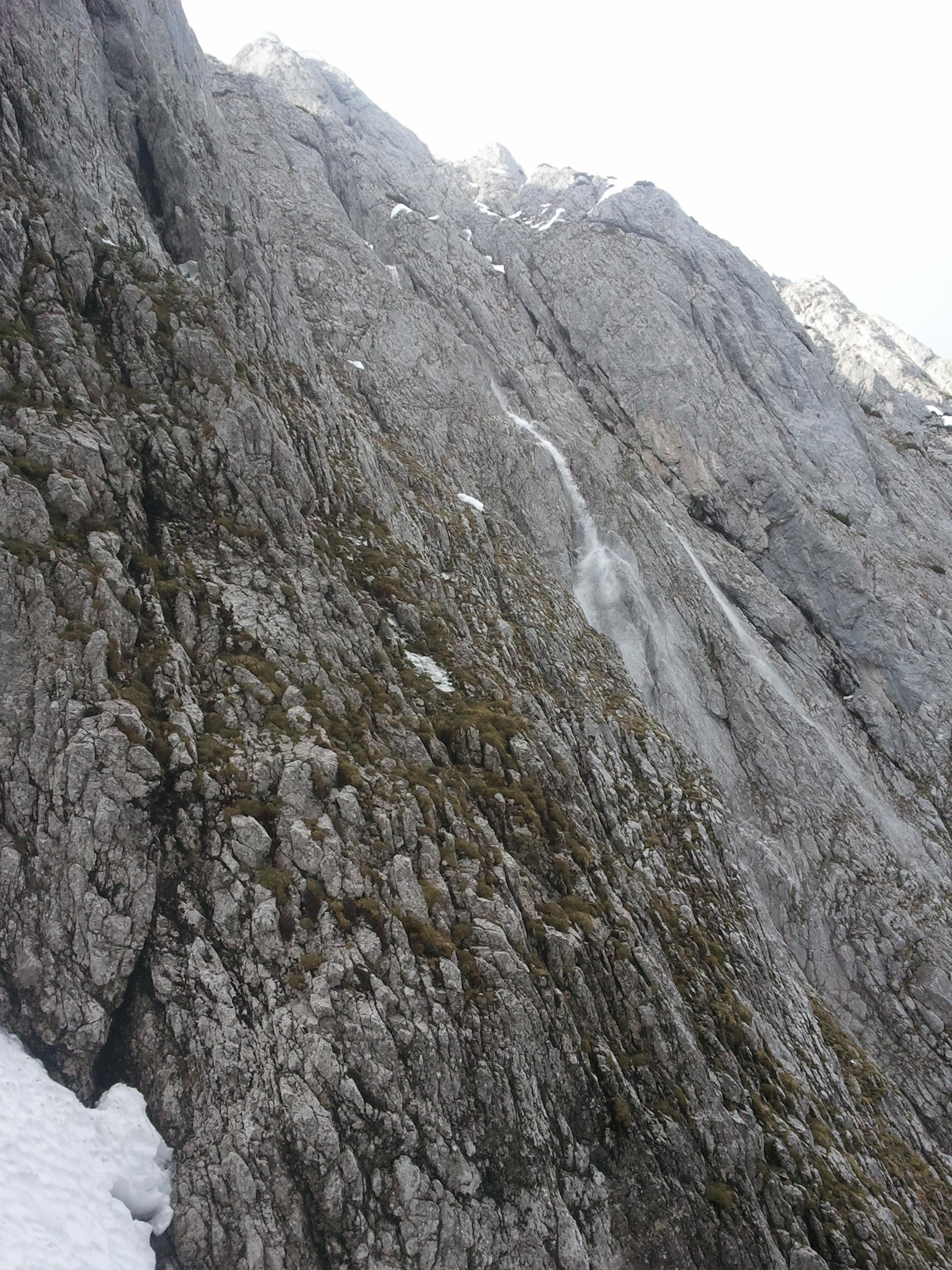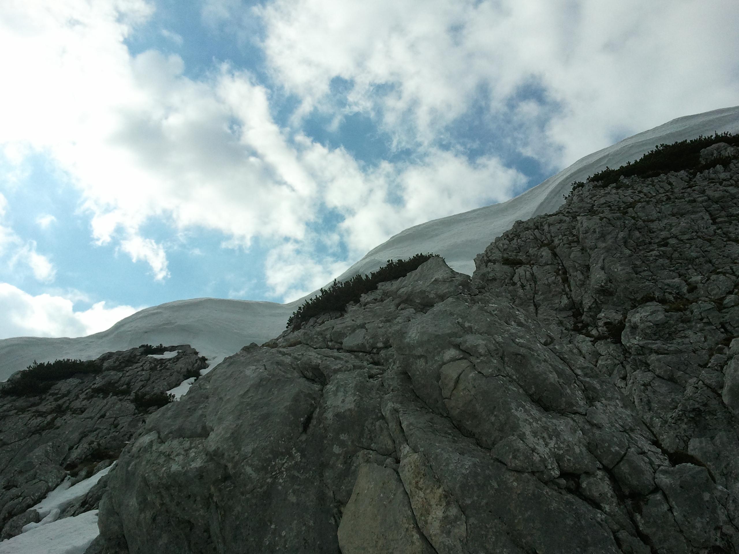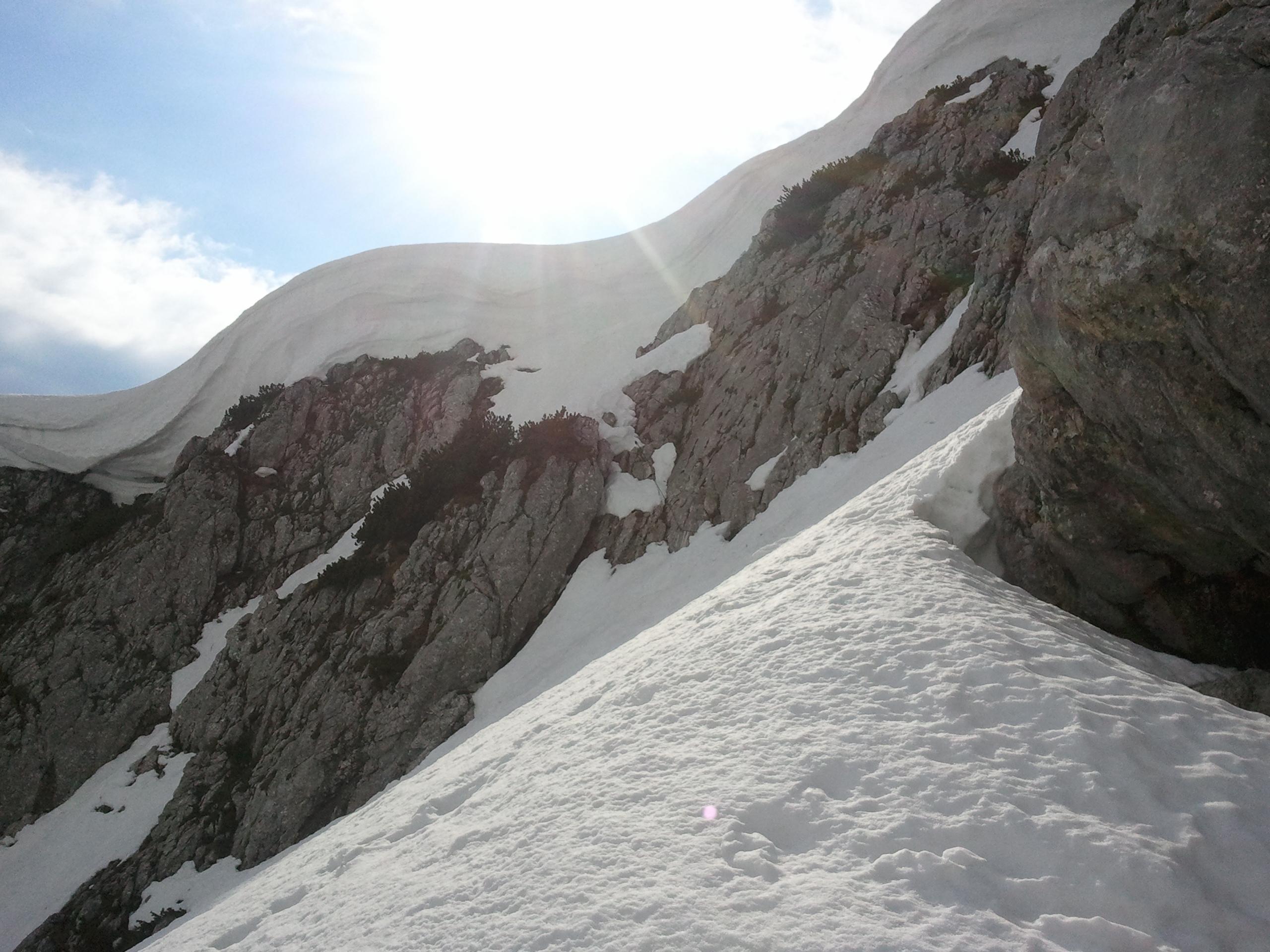 Aufstieg zum Donnerkogl durch grosse Wechten blockiert. Seilsicherung ist nur am Anfang frei.