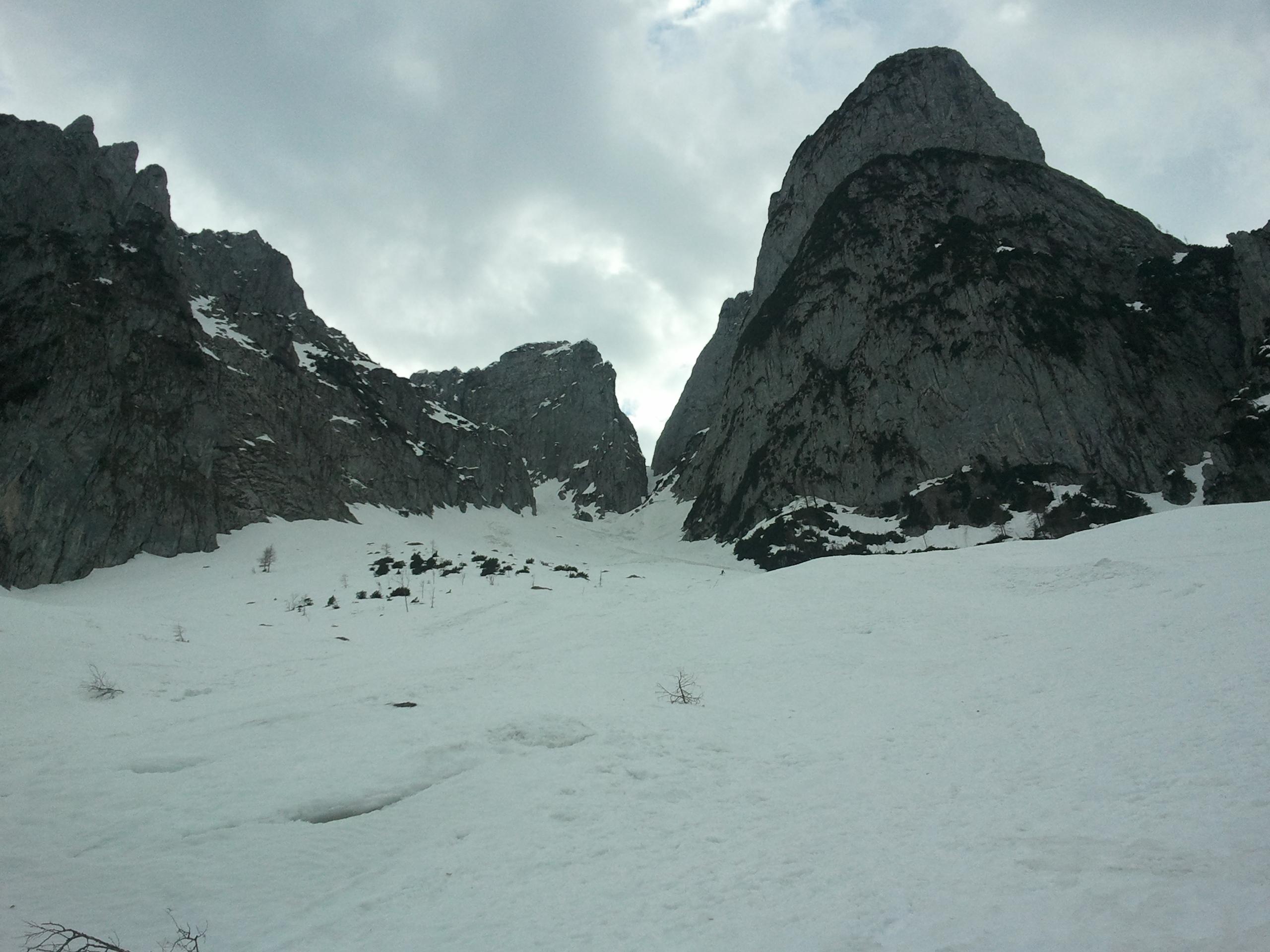 auf den letzten 30Hm bis zur Scharte ist er noch durchgängig da. Nur ab und zu kommt ein wenig Schnee mit Steinen von den Flanken herunter, alles noch harmlos. Große Wechten versperren den Weg zum Donnerkogl, die Seilversicherung schaut nur auf den ersten Metern aus dem Schnee. Aufstieg zum Steinriesenkogl problemlos. Abfahrt um 16.30 Uhr in der Goasriesn trotz Lawinenbahn noch o.k., weil alles ziemlich weich ist. In der Steinriesnn ist es gut zum fahren. Man kann fast noch bis zur Staumauer abfahren.