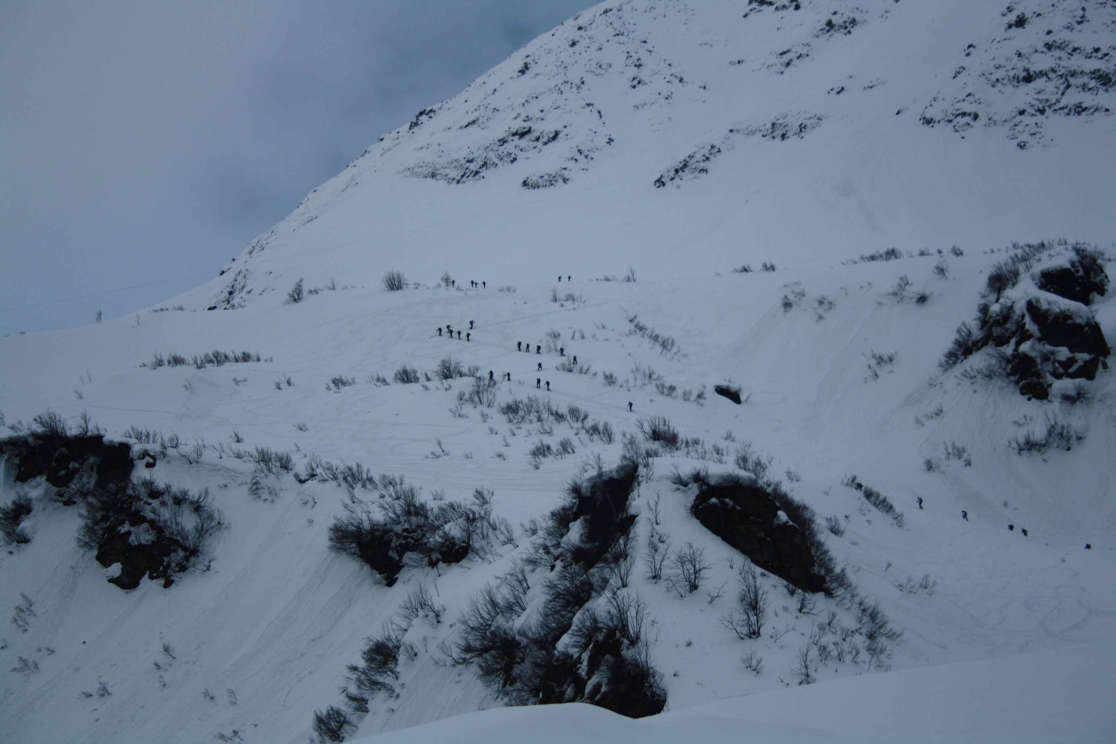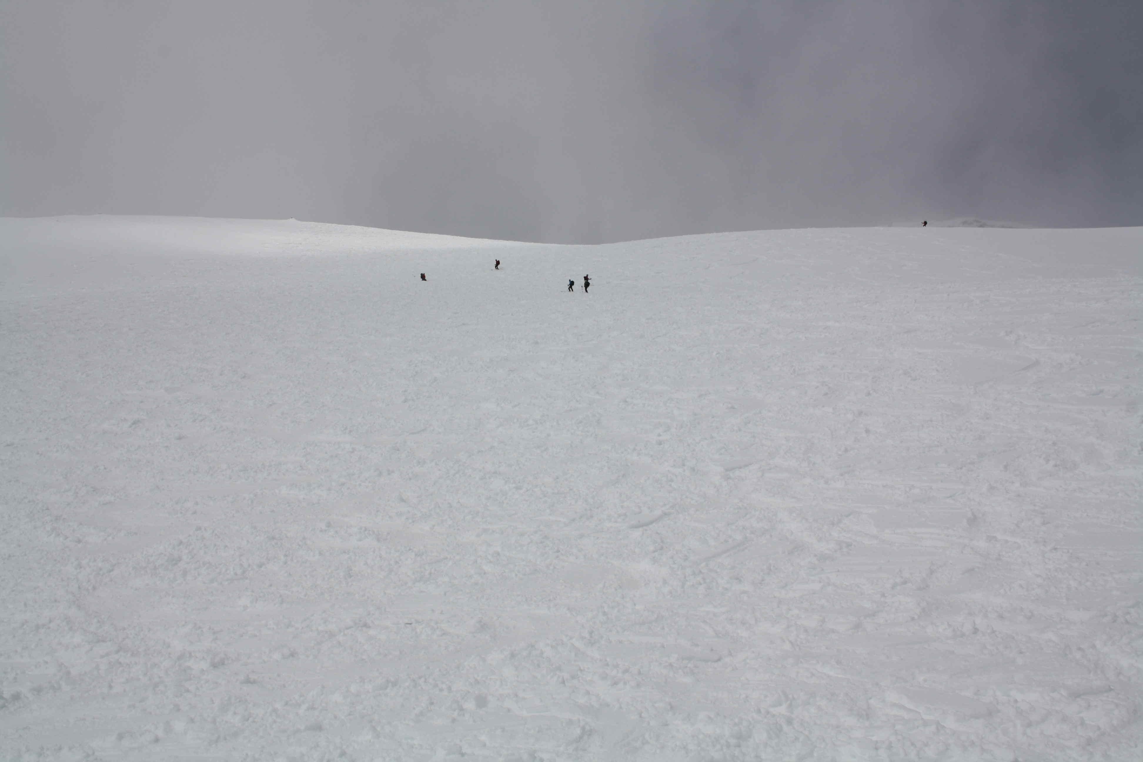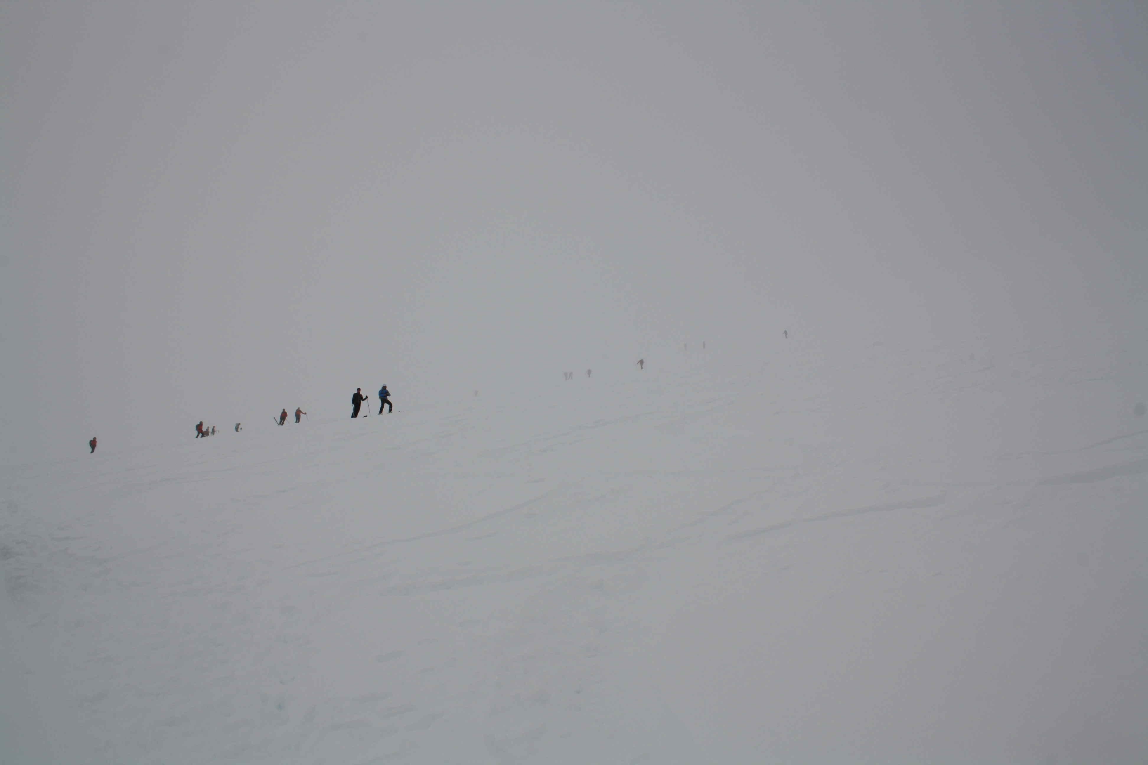Im Aufstieg brechender Harschdeckel. Die zeitig Abfahrenden haben alle mit dem Bruchharsch gekämpft - ich habe mit Zeit gelassen - mit der Hoffnung, das das diffuse Licht ausreicht, die Oberfläche zu erweichen.