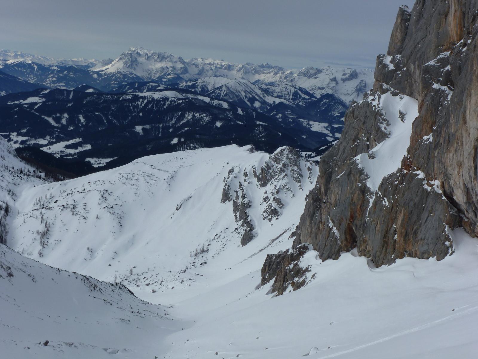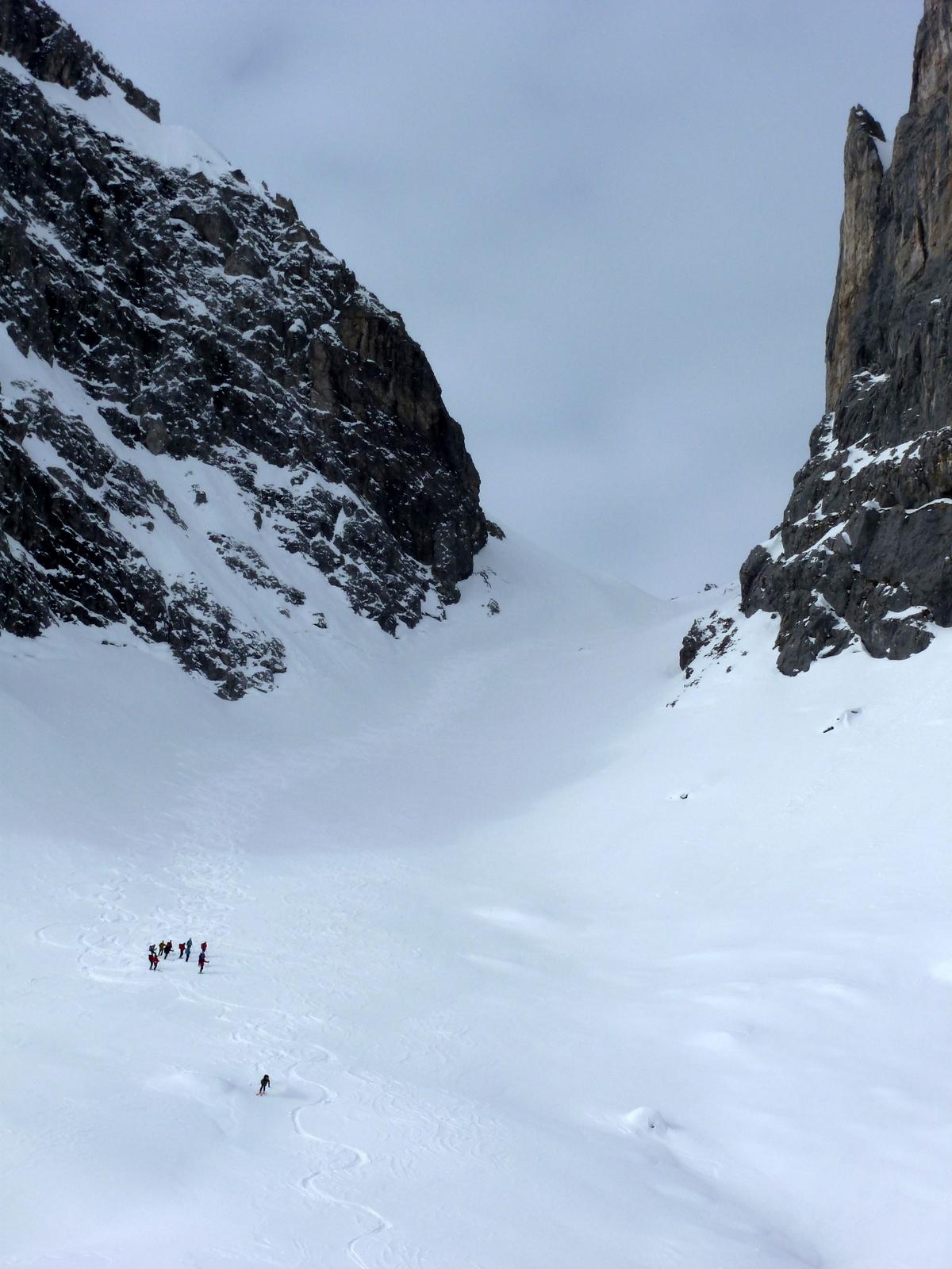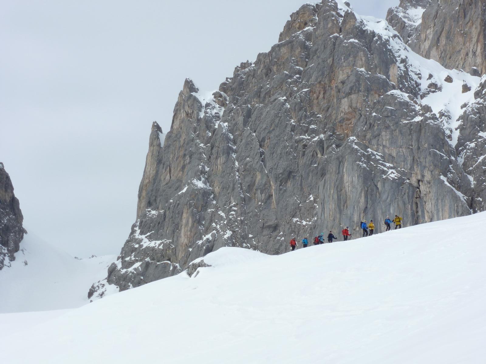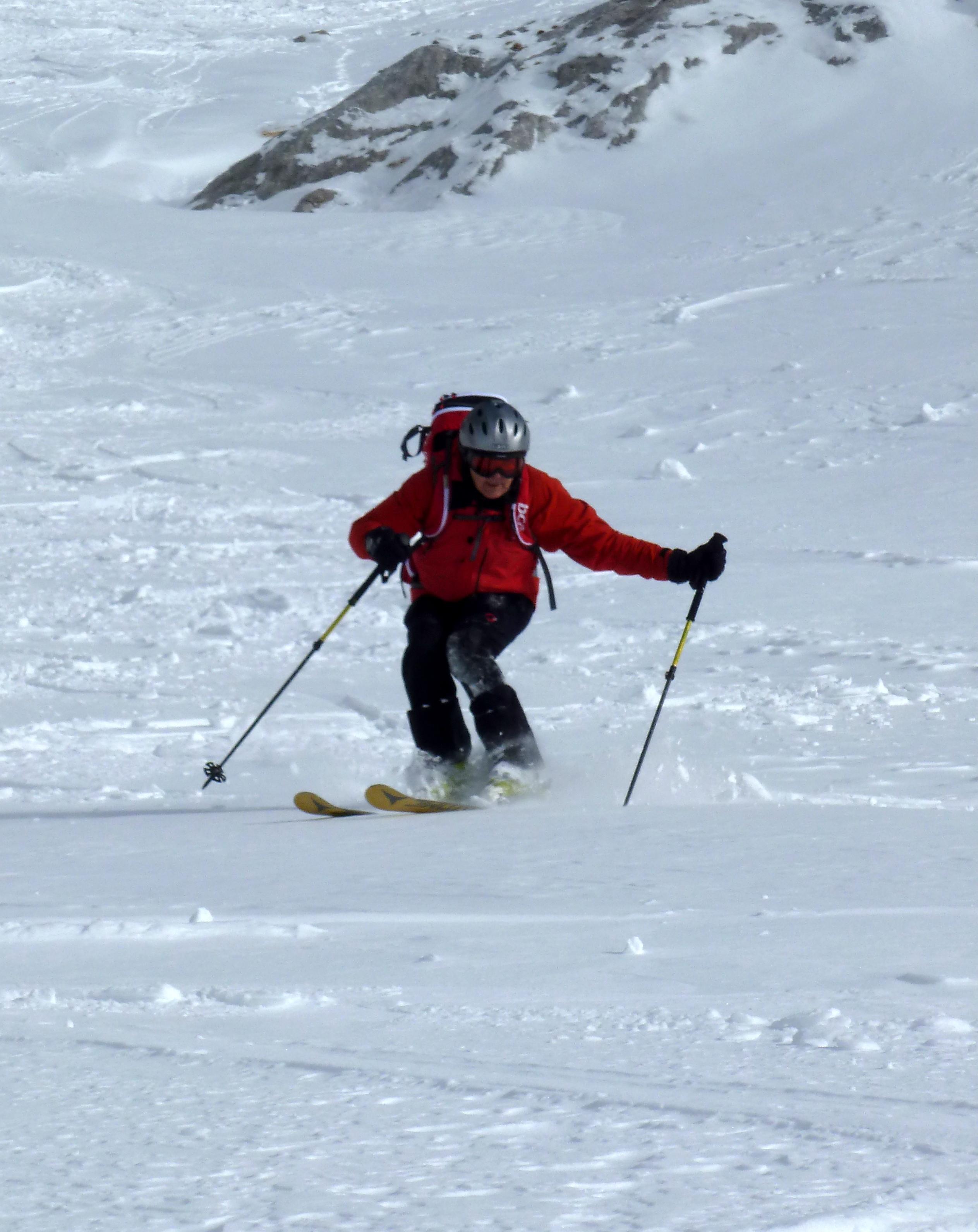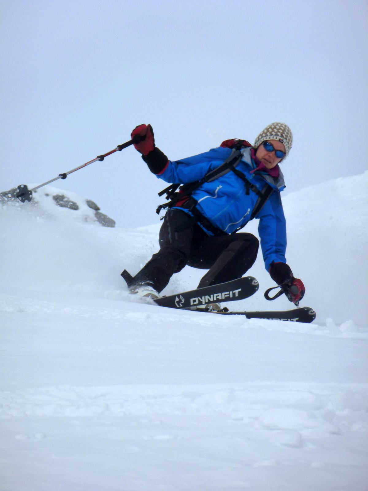 Anstieg wie ins Windlegerkar, wir bogen jedoch bald nach Osten in die Mulde nördlich des Raucheck-Gipfels ab. Die Windarbeit ist allenthalben unübersehbar, die Neuschneeauflage fast durchwegs windgepresst oder verfrachtet, an sonnexponierten Hangabschnitten dünner Harschdeckel. Der Skigenuss hielt sich heute in überschaubaren Grenzen, nur der Osthang unterm Tor war in den mittleren Abschnitten noch nicht vom Wind geküsst.