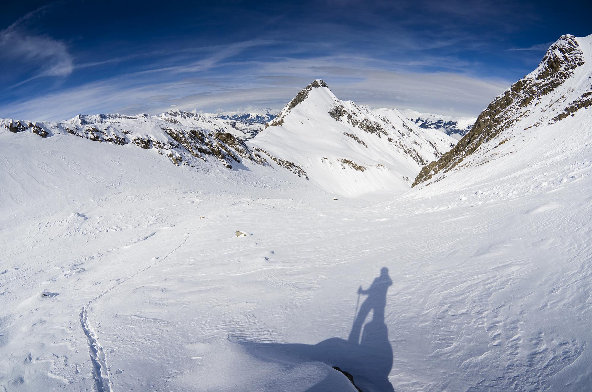 Wegen Schneebrettgefahr bin ich heute weit genug unterhalb des Gipfelgrats im Rattensbachtal auf ca 2400m umgekehrt. Über 2000m Höhe hat der Wind den Schnee verfrachtet, gepresst und misshandelt. Und gestern: Da konnte ich in direkter Nachbarschaft (ca 1km Luftlinie von hier!) vom Gr. Schmiedinger ins obere Mühlbachtal abfahren, im spannungsfreien nahezu windunbehandelten Pulverschnee !