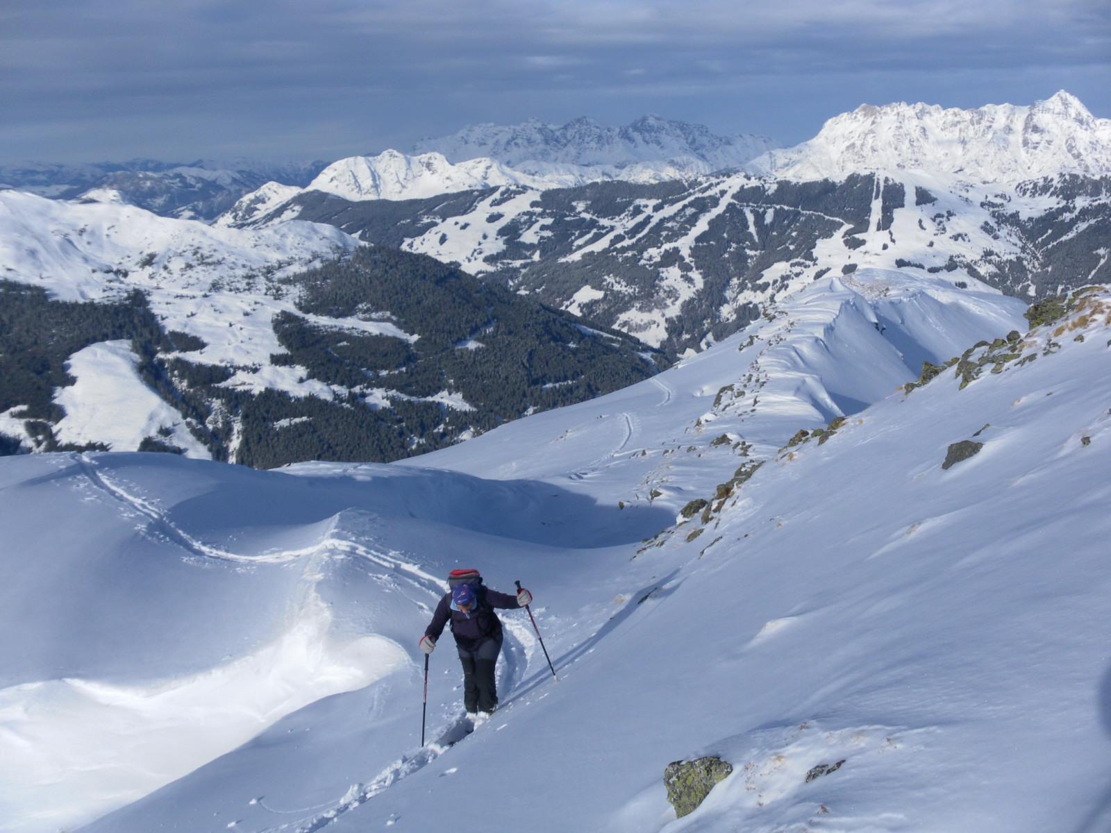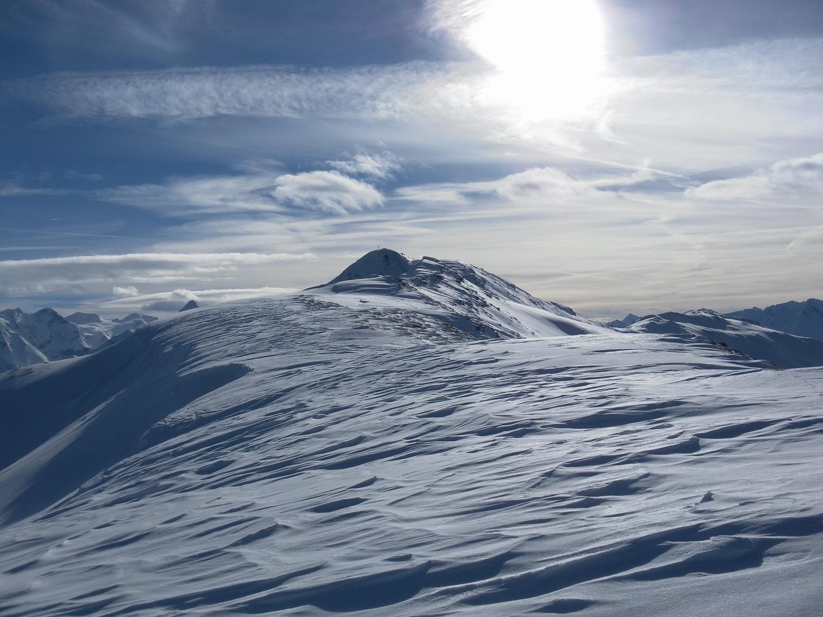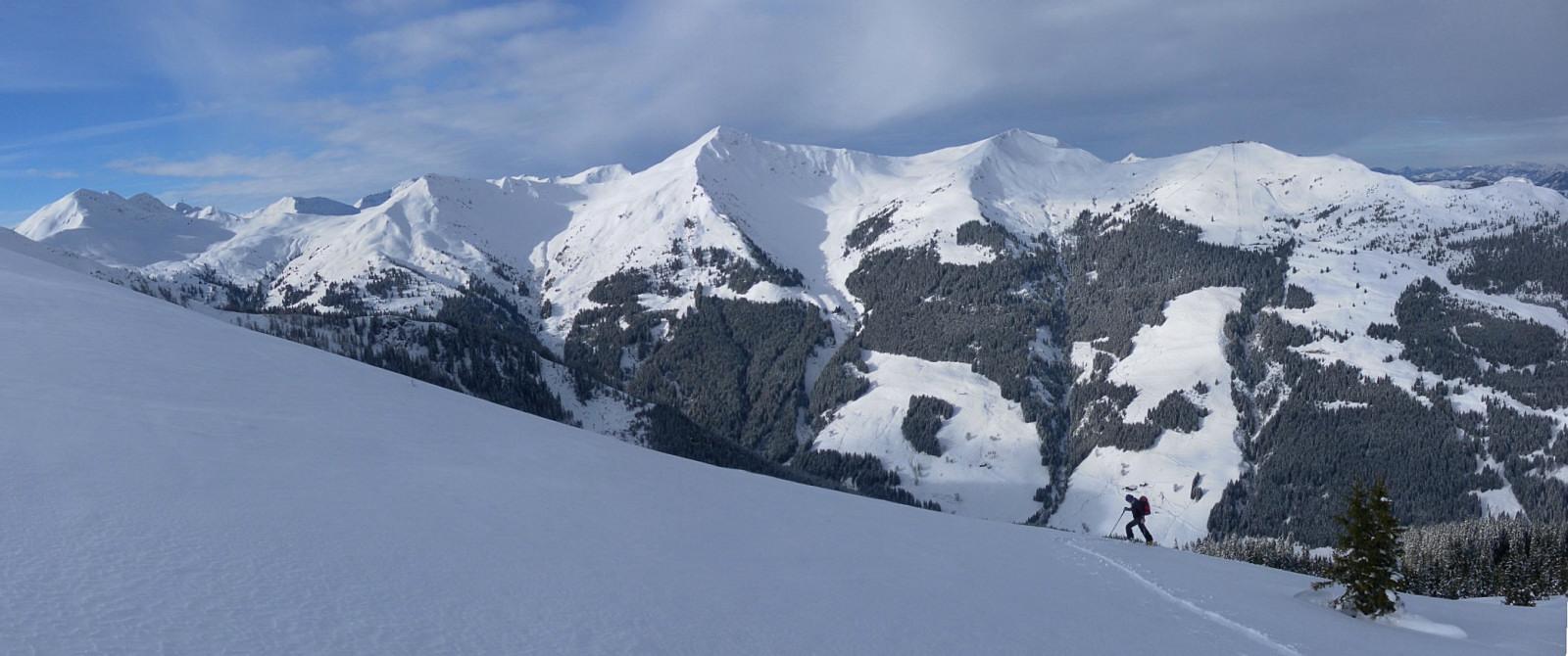 Die talnahen Almwiesen haben 10cm ungebundenen Pulverschnee auf glattem Harsch und sind daher anstrengend rutschend zu überwinden. Dann ein ewig langer flacher Forstweganstieg. Im Kammbereich teils kräftig abgeweht oder nur wenig schon leicht angefeuchteter Neuschnee ohne nennenswerte Schneeunterlage. Spezialabfahrten sind noch nicht ratsam, viel Steinkontakt.