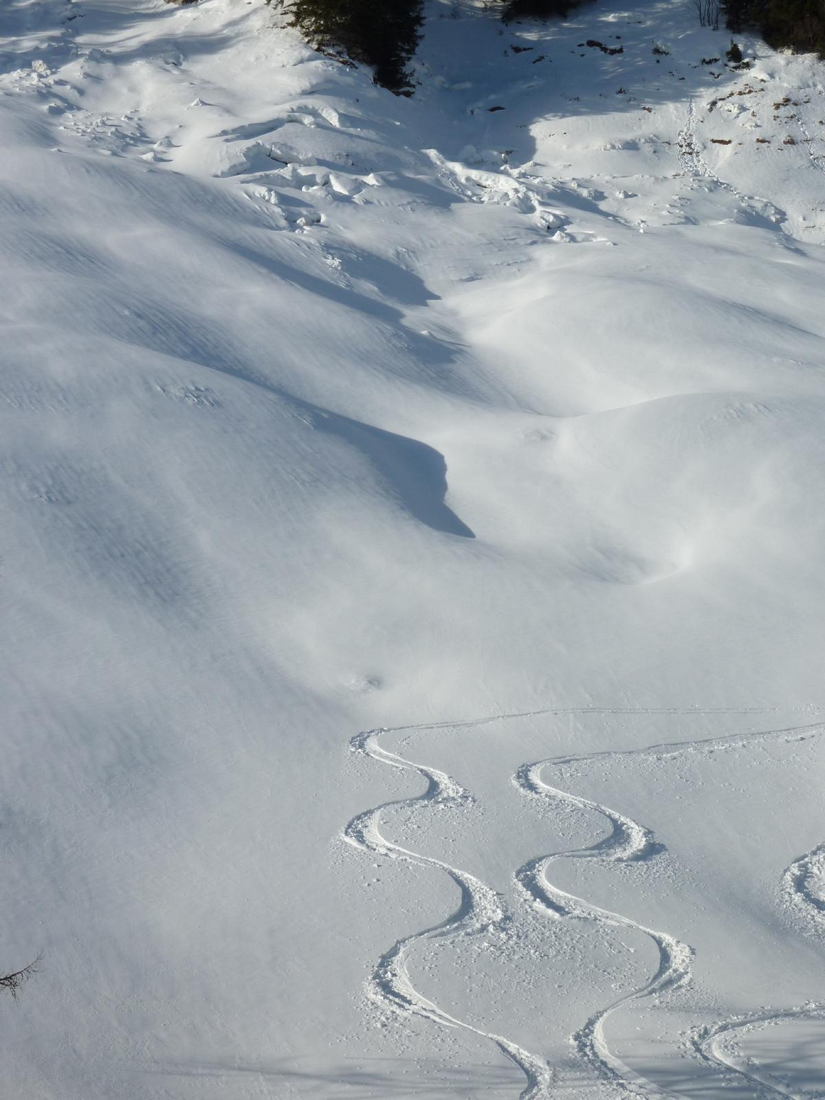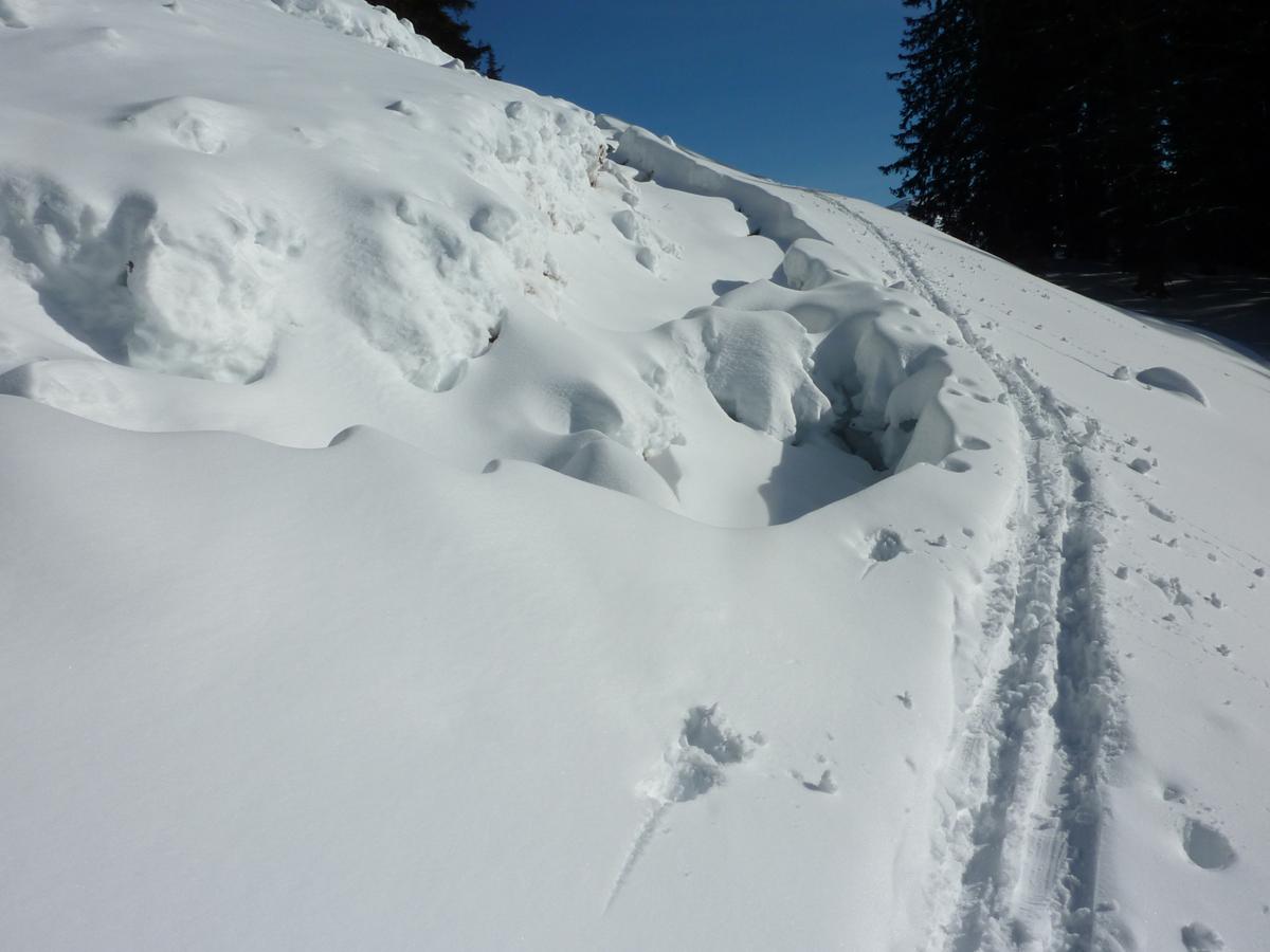 Schneedecke unter dem Neuschnee stark gesessen, schattseitig auch gefroren und eher stabil.