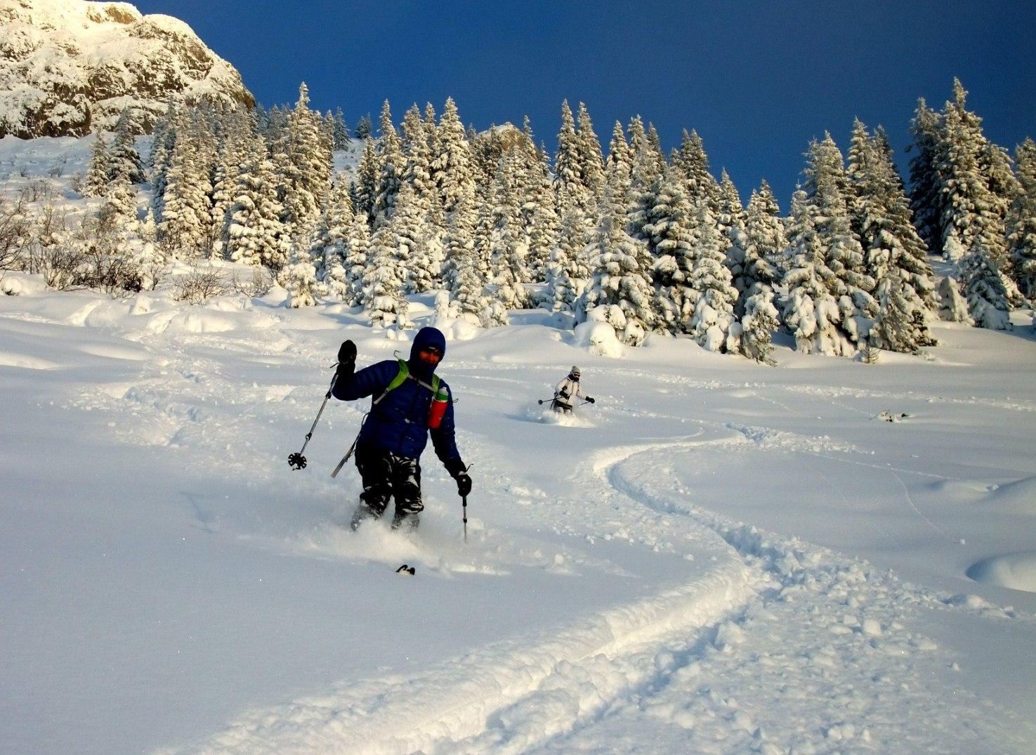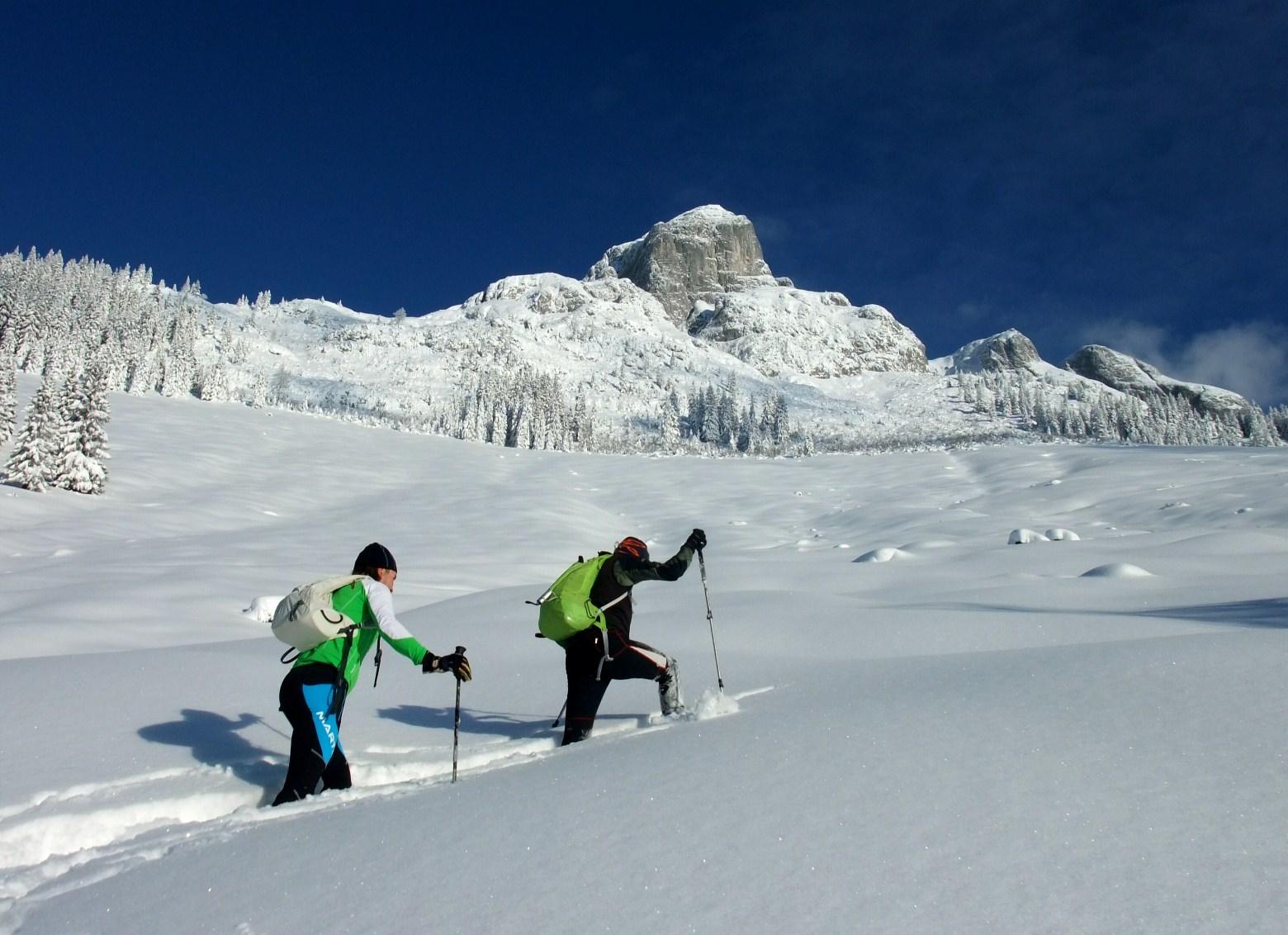 Die Schneekanonen der Menschen sind mikrig, aber wenn Gott drei Tage seine Schneekanonen einschaltet, dann ist was los! Beim letzten Nordstau bekamen wir im Gosaukamm 1m lockeren Neuschnee. Derzeit ist das Spuren noch sehr kraftraubend, aber mit der kommenden Erwärmung wird der Setzungsprozess schleunig fortschreiten. Zumindest ist jetzt eine gute Grundlage da und alle Touren, die in erster Linie Grasmatten als Unterlage haben, sind schon bestens machbar.