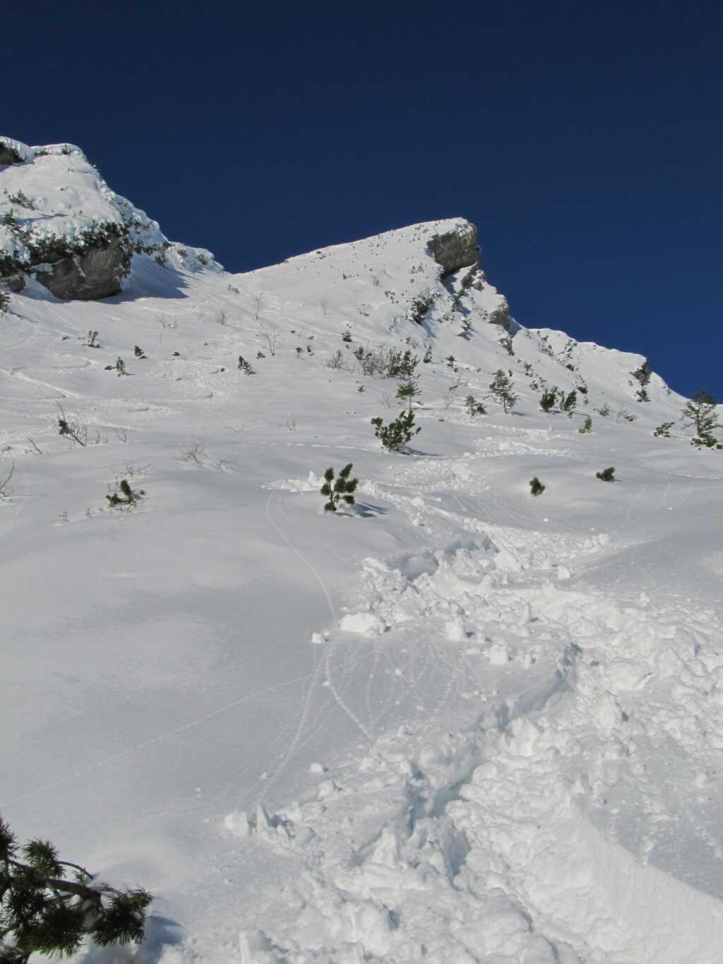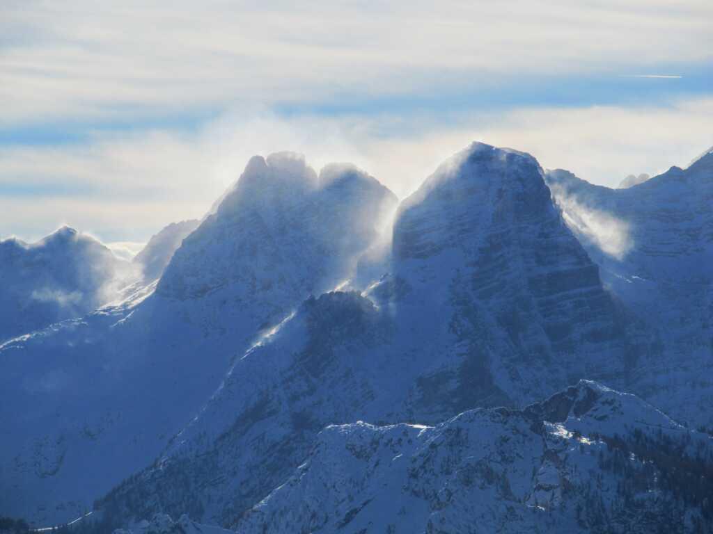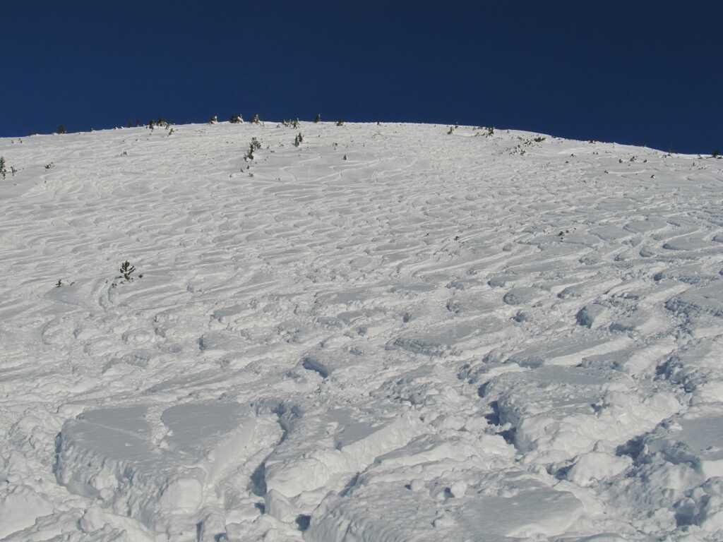 Wetter: Föhnig aufgeheitert, oben lebhafter S-Wind, der aber kaum mehr den gesetzten Schnee verfrachten konnte. Schneeverfrachtung im Hochgebirge oberhalb ca. 2000m deutlich erkennbar.