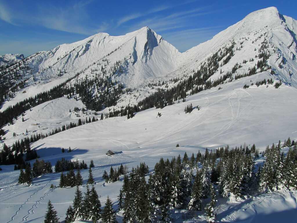 Schneelage: Tal ca. 60-80cm Pulver, Hochalmbereich ca. 60-100cm, ganz oben je nach Windeinfluss wieder etwas weniger. Die Latschen am So-Horn und Hirscheck sind ziemlich zugeschneit und kein großes Problem bei der Abfahrt. Auf der ganzen Tour keine Steinberührung. Alle Abfahrten sind schon ziemlich verspurt.