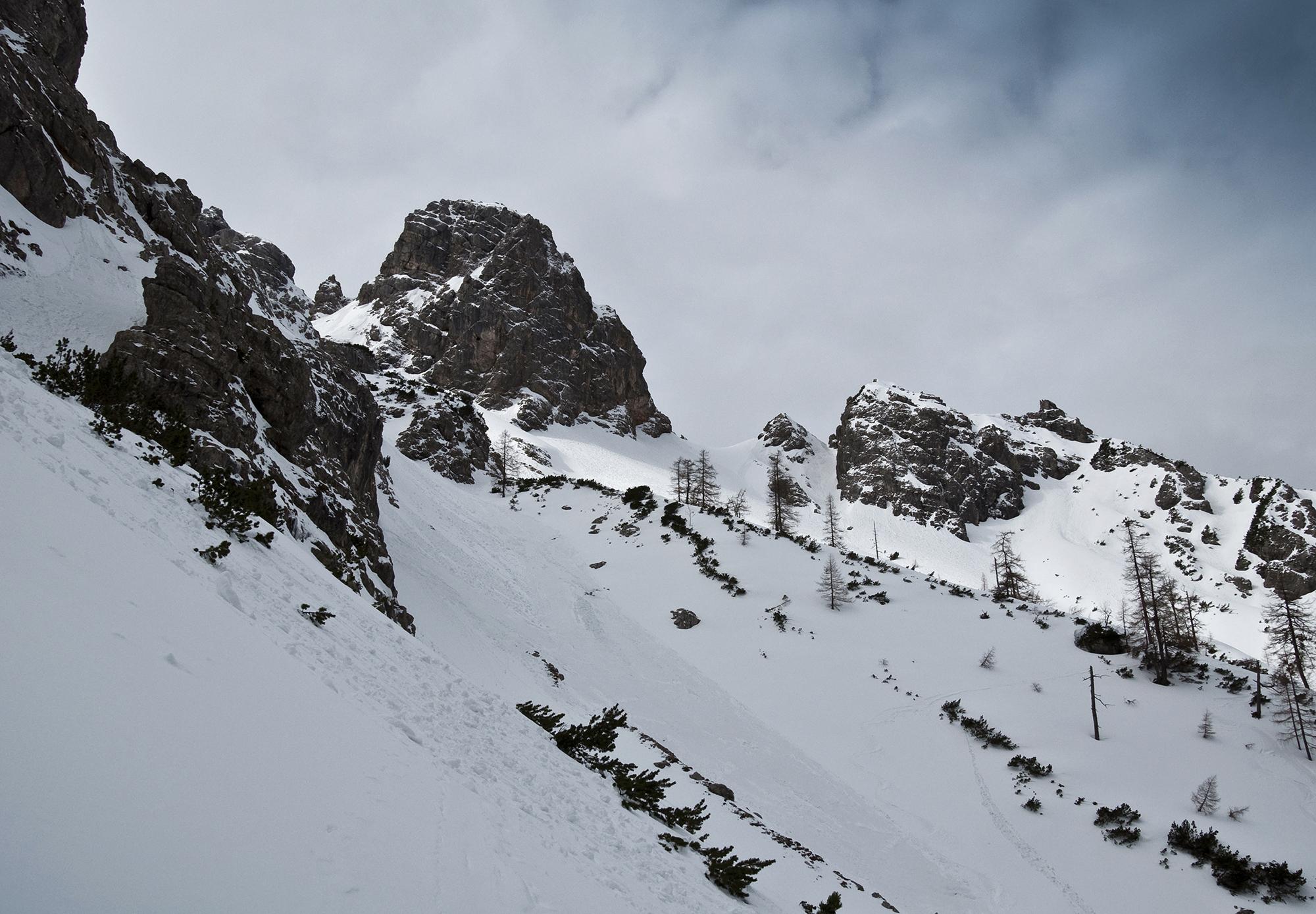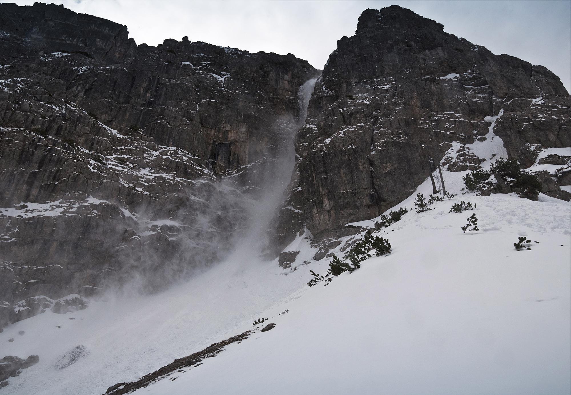 Als ich bereit zur Abfahrt bin, rauscht zur Bekräftigung eine Lawine neben mir in die Rinne. Nasse schwere Knollen rutschen abwärts, dazu noch ein erstaunlich hoher Staubanteil, der bis zu mir vordringt.