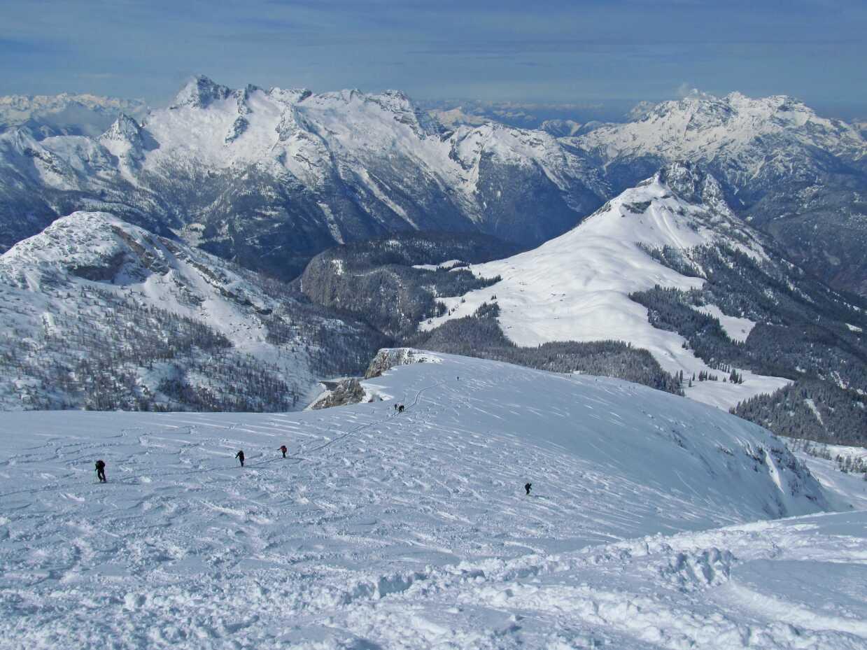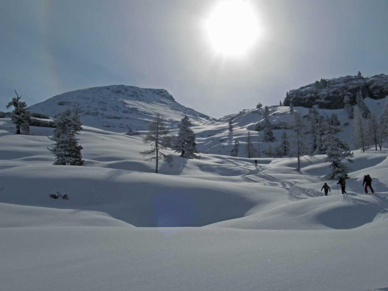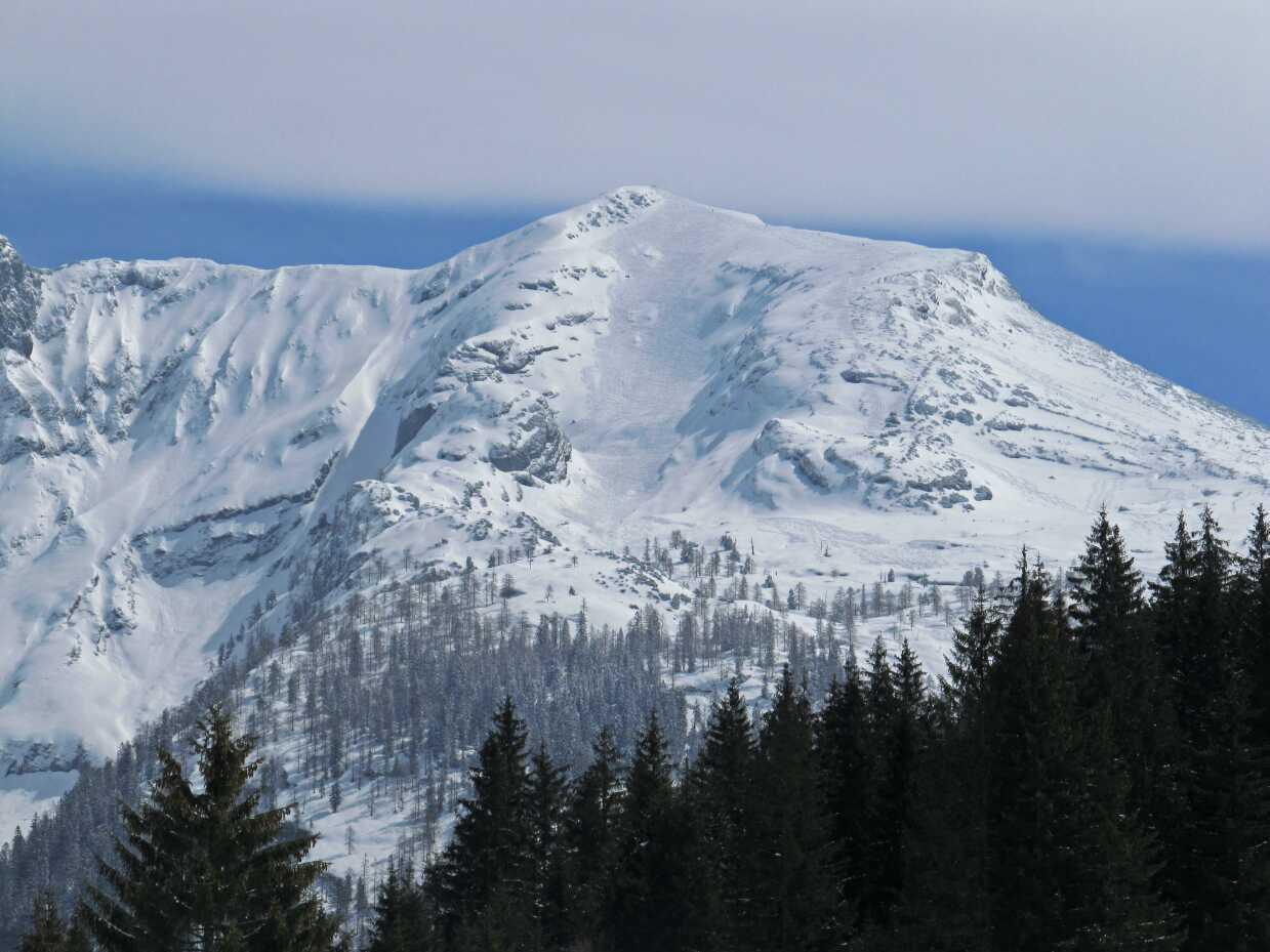 Schneelage: Auffahrtsstrasse Weissbach -> Hintertal schneefrei, nur im obersten Teil Strasse etwas glatt (mit guten Sommerreifen fahrbar). Am Parkplatz ca. 5-10cm Neuschneeauflage, oberhalb Ziehweg (1400) ca. 20-30cm auf gut gesetzter, gefrorener Altschneeunterlage. Unterlage durchwegs tragend. Gipfelrücken großenteils verblasen (Harsch), Abfahrt über die Rinne (Weißplatteret) bei sehr schönem Pulver, der in sehr steilen O-Hängen auf der Harschunterlage teilweise abrutschte (bei den vorhandenen Schneehöhen aber noch ungefährlich).