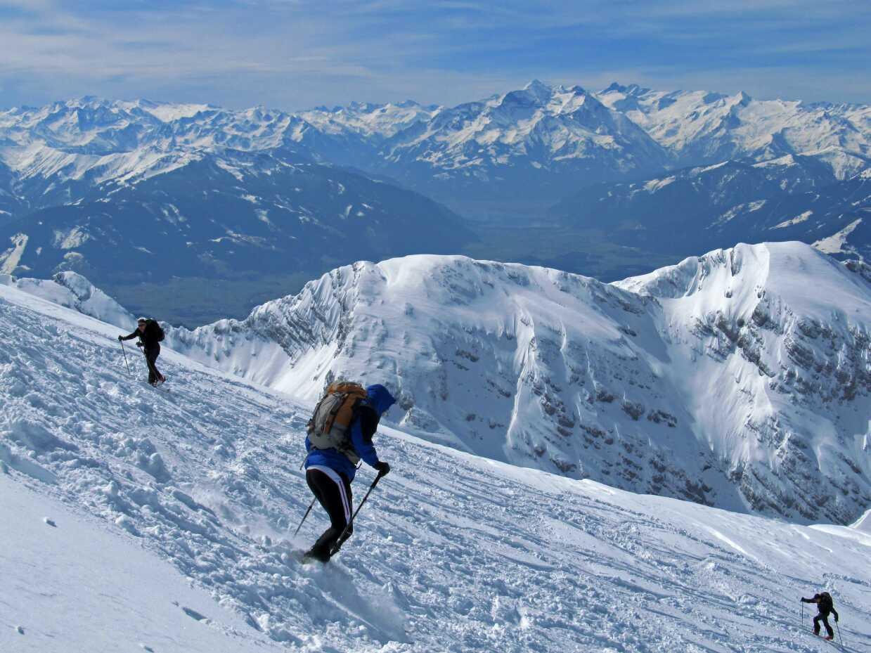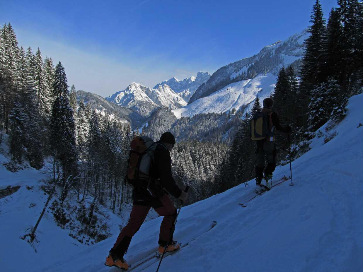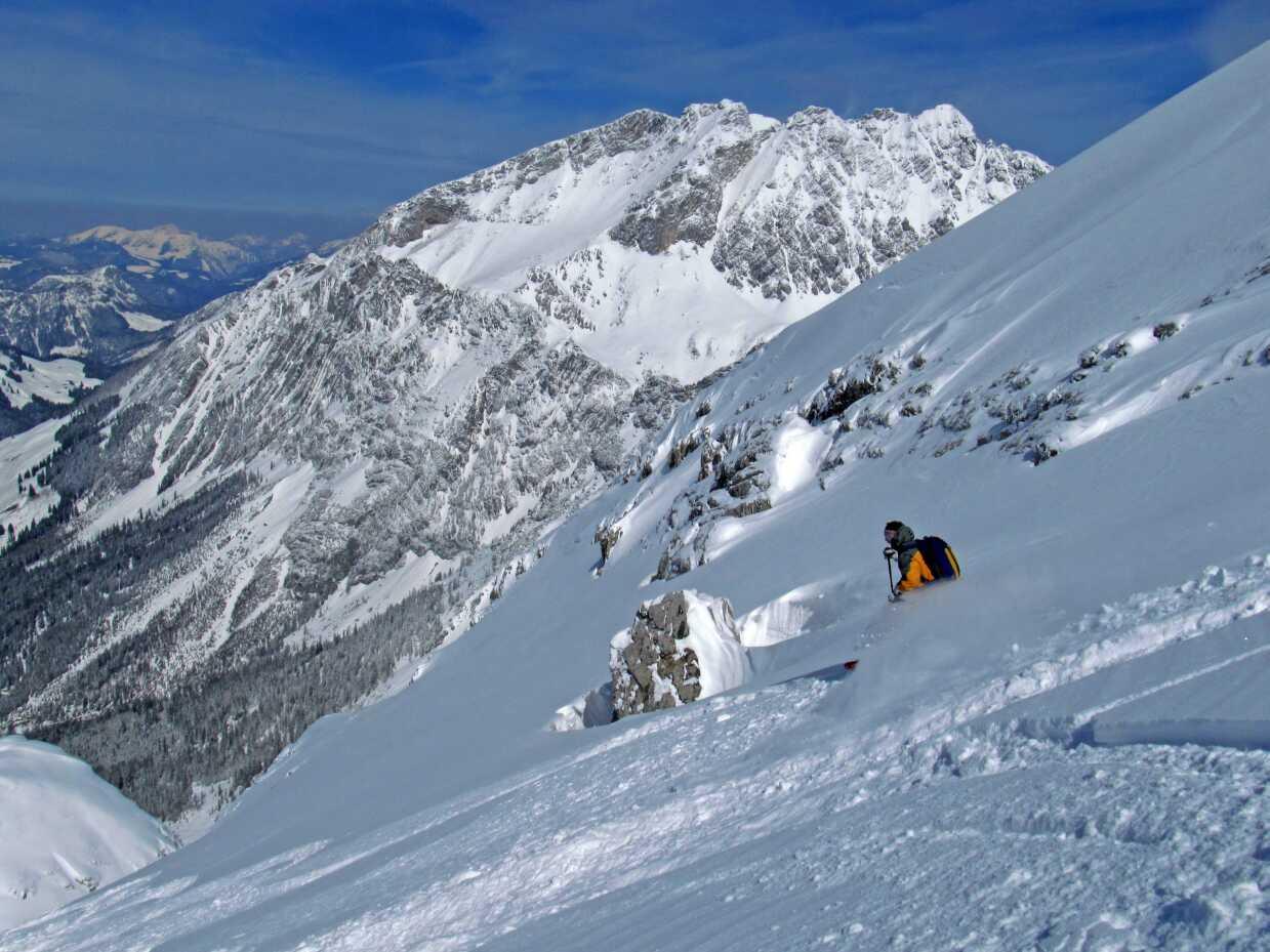 Schneelage: Auffahrtsstrasse Weissbach -> Hintertal schneefrei, nur im obersten Teil Strasse etwas glatt (mit guten Sommerreifen fahrbar). Am Parkplatz ca. 5-10cm Neuschneeauflage, oberhalb Ziehweg (1400) ca. 20-30cm auf gut gesetzter, gefrorener Altschneeunterlage. Unterlage durchwegs tragend. Gipfelrücken großenteils verblasen (Harsch), Abfahrt über die Rinne (Weißplatteret) bei sehr schönem Pulver, der in sehr steilen O-Hängen auf der Harschunterlage teilweise abrutschte (bei den vorhandenen Schneehöhen aber noch ungefährlich).