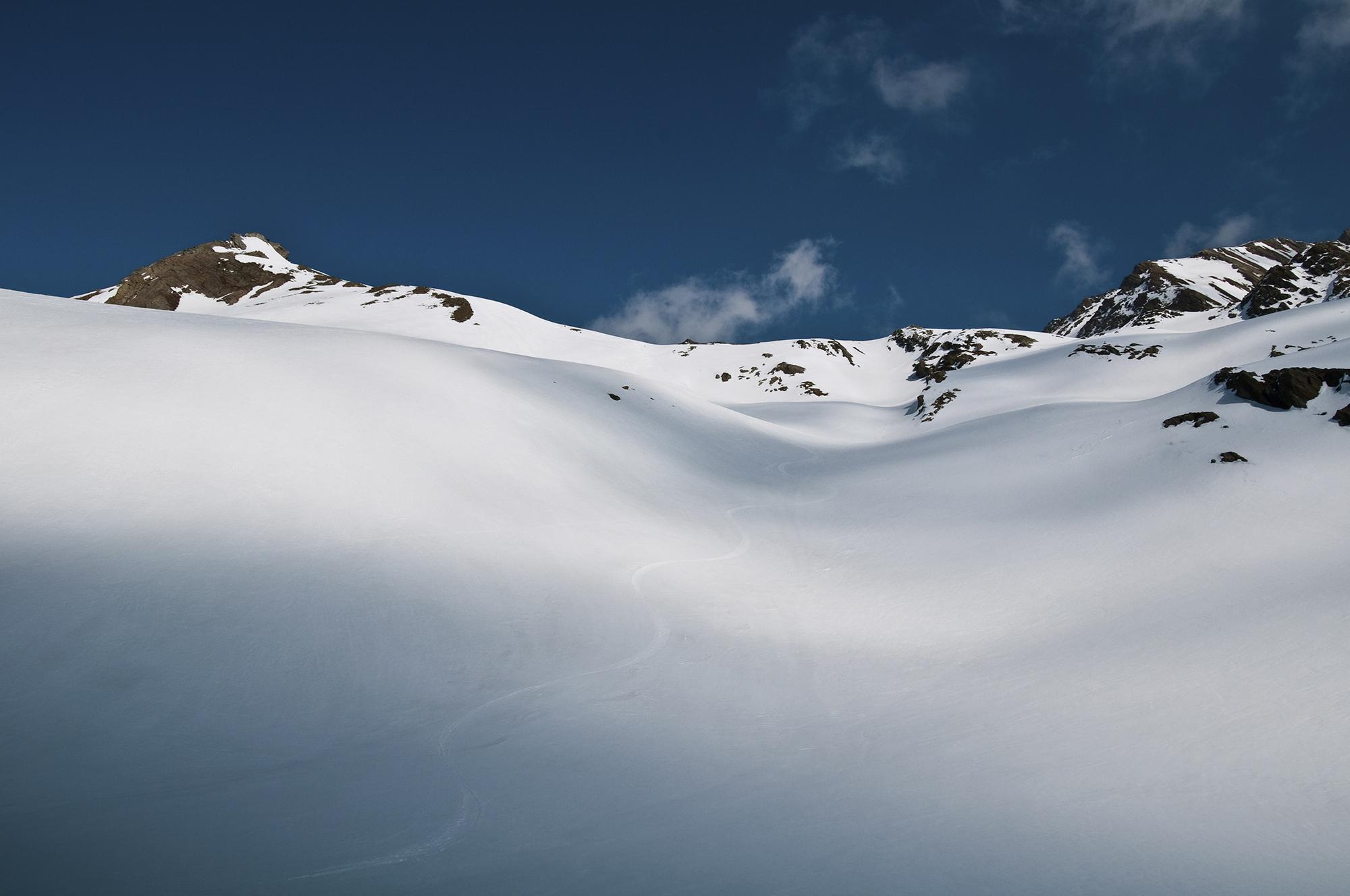Bei der Abfahrt am frühen Nachmittag kann man sich im abwechslungsreichen Gelände die Firnqualität aussuchen, es gibt viele Möglichkeiten, nirgends wird es tiefer als ca 5cm.