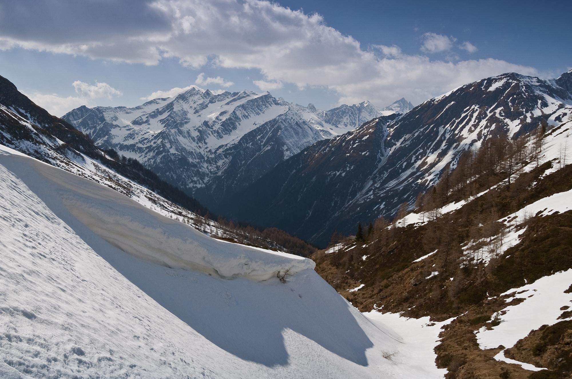 Erst unterhalb der Kessleralm wird der Schnee nasser. Die Abfahrt geht (Direttissima unter der alten Materialseilbahn!) noch erstaunlich weit hinunter.