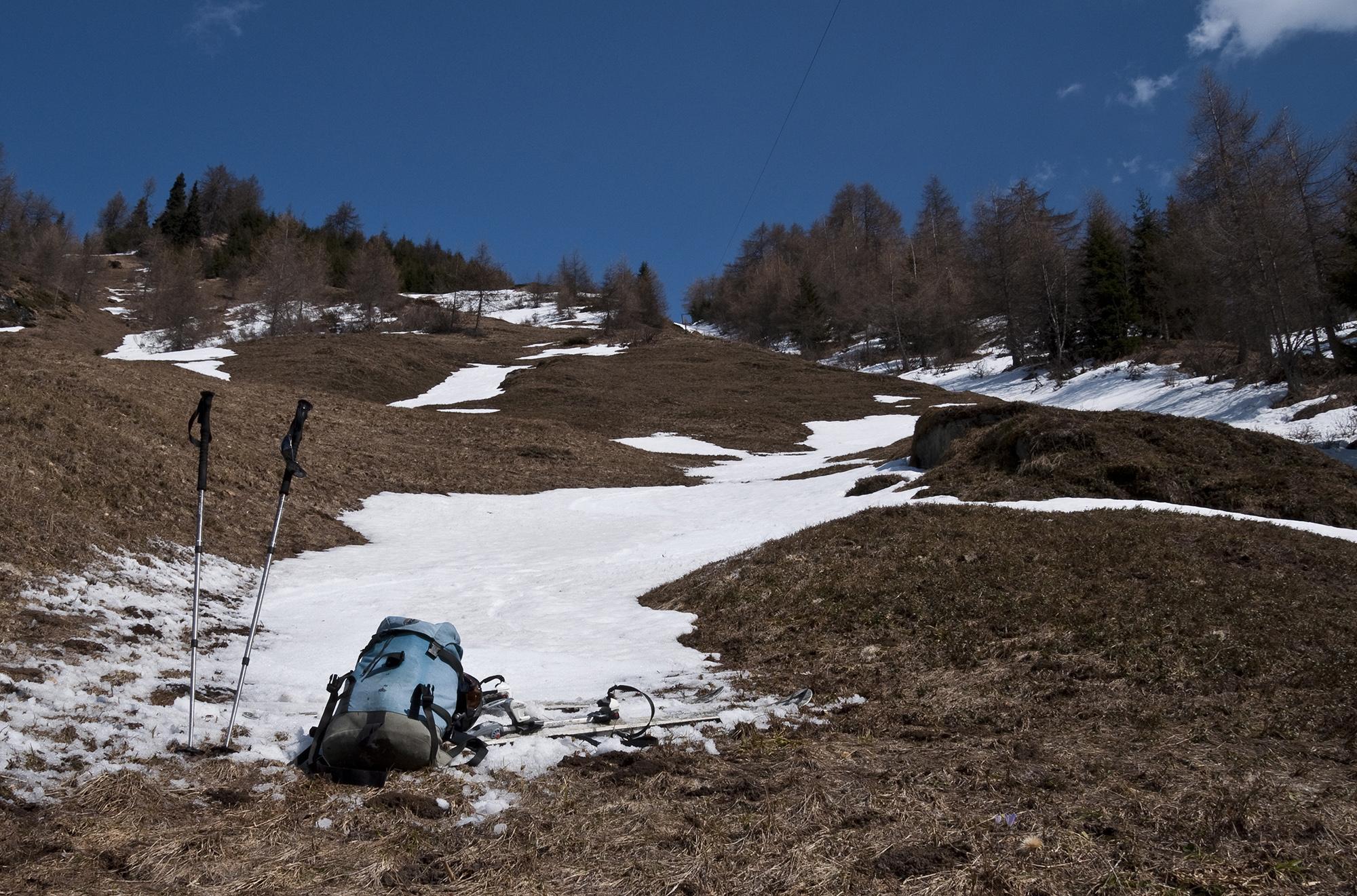 Die Steilstufe im Wald ist eisfrei, man braucht keine Steigeisen mehr! Dafür sind die schönen Hänge unter der Kessleralm auch recht aper.