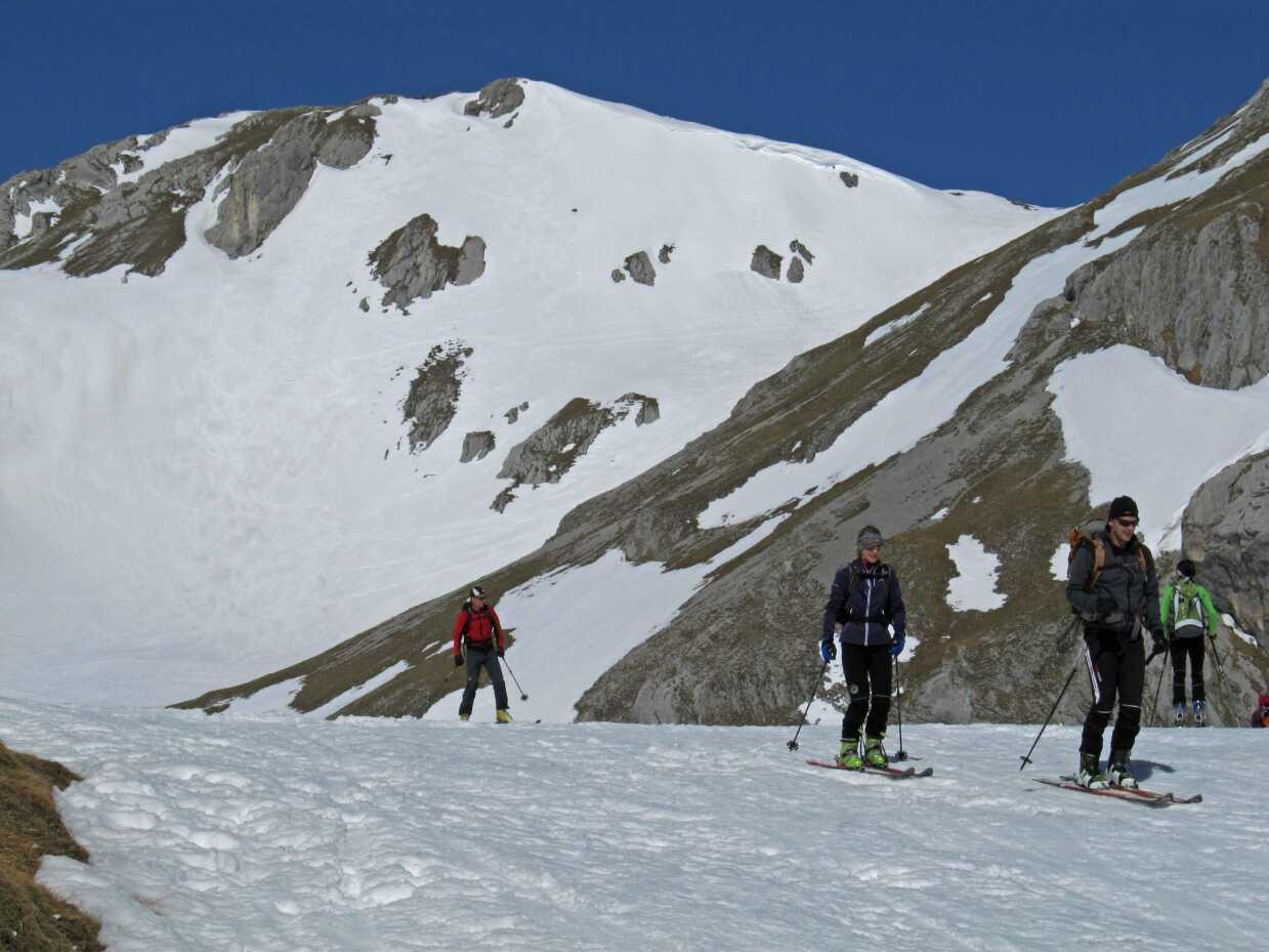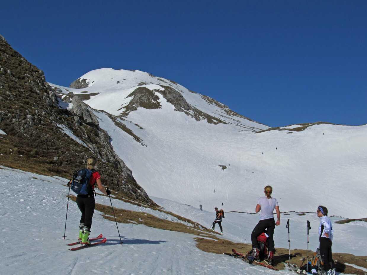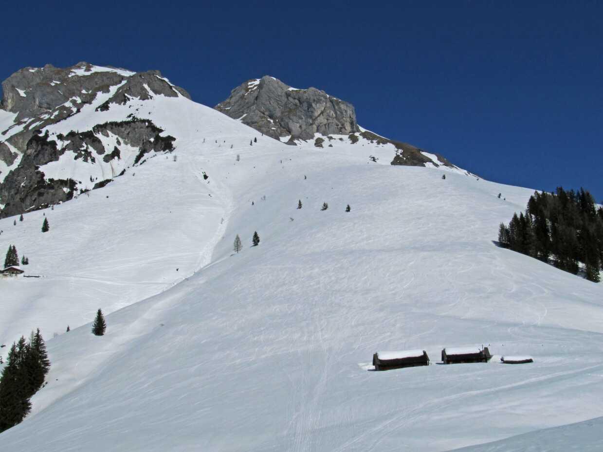 Schnee: Vom Tal weg in Massen vorhanden (im Tal >0,5m). Am Morgen tragender Harsch bis in die Sonne oberhalb der Hackelhütte, dann schon weich und gut ohne Harscheisen gehbar. Abfahrt um ca. 11:30, alles schön aufgefirnt, im unteren Teil rein südseitig schon etwas tief aber durchwegs gut fahrbar.