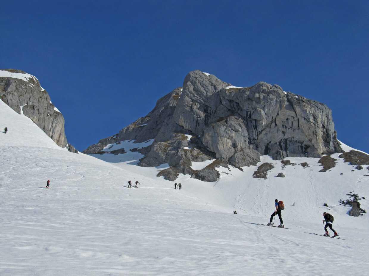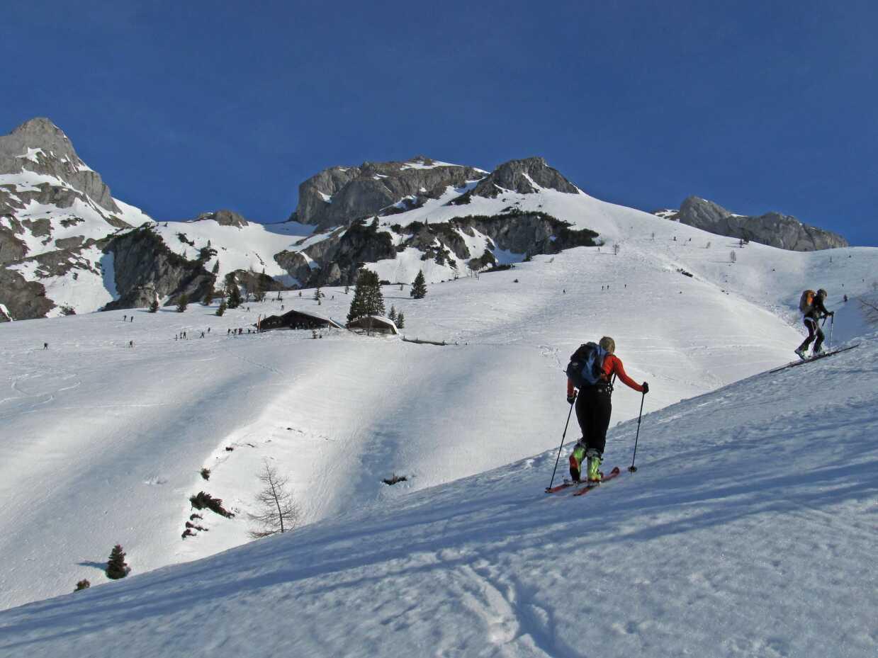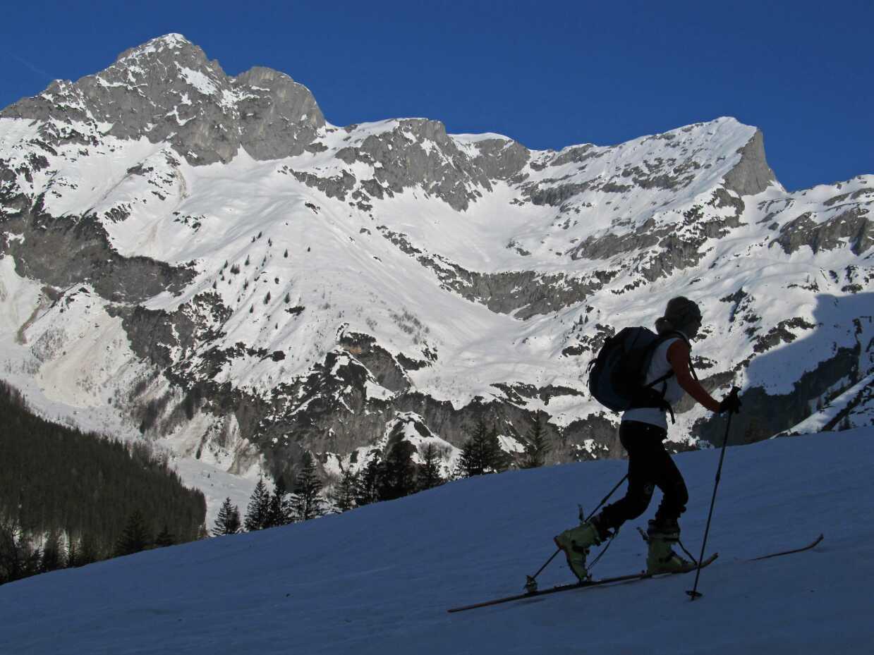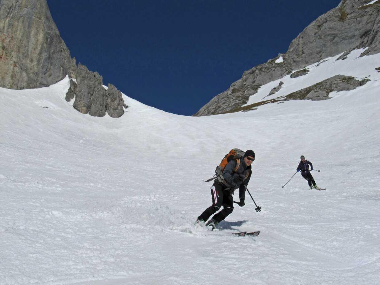 Schnee: Vom Tal weg in Massen vorhanden (im Tal >0,5m). Am Morgen tragender Harsch bis in die Sonne oberhalb der Hackelhütte, dann schon weich und gut ohne Harscheisen gehbar. Abfahrt um ca. 11:30, alles schön aufgefirnt, im unteren Teil rein südseitig schon etwas tief aber durchwegs gut fahrbar.