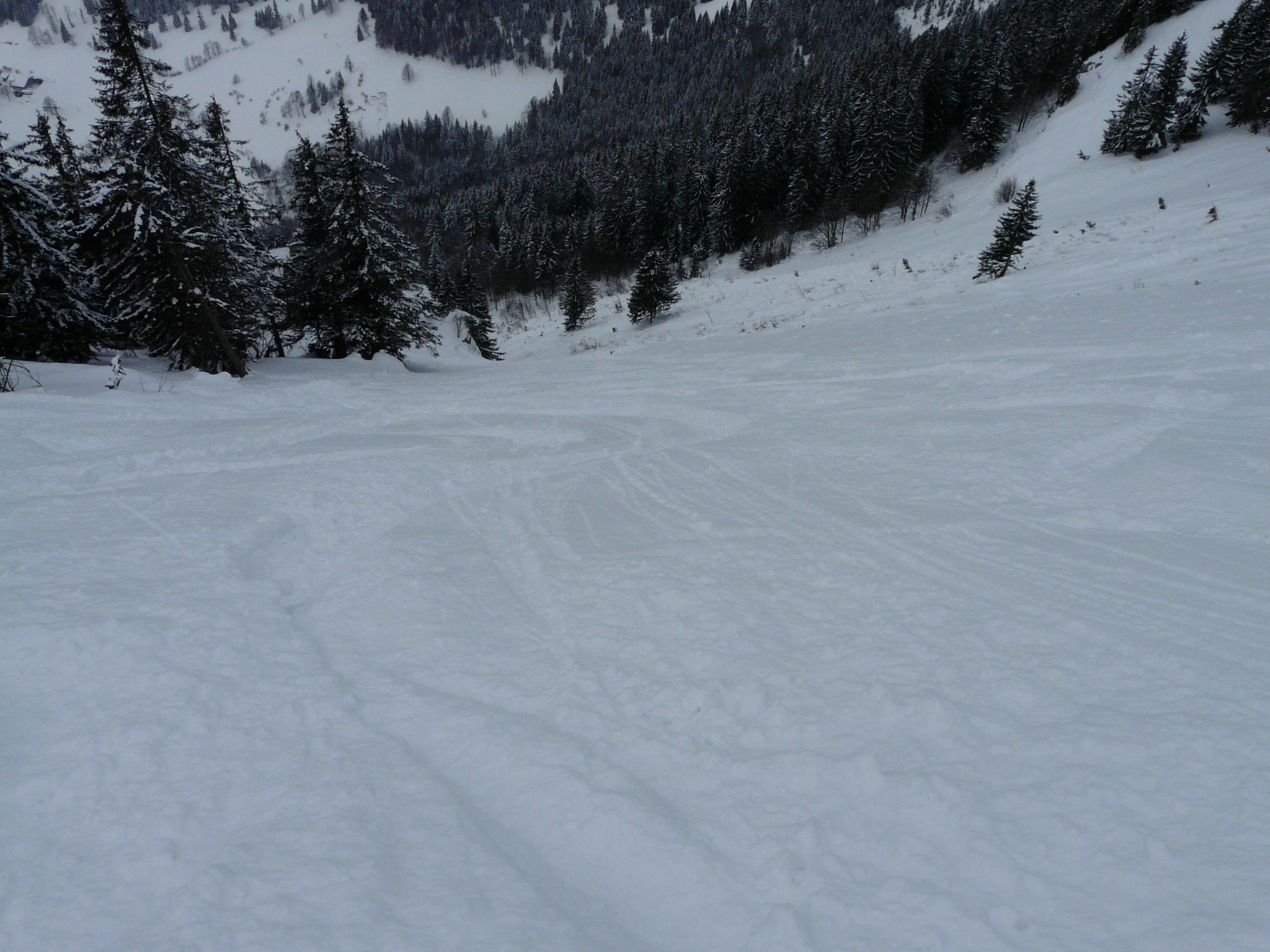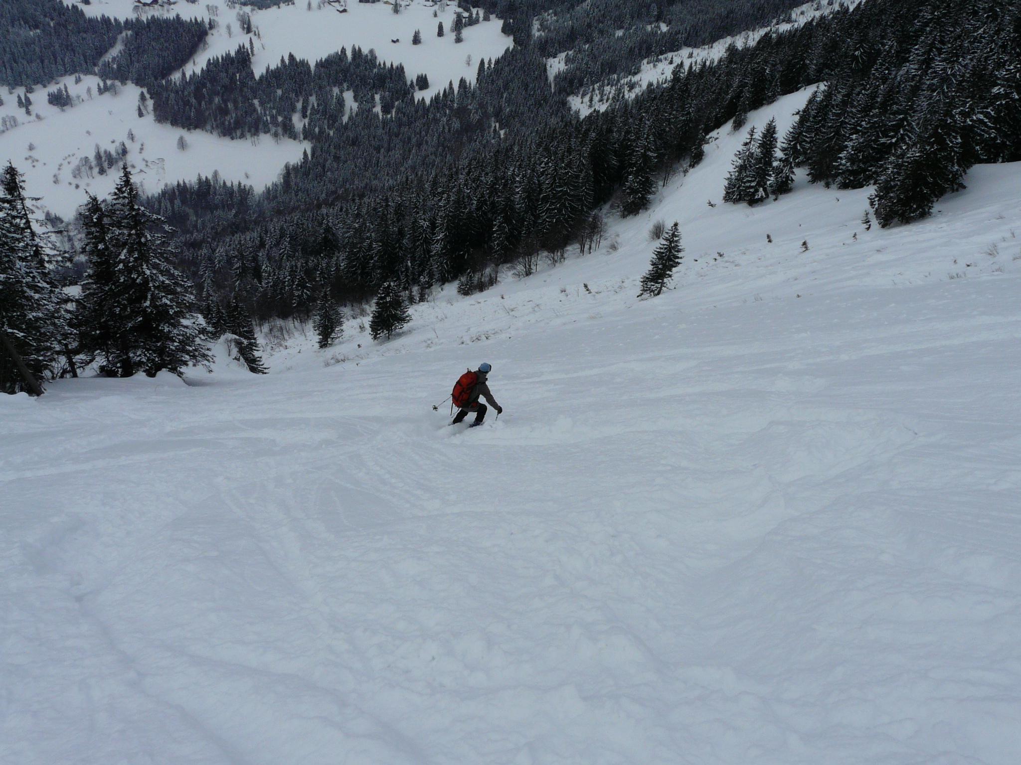 Abfahrt durch die Schlenkenrinne ca. 30 cm lockerer Pulver auf festem Altschnee ohne Windeinfluß.