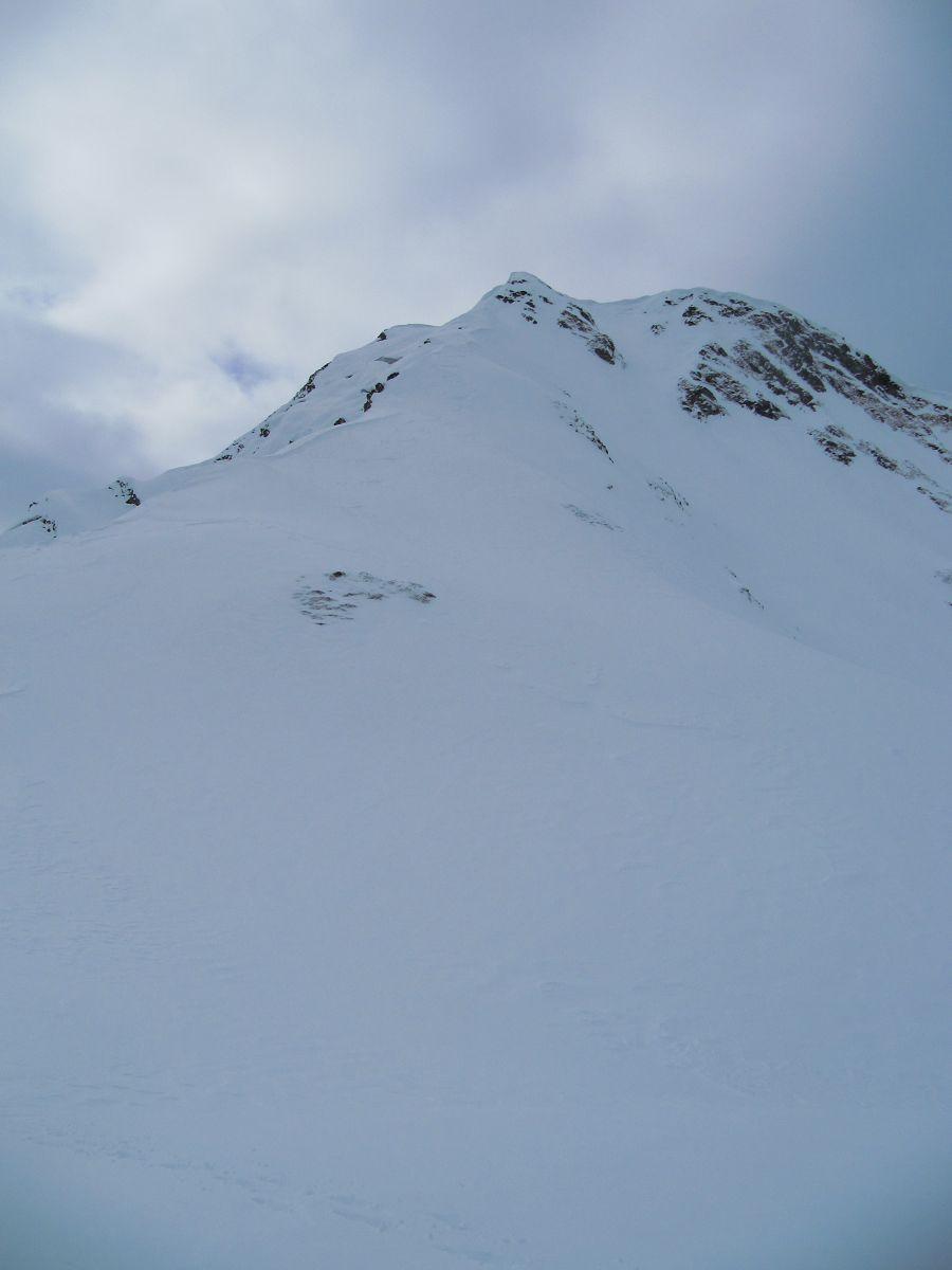 Auf den Roßkopf verzichteten wir, er war aper, abgeblasen. Am Baukogel war am ca. 40 Grad steilen Ostgrat eine Abfahrtsspur zu erkennen, ein Aufstieg aber wegen der Wechten eher grenzwertig. Auf dem Übersichtsfoto von Gegenüber (Anthaupten, 2.2.2011) erscheint der Anstieg recht steil!