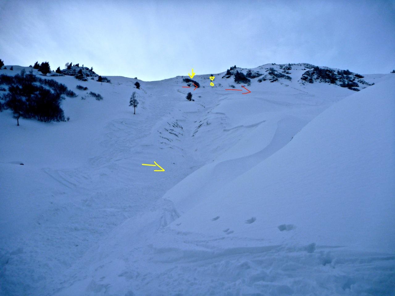Irgendwie muss ich aber dann doch eine Lawine ausgelöst haben, denn plötzlich wurde ich in die schmale Rinne gezogen, in die ich nie eingefahren wäre. Dann brachen von beiden Seiten der Rinne Einwehungen ein und ich wurde voll erwischt, hatte keine Chance. Größtenteils war ich unter den Schneemassen, hatte sogar Schnee im Mund, mein Airbag ging wegen eines Defektes nicht auf. Nur durch viel viel Glück kam ich an der Oberfläche der Lawine nach geschätzten 100-150hm zu liegen, ohne Handschuhe und Skistöcke, aber unversehrt. Ich grub meine Beine und mein Ski aus, machte Fotos und gab den beiden nachfolgenden Skifahrern, mit denen ich ja fast zeitgleich unterwegs war, zu verstehen, was passiert war. Die beiden sind den Hang links der Rinne heruntergefahren, haben nichts mitbekommen und hätten mich nie und nimmer gesucht oder sich gefragt, wo denn der Skifahrer hin sei. Weiters boten sie mir auch keine Hilfe an, obwohl ich ihnen mitteilte, dass ich ohne Stöcke nicht wie geplant zum Grinnköpfl aufsteigen konnte, um zurück zu meinem Auto zu gelangen. "Ihr Auto sei voll besetzt", dann fuhren sie ab, machten sich keine Gedanken wie ich runterkomme oder ob ich nach dem ersten Schreck vielleicht doch verletzt sei. Im Wirtshaus erzählten sie aber von dem Vorfall....(Freund erzählt). So viel Ignoranz macht mich echt immens wütend."