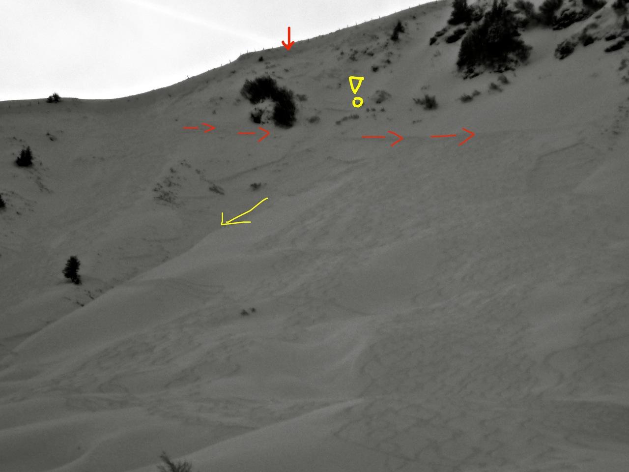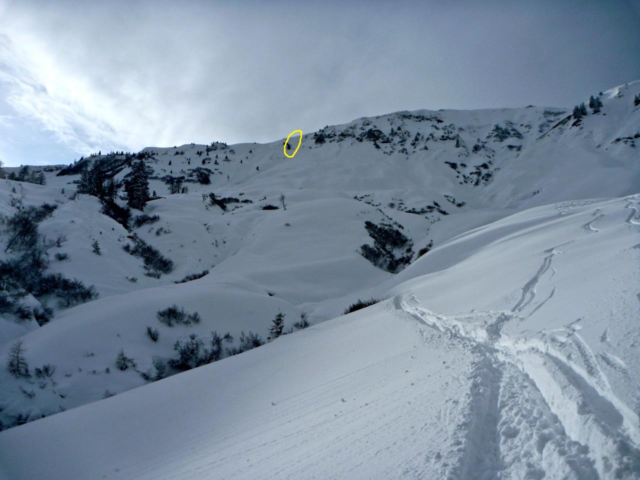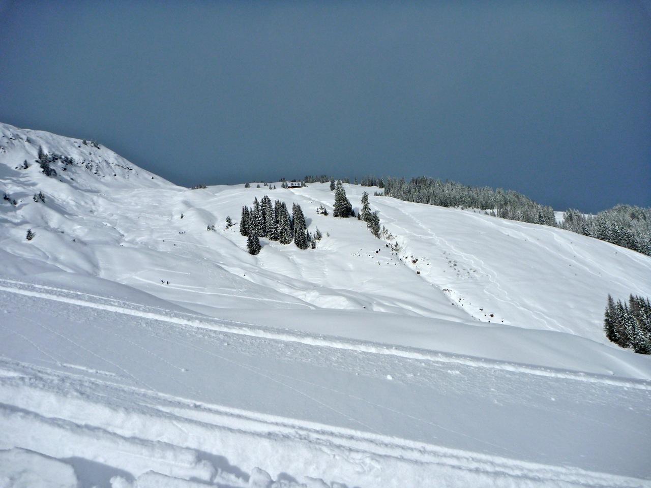 Dann fuhr ich zeitgleich mit 2 weiteren Tourengehern immer entlang des Rückens bis zur Schulter ab, an der ca. 10-12 Skifahrer zuvor in den Hang zur Reicheralm eingefahren waren. Ich überlegte zwar mehrmals, ob man nicht schon eher eine direktere Linie wählen könnte, glaubte jedoch, dass die Variante, wo alle anderen gefahren sind, die sicherere sei. Wenige Meter vor den Einfahrtsspuren fuhr ich dann in den Hang ein, machte 3 Schwünge und wollte dann den Querspuren nach rechts (von unten gesehen) in den schönen Hang folgen. Dabei hats ganz schön gestaubt, allerdings nicht mehr als bei 40cm Pulver normal ist.