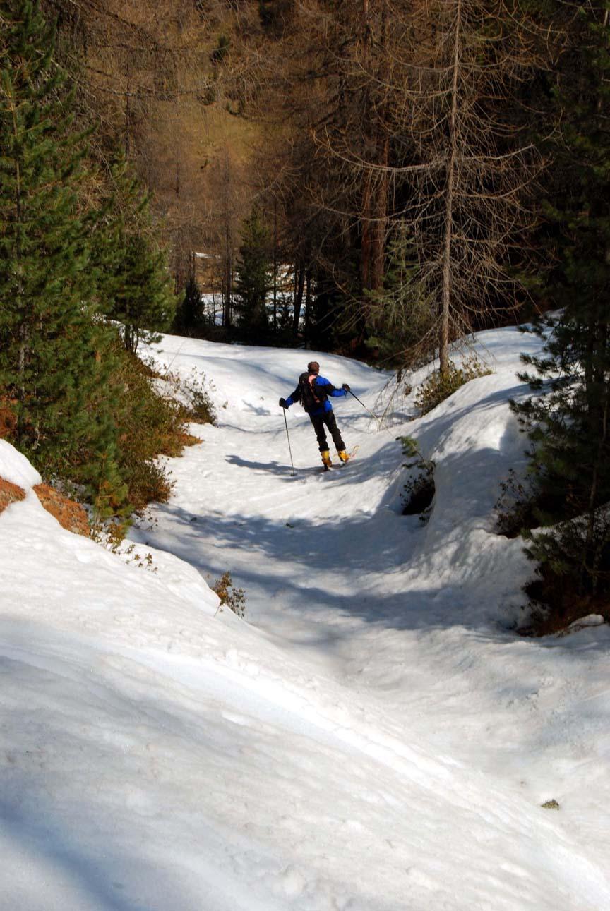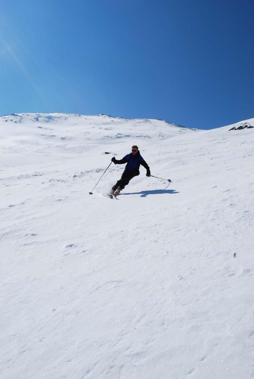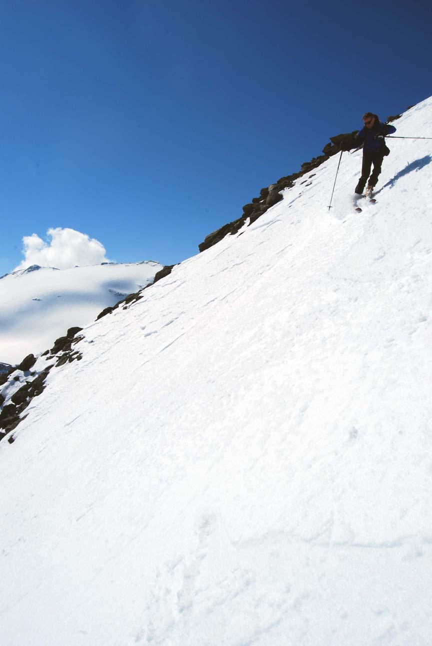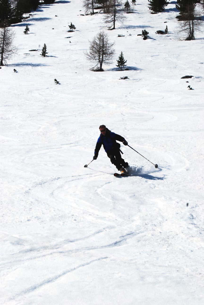 Die Schi mussten wir bis zur Melagalm ca. 25 Min. tragen. Ab der Alm geschlossene Schneedecke bis zum Gipfel. Wieder perfekter Firn bis zur Alm! Wir fuhren nicht über den Grat wieder zur Scharte ab sondern direkt über die sehr steile Gipfelflanke.