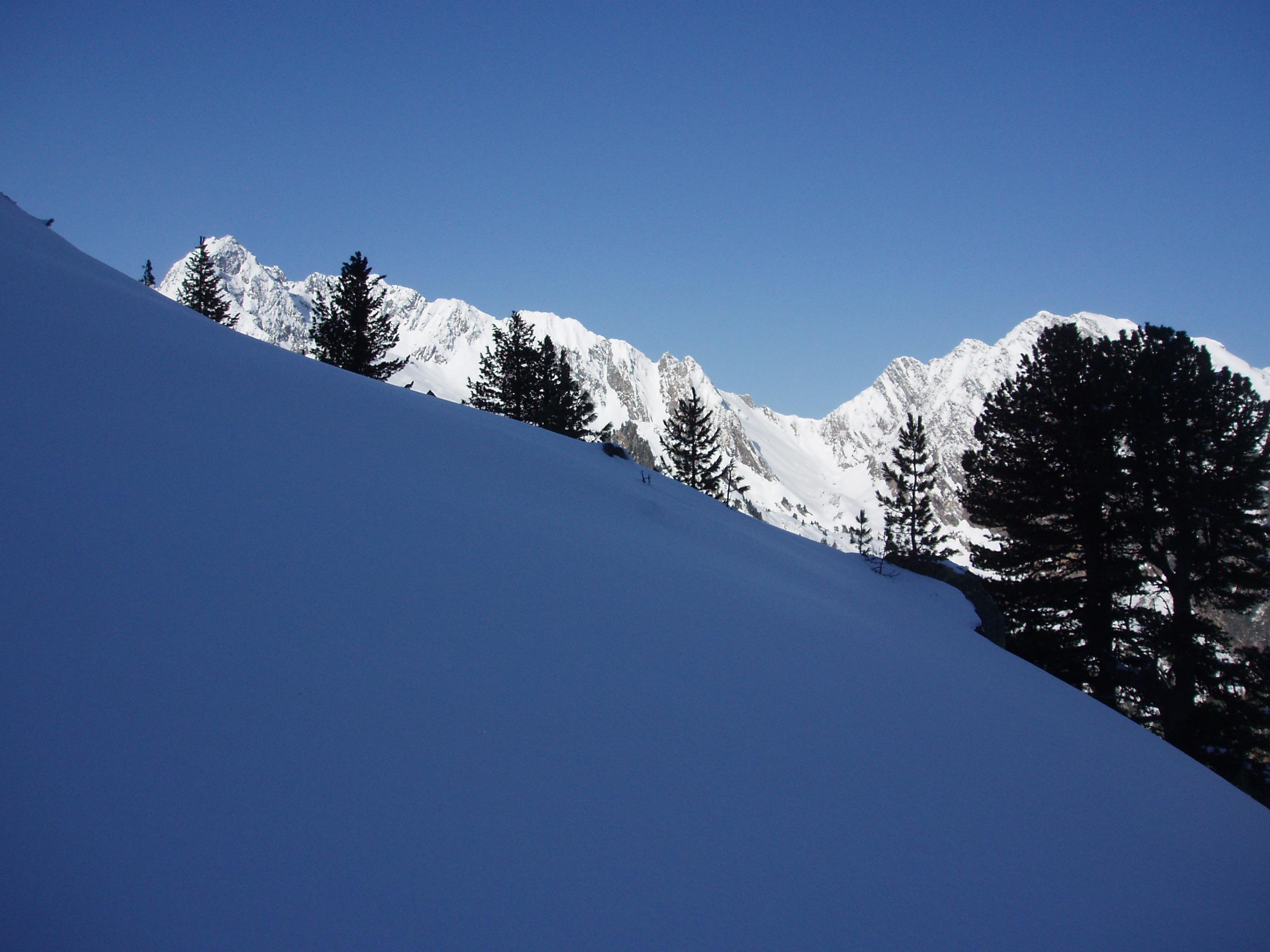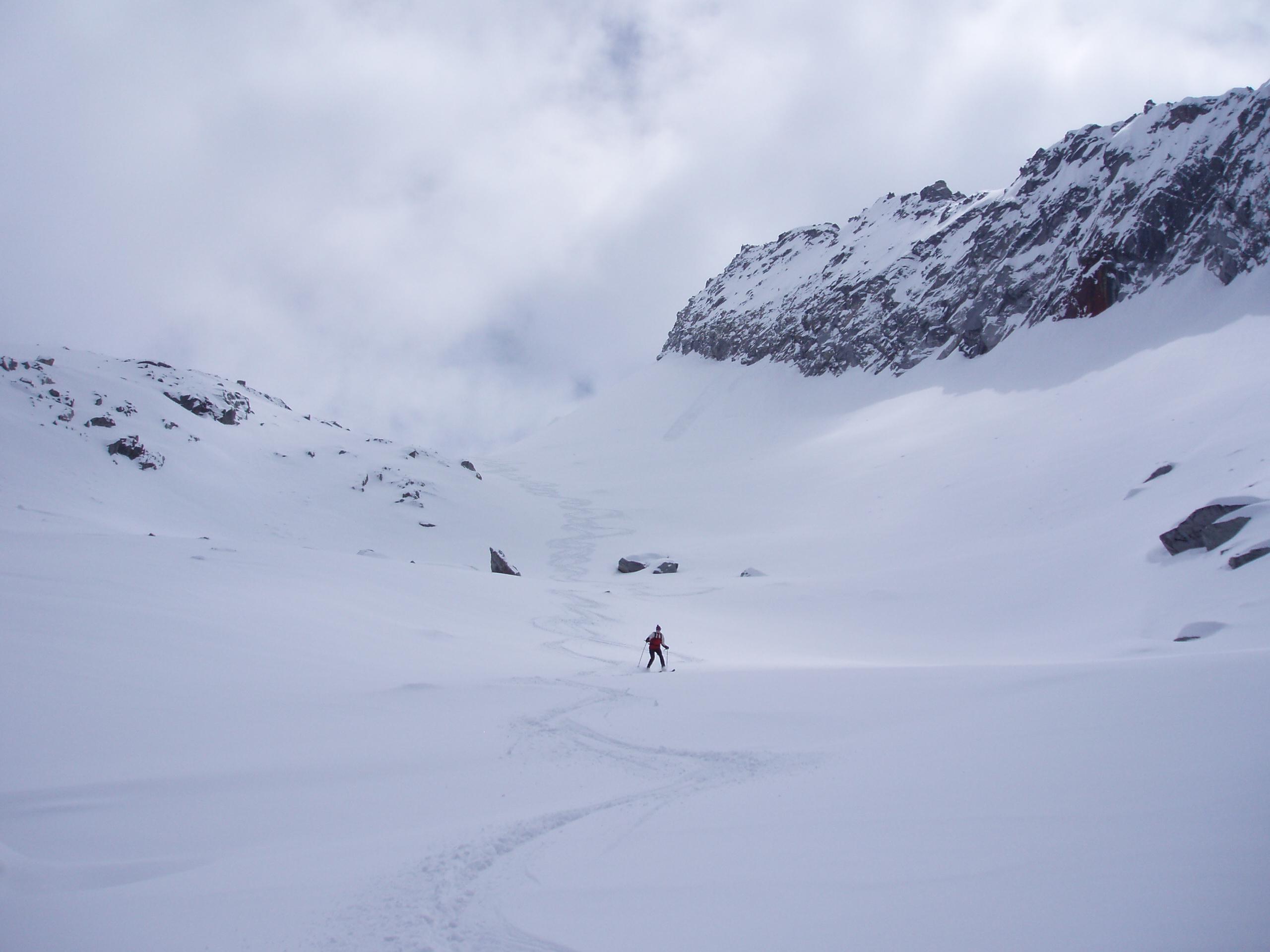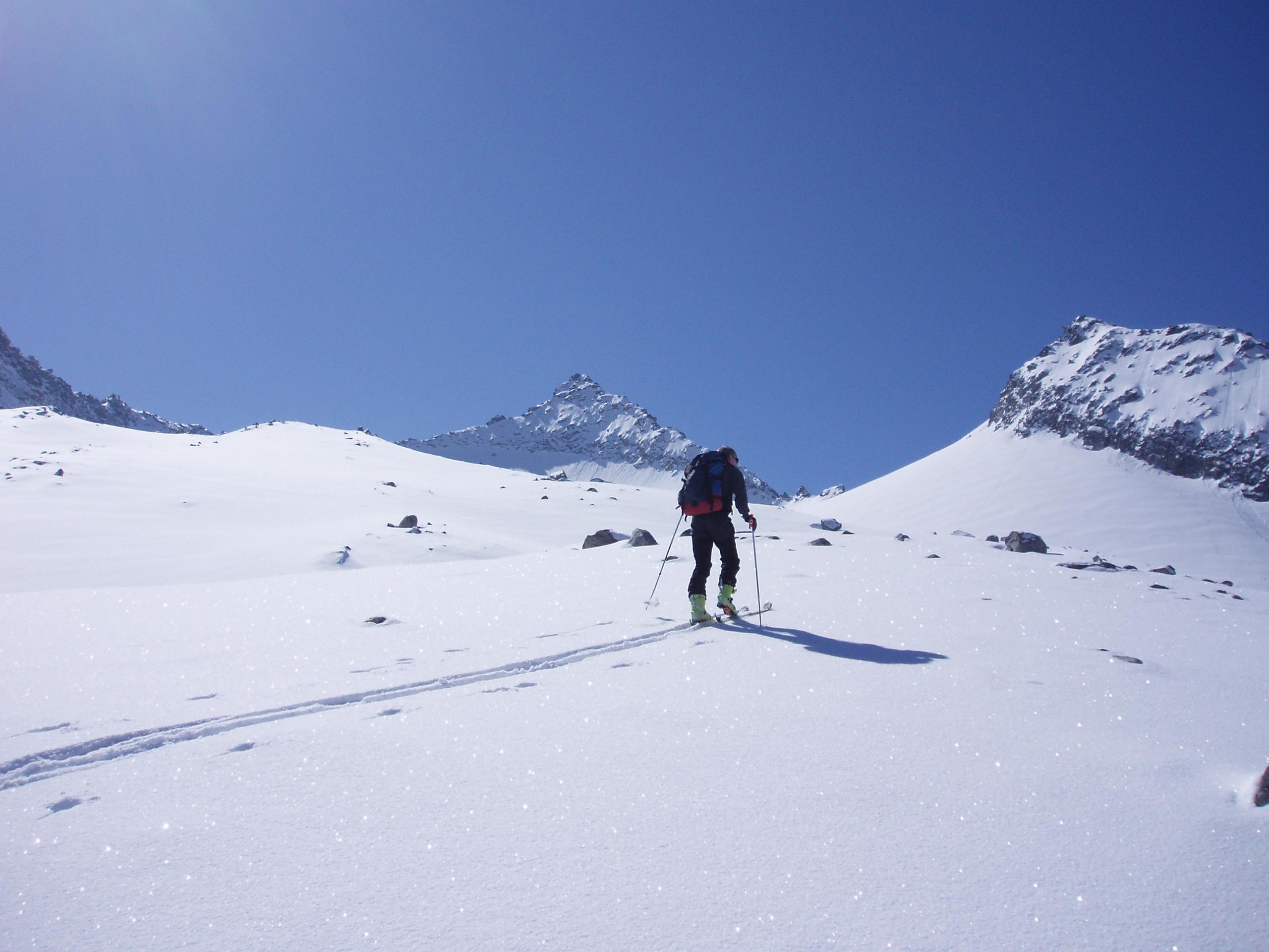 Dann wunderschöner Aufstieg durchs Wildkar, entlang dem Drisslkopf, auf das Wildkarkees und auf den NO-Grat der Wildkarspitze (bis auf ca. 2930m). Spuren im ca. 12 cm tiefen Pulverschnee.