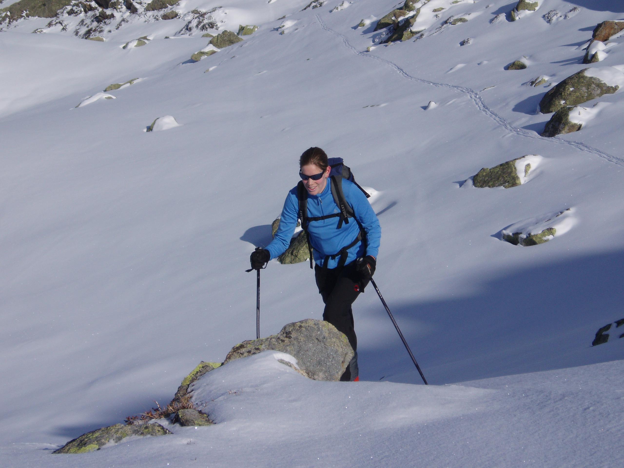 Bis hierher Ski getragen. Steig teilweise aper sonst ca. 10 cm Schneeauflage.